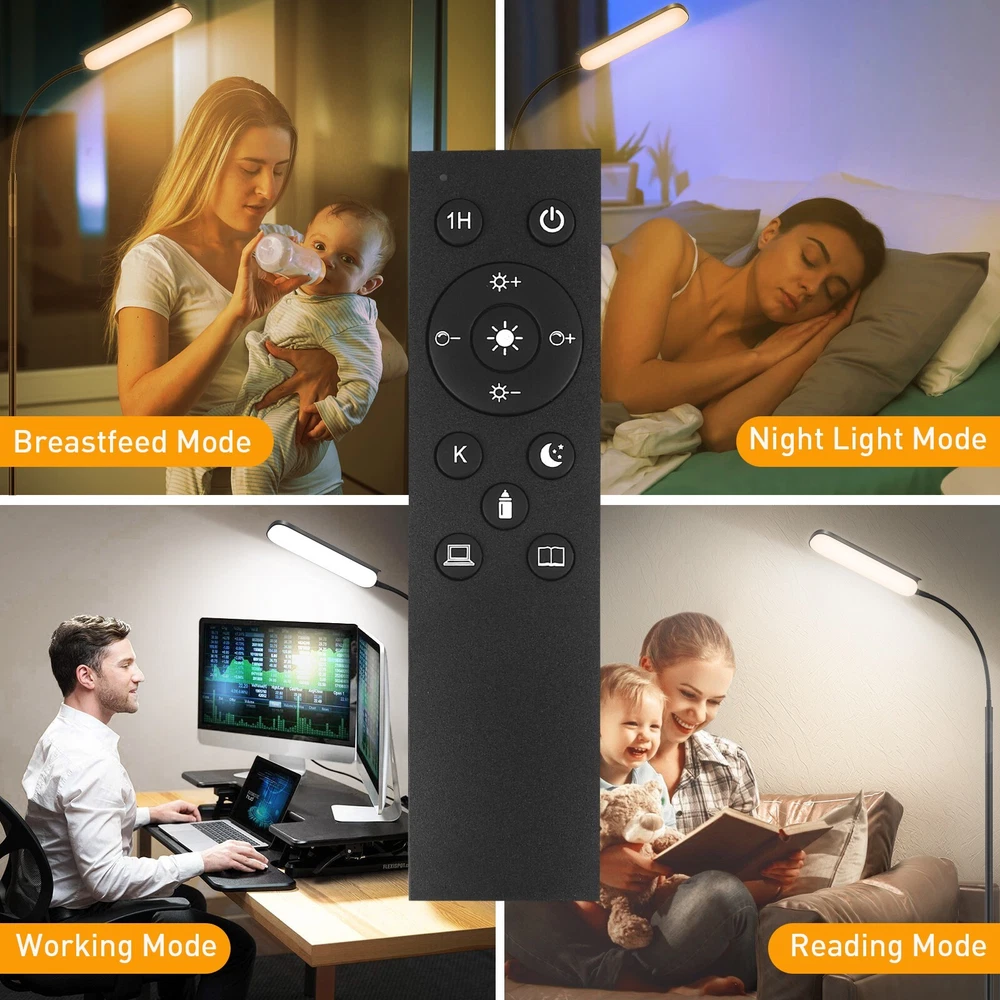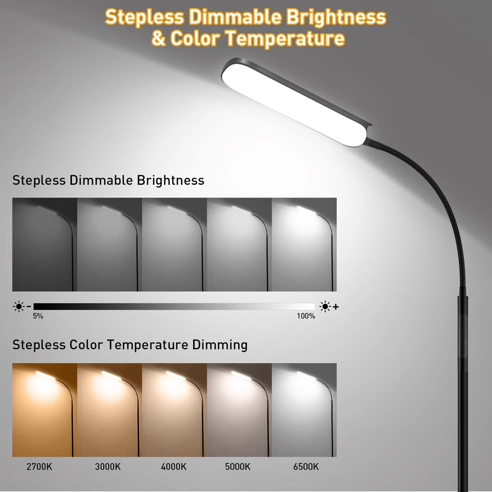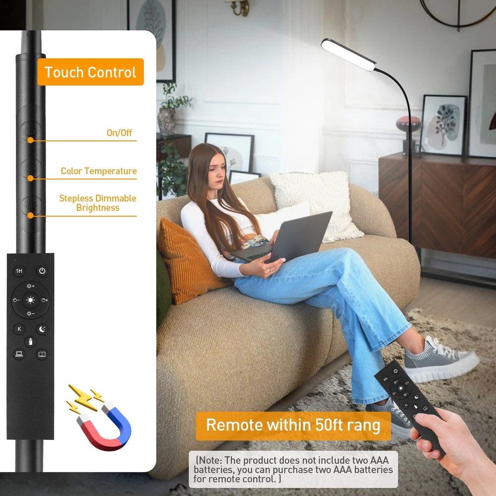 18W Upgrade Floor Lamp Different Color Temperature Options --- Meeting daily requirements ! Remote Control has a 50feet Range --- Easy to Use Product Features Flicker- Free Eye Protection Use Premium LED technology and equipped with a light guide plate, soft and natural light, no flicker. Easy to Install Installation is very easy and can be done in less than a minute, no other tools or parts required. Stable Base The stable base is designed to be safe and easy to use, even if the floor lamp is hit by a pet, there will be no problem. 360° Adjustable Lamp Head Unique lamp head shape and flexible gooseneck, perfectly satisfies your needs, and lights up every corner. 5 Mode Functions ---- Bright Up Your Life ! Enjoy Reading Time Best Present Choices Also be used as a Christmas present and birthday present for your family and friends!