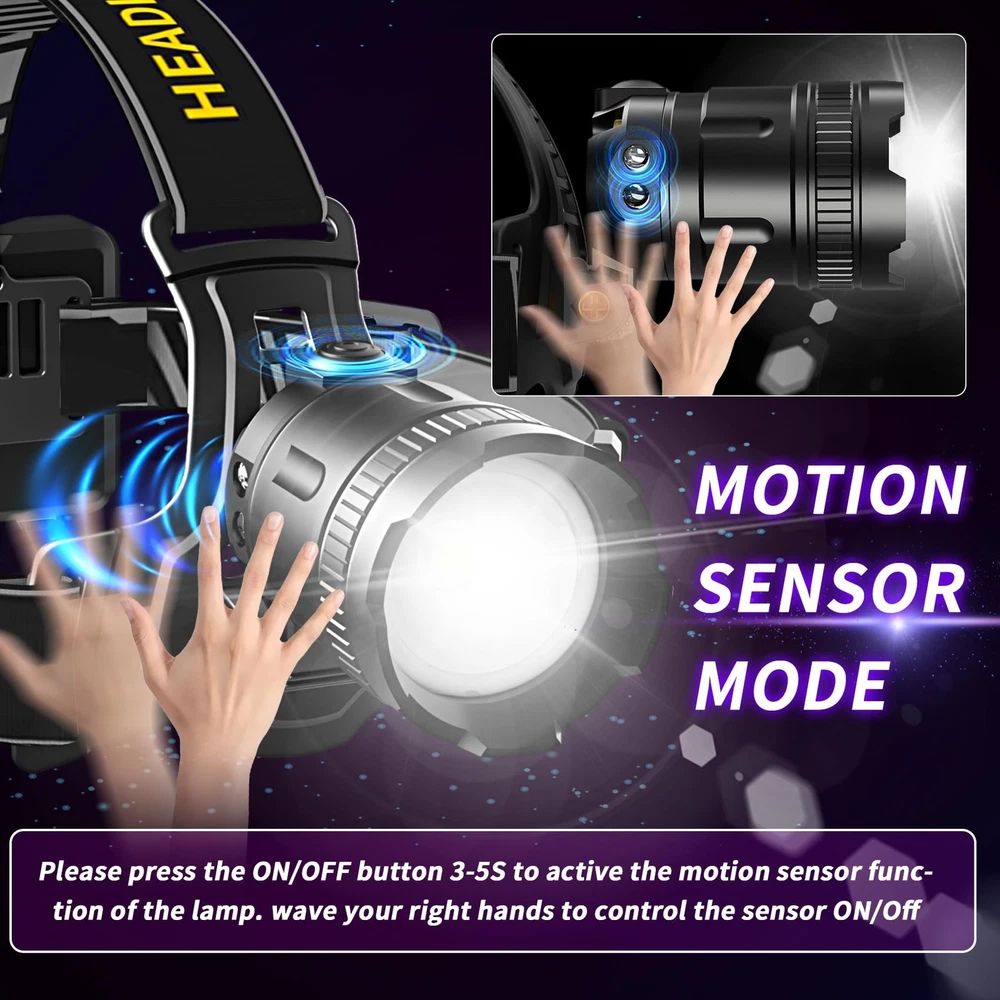 【Super Bright 100000 Lumens】 Illuminate your path with up to 100000 lumens of bright light from a 30W led headlamp, Distance max up to 500 meters/1640ft. illuminating even the darkest corners with ease, ensuring exceptional brightness and reliable performance, It can be used for a wide range of activities, including hiking, camping, fishing, caving, cycling, and various outdoor activities. 【Motion Sensing Headlamps】 Equipped with advanced motion sensors, Long press3-5S on/off switch to active the motion sensor function, Then wave your right hands to control the sensor on/off, providing convenient and efficient lighting whenever you need it.Perfect for situations where you need illumination but you need to use both hands to do your job. 【7 Lighting Modes Head Lamp】 This headlight offers a wide range of lighting options, including flood light modes (high, low, and strobe), spotlight modes (high, low, and strobe), sensor modes (long press on/off 3-5S), The backlight also have 2 modes: White light, red & blue flash light. Zoomable feature for precise lighting control. 【Upgrade Digital Display & Rechargeable Battery】 To quickly ascertain your current, the headlight's enhanced digital display indicates the remaining power, Equipped with large rechargeable battery capacity, they can continue work 8-12 hours as lower modes, this rechargeable headlamp offers a robust power supply for your outdoor activities. The high-capacity batteries ensure extended usage time, allowing you to focus on your activities without worrying about frequent battery changes. 【IPX6 Waterproof & Elastic Headband】: Designed to withstand extreme weather conditions, this headlamp is built to last. It can withstand lightning, heavy rain, snow, and high temperatures, ensuring normal lighting even in the harshest outdoor days.Designed with comfort in mind, the headlamp comes with an adjustable elastic headband. This headband offers a secure and comfortable fit, allowing you to wear it for extended periods without any discomfort 【90° Adjustable & Ergonomic Design】With its 90° adjustable angle feature, this headlamp allows you to direct the light exactly where you need it. The headlamp's ergonomic design ensures a flush fit on the forehead, providing optimal comfort during prolonged use. Don't worried to headaches or pressure points caused by poorly designed headlamps. you can easily adjust the angle for the perfect lighting position. 【3 Charge Port & Upgraded Aluminum Headlamp】2 charge input and 1 charge output choice, If you're on the go and don't have access to a traditional power source, you can utilize the power bank mode,Head lamp is meticulously crafted with an upgraded design featuring aviation aluminum material. The use of this premium material enhances the overall durability and structural integrity of the headlamp, ensuring it can withstand the demands of your outdoor activities. 【Excellent After-Sales Team】: You will receive the 1X Rechargeable Headlamp, 1X USB Cable, Our LED headlamp with 2-year replacement service and 7*24 hours customer service. If you have any problem with the rechargeable headlamp you received, please contact us and our team will find the best solution for your problem!
