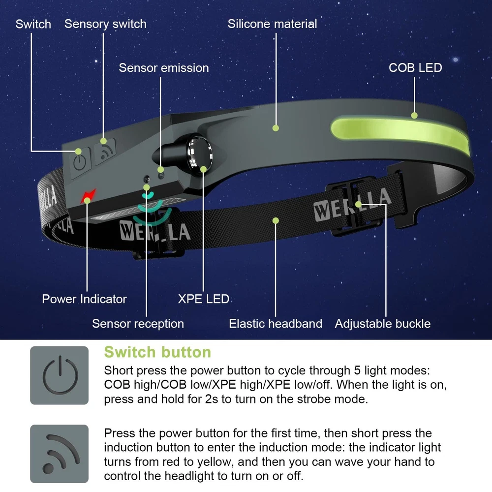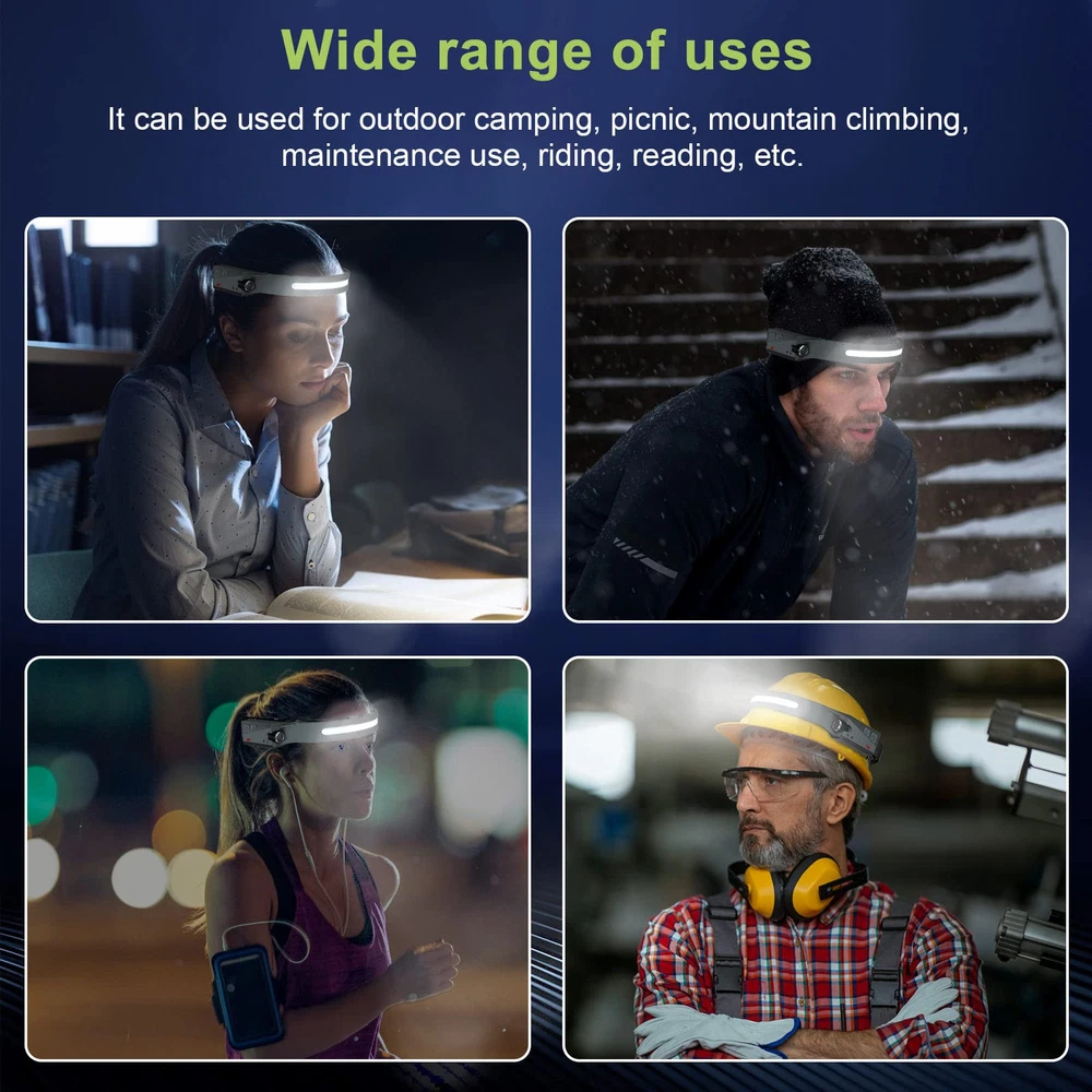 【Bright 230° Wide Beam & Spotlight】Offers high bright COB and XPE spotlights source, this led headlamp rechargeable have an excellent vision at night for walking, running and biking. Without moving your head, illuminate front the desired area with a wider range, to meet the needs of your different scenarios, such as camping, running, cycling, work and maintenance. 【5 Light Modes & Motion Sensor】The headlamps for adults rechargeable has 5 Light Modes, XPE LED: high (100%)/low (40%), COB: high (100%)/low (40%), Strobe: Press and hold mode; Using motion sensor design, you can easily control the headlight even when wearing gloves. When the light is on, short press the sensor key to make it enter the sensor mode (the indicator light changes from red to yellow), and then wave your hand within 10cm before receiving the sensor. Lights on/off. 【ADJUSTABLE COMFORTABLE WEAR】The head flashlight for adults fits all adult head sizes, consists of soft silicone and an adjustable elastic headband, and weighs only 2.47 ounces, even if you wear it all day, you won't feel it. It provides optimal comfort to your head. IPX4 water resistance means it's protected from splashes from all angles, so you don't need to worry if it rains or snows suddenly. 【USB-C convenient charging and long-term use】The head lights led is equipped with a USB-C rechargeable lithium battery and a Type-C USB input port, which can be fully charged for 2 hours. Working time is 3-8 hours in different light modes. If you need to illuminate for a long time, it is recommended to carry two at a time for emergencies. 【Perfect after-sales guarantee】Our outdoor running headlamp have undergone repeated tests and market research to meet the needs of different scenarios, such as outdoor running, mountain climbing, work and maintenance, and have been liked by the market and many customers. We have zero tolerance for quality. If you are not satisfied with the purchased product, please notify us immediately and we will refund you.