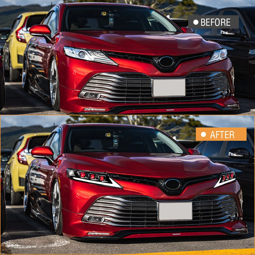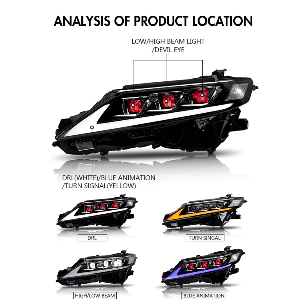 LED Headlights For Toyota Camry 2018-2023 6 Lens Devil Eyes Blue Animation DRL Fitment: Fits for Toyota Camry 2018 - 2023, FOR 8th Gen Toyota Camry Unsure? Contact us with your model year & headlight photos. Product Specs: Condition: 100% brand new. Installation: Plug and play. Bulbs: All LEDs are pre-built. No extra bulbs needed or possible to replace. Warranty:One Year Start-up:Several Seconds of Animation Lights Source:LED Lens Color:Clear Full LED with sequential turn signal Direct Fit Replacement Fuction: Daytime Running Lights Sequential Turn Signal High/Low Beam Package Including: 1 Pair of Headlights (Driver and Passenger Sides) Note: 1.Please confirm whether this car-lamps can fit your car before you purchase, if you are not sure, please contact us. 2.Using your factory supplied connector/harness will avoid cutting or modifying any wires. 3.Benefits of LED making you safer on the road for other road users to see. 4.Professional installation recommended for optimal performance Customer Support: 24/7 Support - Questions answered within 24 hours (except weekends/holidays) 1-Year Quality Guarantee - Contact us immediately for any issues On Nov 30, 2025 at 23:43:24 PST, seller added the following information: