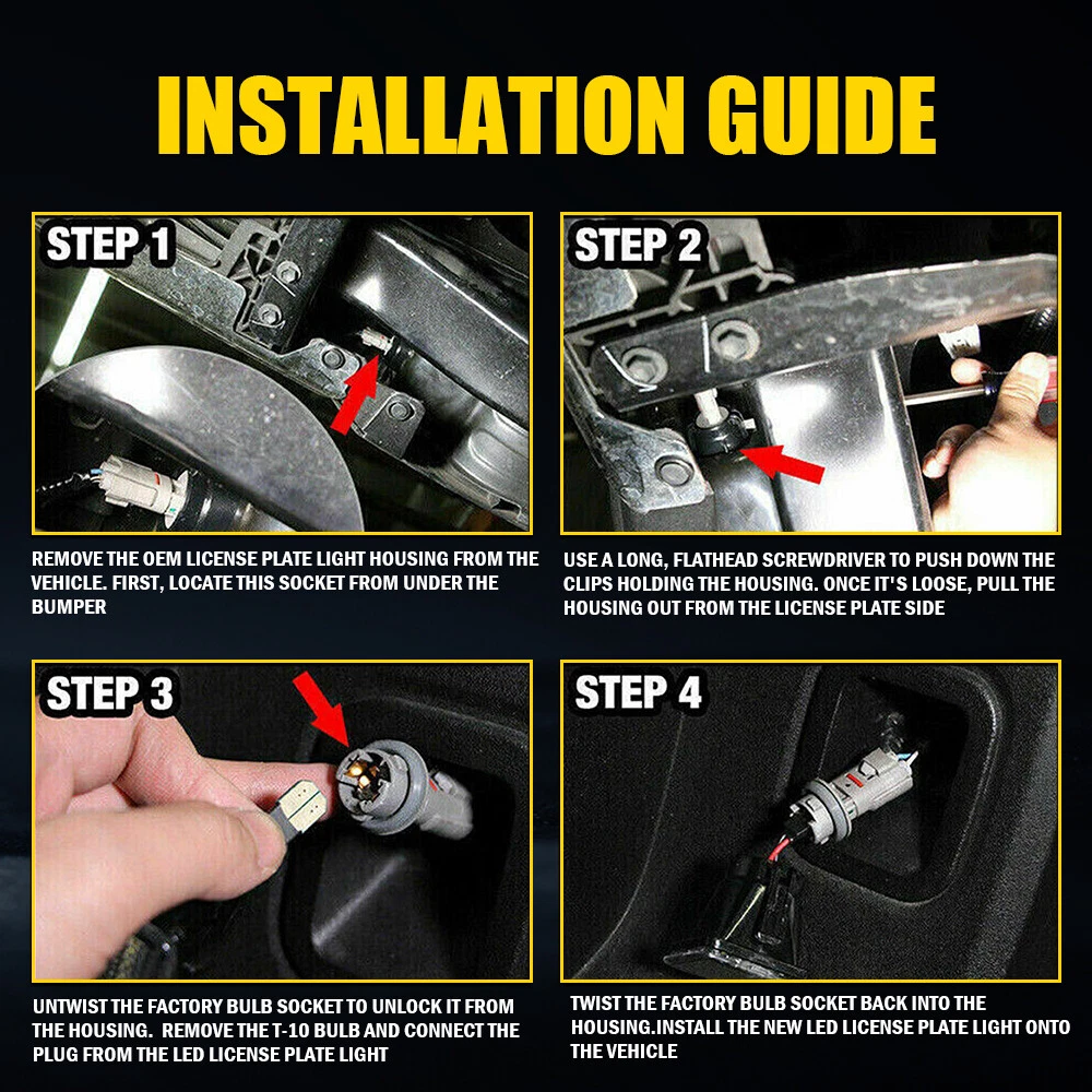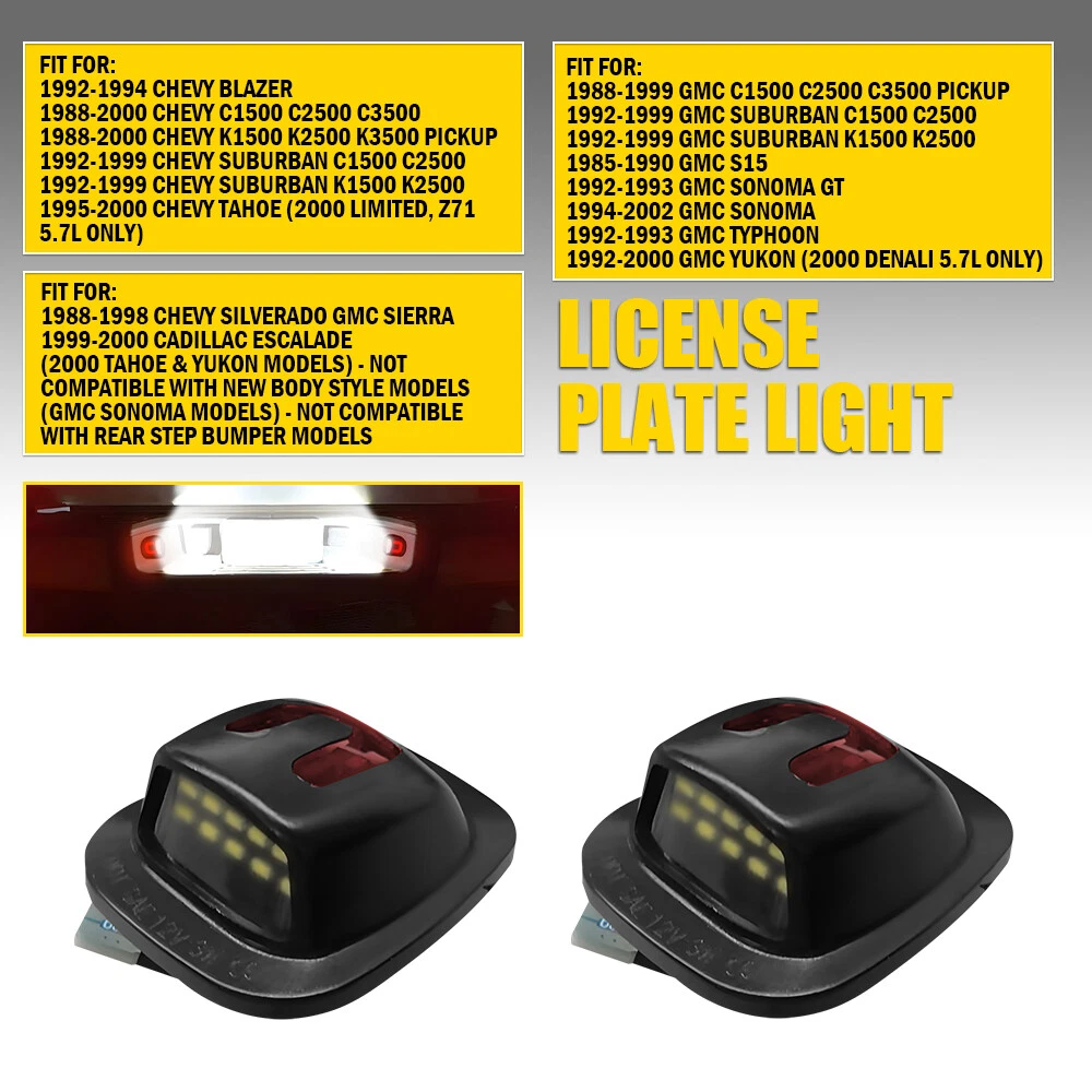 Fit for: 1992-1994 Chevy Blazer 1988-2000 Chevy C1500 C2500 C3500 1988-2000 Chevy K1500 K2500 K3500 Pickup 1992-1999 Chevy Suburban C1500 C2500 1992-1999 Chevy Suburban K1500 K2500 1995-2000 Chevy Tahoe (2000 Limited, Z71 5.7L Only) 1988-1999 GMC C1500 C2500 C3500 Pickup 1992-1999 GMC Suburban C1500 C2500 1992-1999 GMC Suburban K1500 K2500 1985-1990 GMC S15 1992-1993 GMC Sonoma GT 1994-2002 GMC Sonoma 1992-1993 GMC Typhoon 1992-2000 GMC Yukon (2000 Denali 5.7L Only) 1988-1998 Chevy Silverado GMC Sierra 1999-2000 Cadillac Escalade LED License Plate Lights For 1992-2000 Chevy GMC C/K Blazer Tahoe Suburban Yukon Fit for: 1992-1994 Chevy Blazer 1988-2000 Chevy C1500 C2500 C3500 1988-2000 Chevy K1500 K2500 K3500 Pickup 1992-1999 Chevy Suburban C1500 C2500 1992-1999 Chevy Suburban K1500 K2500 1995-2000 Chevy Tahoe (2000 Limited, Z71 5.7L Only) 1988-1999 GMC C1500 C2500 C3500 Pickup 1992-1999 GMC Suburban C1500 C2500 1992-1999 GMC Suburban K1500 K2500 1985-1990 GMC S15 1992-1993 GMC Sonoma GT 1994-2002 GMC Sonoma 1992-1993 GMC Typhoon 1992-2000 GMC Yukon (2000 Denali 5.7L Only) 1988-1998 Chevy Silverado GMC Sierra 1999-2000 Cadillac Escalade (2000 Tahoe & Yukon Models) - Not Compatible with New Body Style Models (GMC Sonoma Models) - Not Compatible with Rear Step Bumper Models Specifications: OE Number: 918399, 916438, 68181, 68155 Light Housing Color: Black Light Color: White light+U-shaped red light Waterproof Grade: IP67 Service Life: 50,000h+ Features: *High Brightness Our license plate lights with high brightness will enhance safety and give your car a modern and luxurious appearance. *Direct Replacement Direct replacement from stock application. Other modifications are not required. *Long Service Life Lower energy consumption with a long service life (more than 50,000 hours). *Perfect Fit Manufactured according to originals for a perfect match with your car. *100% Brand New Packaging Type: Cardboard box Packaging Include: License Plate Light*2 Item Specifics Manufacturer Warranty 2 Years Brand AUXITO Light Housing Color Black Light Color White light,U-shaped red light Waterproof Grade IP67 Service Life 50,000h+ Lighting Technology LED Type LED License Plate Light OE/OEM Part Number 918399, 916438, 68181, 68155 Packaging Type Cardboard box Packaging Include License Plate Light*2 Features 1 High Brightness Features 2 Direct Replacement Features 3 Long Service Life Features 4 Perfect Fit Suitable For For Chevy C/K Blazer GMC C1500 Cadillac Escalade Fit For 1 1992-1994 Chevy Blazer Fit For 2 1988-2000 Chevy C1500 C2500 C3500 Fit For 3 1988-2000 Chevy K1500 K2500 K3500 Pickup Fit For 4 1992-1999 Chevy Suburban C1500 C2500 Fit For 5 1992-1999 Chevy Suburban K1500 K2500 Fit For 6 1995-2000 Chevy Tahoe Fit For 7 1988-1999 GMC C1500 C2500 C3500 Pickup Fit For 8 1992-1999 GMC Suburban C1500 C2500 Fit For 9 1992-1999 GMC Suburban K1500 K2500 Fit For 10 1985-1990 GMC S15 Fit For 11 1992-1993 GMC Sonoma GT Fit For 12 1994-2002 GMC Sonoma Fit For 13 1992-1993 GMC Typhoon Fit For 14 1992-2000 GMC Yukon (2000 Denali 5.7L Only) Fit For 15 1988-1998 Chevy Silverado GMC Sierra Fit For 16 1999-2000 Cadillac Escalade Fit For 17 (2000 Tahoe & Yukon Models) Fit For 18 (GMC Sonoma Models) FAQ ♥ If you have a decoding problem or any other problems, please contact us first, we will help you with it. We will reply you within 24 hours in working days. I'm a new seller, thanks a lot for your trust and convince! I will serve you with all my heart. ♥ Q1: Will this bulb fit my vehicle? A: We can match almost any vehicle to one of our bulb sizes. eBay only lets us include some vehicle fitments per listing, but if your vehicle does not show up on the compatibility table at the top of our listings, welcome you to contact us for free consulation before purchasing a product. Q2: My item has not arrived, what's taking so long? A: Sometimes items take longer than expected, especially if it’s going far or to rural area. Check with your post office to see if your item has been held up. Sometimes Royal Mail will not update a tracking number until it has arrived at its destination. If your item still don't arrive after a few days, let us know so we can double check for you and help solve it asap. Q3: My bulbs won't fit, help! A: Special bulb holder may be required. See if you can take the holder from the stock bulb. If not, let us know. The bulb size may be wrong, double check the item you received with the item you ordered. Do you have an aftermarket lighting housing? These may not be perfectly fitted for aftermarket bulbs and will require some manual modifications. Q4: Neither side lighting up? Both sides flicker, hyper flash, or work inconsistantly. A:Check the light fuses, and then check the ballast plugs to insure correct installation. If this doesn't work, there may be a voltage problem with the vehicle. You probably just need a relay or capacitor. Even though some bulbs are builtin resistors, they may still need a decoder. Pay & Ship (1). We gladly accepts payment via PayPal, We will ship your item(s) within 24 hours. (2). Before payment, please keep the consistency of Paypal address and ebay address. (3). Quantity orders are welcome! Returns (1). We offer 60 days free return policy. Please contact us within 60 days from the date you receive your order if you have any issues with the product or want return. Refund will be send after we got your resend package. (2). All returned items should be in the original packaging , return tracking information should be provided . Contact Us (1).Negative feedback will not help resolve any problems you have, please contact us via eBay messages before leaving negative feedback , our customer service will make best effort to help you with the issues. (2).We maintain high standards of excellenceand strive for 100% customer satisfaction! Feedback is very important to us. We request that you contact us immediately before you give us neutral or negative feedback, so that we can satisfac