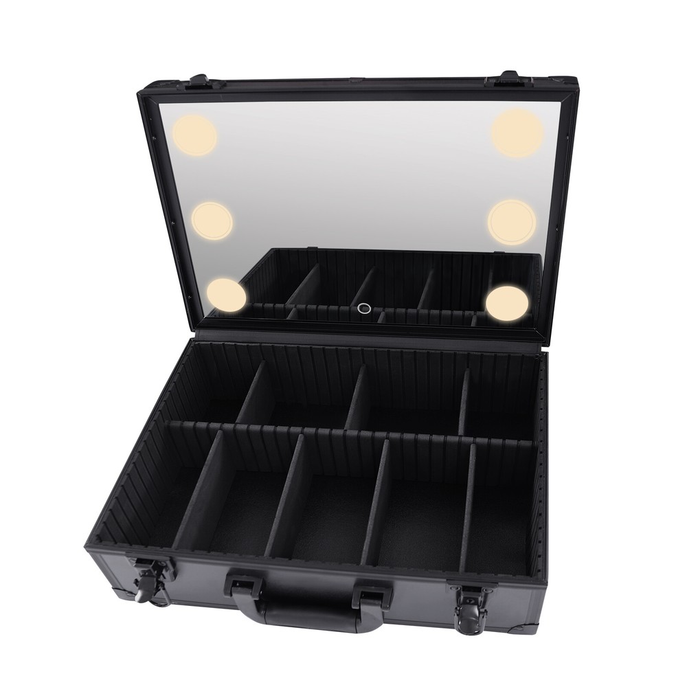 Makeup Bag with Mirror LED Light Travel Makeup Case Cosmetic Box Organizer Black Large Makeup Train Case Jewelry Box Cosmetic Artist Organizer w/ Light & Mirror Description As a qualified professional makeup case maker, we not only consider its beauty but also a lot of details for consumers. We go out to do makeup without a mirror and the cosmetics are not convenient to carry, so we designed a product that integrates makeup storage and an intelligent makeup mirror. Come check our products out! Key Features High-quality Materials: This product is made of high-quality PVC and aluminum alloy, which is strong, durable, and not easy to deform. The PVC material is fireproof . Beautiful Appearance: The black color, as well as the classic design, makes it look beautiful. Adjustable Color and Brightness: You can adjust the cold light, warm light, and natural light as well as the infinite brightness through the touch screen switch on the mirror to meet your preferences and needs. Large Storage Space: The size of this product is 16.5*11.8*5.9inch and it comes with adjustable dividers, allowing you to customize the layout to place your makeup essentials. Meanwhile, the compartment bag can hold a lot of cosmetic brushes, eyeliners, eyebrow pencils, etc. High Safety: The built-in charge protection system automatically limits current when fully charged, so you don't have to worry about overcharging. You can also use the light while charging it. Long Endurance: The battery has a capacity of 2000mAh and can last for 3-5 hours on a full charge, making this product suitable for outdoor use without frequent charging. Strong Load-bearing Capacity: The thickened materials and rectangular structure make it have a strong load-bearing capacity of 7kg/15lbs, so you can feel free to put most of your cosmetics on your business trip or travel. Convenient to Carry: The size of this product is 16.5*11.8*5.9inch and it only weighs 3kg/6.6lbs, so it's lightweight and compact. Meanwhile, the top handle makes it easy for you to carry. A Good Gift: The beautiful appearance and good practicality make it a good gift for professional makeup artists, beauty masters, and traveler lovers. Easy to Clean: The surface of this product is smooth and flat, which is easy to clean. You just need to wipe it with a wet rag. Guaranteed Customer Service: We aim to provide quality products and services. If you have problems, please feel free to contact us. We will reply and solve the problem for you as soon as possible. Details USB Slot: It comes with a USB slot, so you can charge it using a charger and mobile power supply. It's perfect for makeup artists to use outdoors. LED Light: The 6 LED lights on the mirror can enhance the view and make your makeup clearer. Meanwhile, LED light can save you a lot of electricity. The soft light transition technique makes the lighting very uniform. Indicator Light: The indicator light turns red when the product is charging and turns green when being fully charged, allowing you to better observe the condition of the product. Detachable Partition: You can adjust the position of the partition according to the volume and shape of the cosmetics, keeping the cosmetics in order at all times. Application It is suitable for storing cosmetics, jewelry, electronic accessories, essential oil, toiletries, shaving kit, and valuable objects in homes, hotels, beauty salons, etc. The Led lights can be applied in low-light environments. Specification Color: Black Material: PVC, Aluminum Alloy Shape: Rectangular Style: Modern Numbers of Compartments: 9 Load-bearing Capacity: 7kg/15lbs Type: Portable Light Source: LED Light Number of LED Lights: 6 Fully Charged Time: 3-5h Light Colors: Cold Light, Warm Light, Natural Light Power Type: Plug-in, Built-in Lithium Battery, Mobile Power Supply Battery Capacity: 2000mAh Color Temperature: 3500K. 4600K, 6500K Brightness: Infinitely Adjustable Operate Mode: Touchscreen Net Weight: 3kg/6.6lbs Gross Weight: 3.2kg/7.05lbs Package Size: 40.6*31.8*20cm/15.9*12.5*7.8inch Product Size: 42*30*15cm/16.5*11.8*5.9inch Mirror Size: 39*27cm/15.4*10.6inch Package Included 1* Makeup Case 1* Compartment Bag 1* Power Cord Notes Please allow the slight color difference caused by the shooting light and 1-3cm error due to manual measurement, and make sure you do not mind before ordering. Payment Delivery details Terms of sales About us Contact us Payment We accept ebay payment 。 Fees such as import duties, taxes are not included in the item price or shipping costs. These charges are the buyer's responsibility. Delivery details Shipping: 2-9 working days to: USA Terms of sales We maintain high standards of excellence and strive for hundred percent customer satisfaction. Feedback is very important to us. We hope that you contact us immediately before you give neutral or negative feedback, so that we can address your concerns. It is impossible to address issues if we do not know about them! About us Your satis faction is our ultimate goal. We work hard to earn your trust and future business. Our certified technicians have tested each item before shipping. The unit comes with 1 year limited warranty on all manufacturing defects. a) If you receive a defective item, you may return it or ask for a discount. Please contact us within 14 days after you receive the package. b) What you returned must be intact and in its original packaging as re? u. Customer is responsible for shipping costs of the returned item. c) We will cover the cost of shipping back t with the shipping rate indicated in the registration page. We will send you a new unit or refund the full payment you paid. Thank you. Contact us Business Hour Business Hour: Monday To Friday: 8:30 AM to 5:00 PM (Beijing China time) Due to time zones, our reply to your questions may not be immediately. But within above working time, we will reply your email within 24 hours. If it's non-workdays, please kindly be patient and wait till Monday. Please contact u