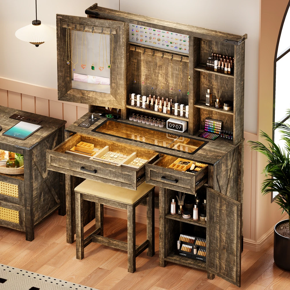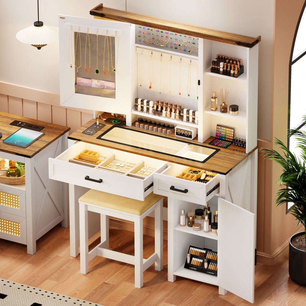 This makeup vanity desk is a game-changer! The adjustable LED lights with smart sensor make application flawless, while the built-in charging station keeps my phone and devices powered up. The sturdy glass top looks sleek, and the farmhouse style adds elegance to my room. No more struggling with dim lighting or tangled cords—everything I need is right here. Love how the lights auto-detect when I sit down—such a luxurious touch! Perfect for getting ready in style every morning.