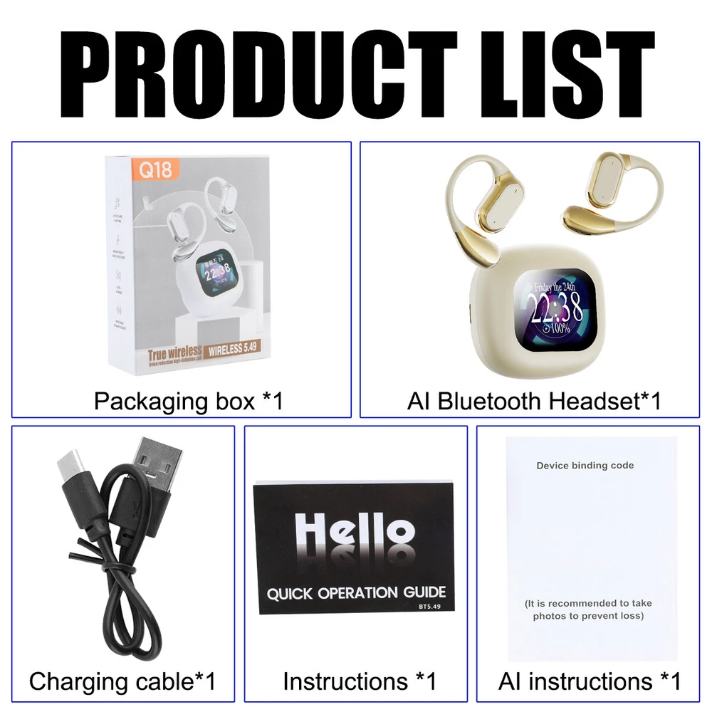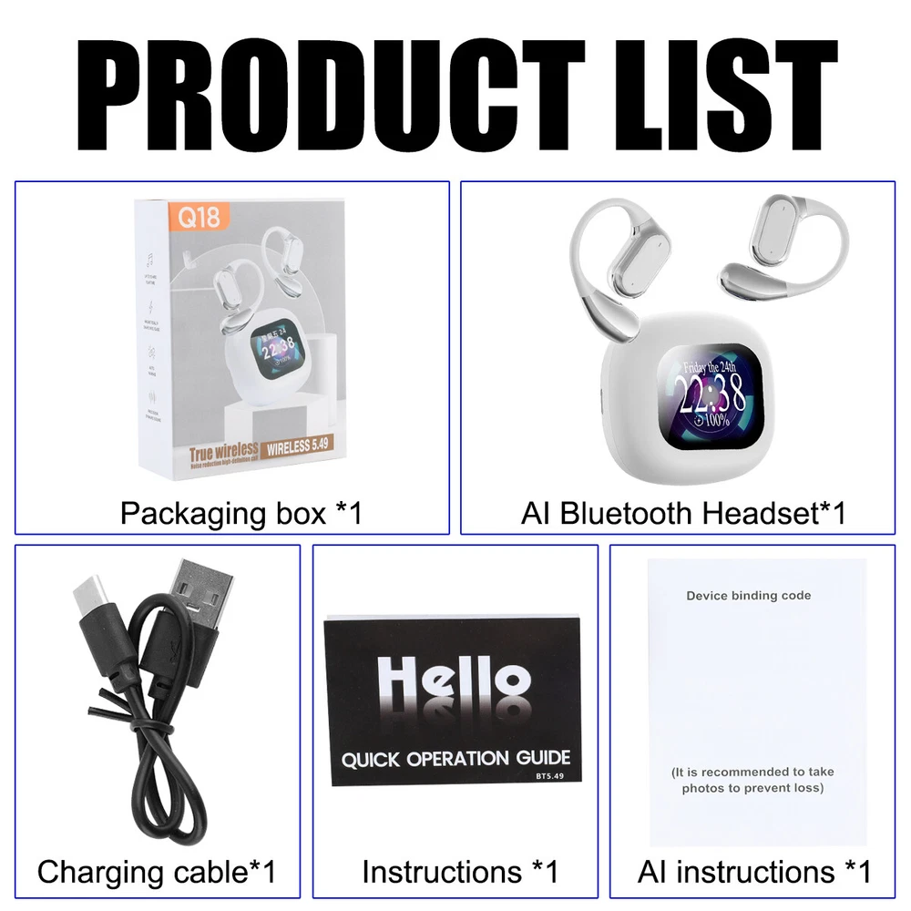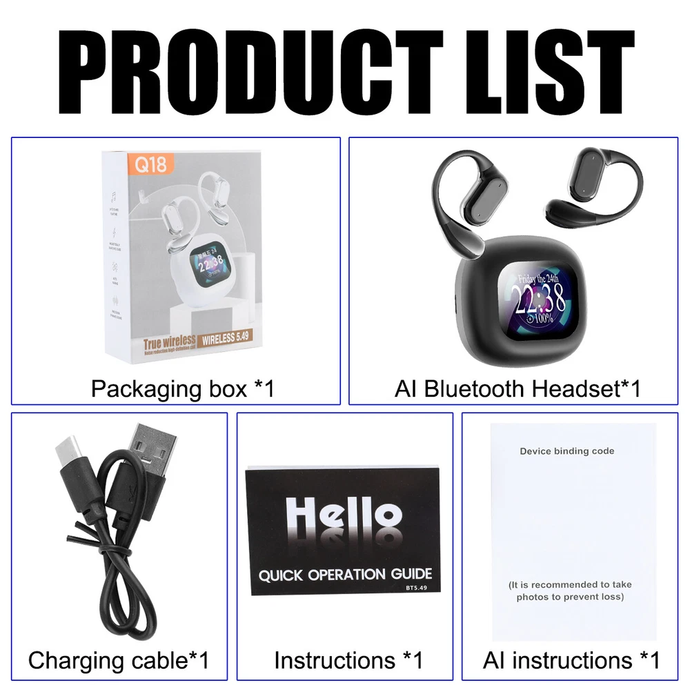 Product Description ⚡US Warehouse, the estimated delivery time is about 2-5 business days. 💎100% Brand New and High Quality Features: ⭐The product is equipped with 5.4 high configuration Bluetooth version ⭐Support AI translation, translate international mainstream 144 languages ⭐Adopt the latest LCD screen support ⭐LCD can control and operate many functions of Bluetooth connection. ⭐Support long-distance Bluetooth connection ⭐Multiple modes of scene switching, can be combined with different music equipped with different scene atmosphere ⭐ENC intelligent noise cancellation Specification: Product Model: Q18 Operation Mode(Pushbutton/Touch): Touch Chip: AB5636A Bluetooth Pairing Name: TWS Bluetooth version: 5.4 Charging Port: TYPE-C Headphone Speaker Material/Specification: F13 Headphone Battery Capacity: 25mA Compartment Battery Capacity: 300mA Transmission distance: ≥10m Talking time: >4-6H Playback time: 4-6H Tone: Chinese or English APP: AI COOL Translation languages: 144 Translation Function: Simultaneous Interpretation / Conference Assistant / Text Translation Notes: Product translation function, download APP [AI COOL] by sweeping the code, sweep the QR code on the AI manual to bind the AI translation APP Support APP voice translation 144 languages, conference assistant, intelligent assistant, etc. Screen function: support voice control, voice mode, cut song, play, language switching and so on Product list: Earphone + electric compartment *1 Charging cable *1 Instruction manual *1 AI translation manual *1 Payment We accept PayPal only. If buyer want to delay the payment because of financial problem, please contact me by the ebay message within 3 days Payment via PayPal (PayPal accepts all major credits/debit cards and eCheque) ECheque payment will tak e 3-10 days to get clear, thus DELAYing the shipment. Shipping Handling time: 1 business day (Orders are not processed on weekends & holidays) Tracking information will be sent once item is shipped. Local pick-up is unavailable at the moment. For international shipping and shipping to Guam, Hawaii and Alaska, Please contact us before placing the order. Item is shipped to ebay address. Leaving correct address can minimize delay. Terms For any issues with Defects, Return, Item Exchange request, please contact us first and send us a message first before opening any type of case or request. We devote ourselves making EVERY CUSTOMER in 100% Satisfactory and resolve any problem. We highly value and appreciate your business. Thank you. No returns will be accepted without an RMA number. Please contact us for the RMA number. Return is acceptable within 30 days of delivery. Return for replacement or money back is optional. Returned items must be in the brand new, unaltered and resalable condition. Seller is not responsible for any labor cost, expense in a dealer store, or damage due to wrong installation. Returns Return is accepted within 14 days after the buyer's receiving the item. (Excluding contrived damagement or misusage).100% money-back Guaranteed! All product will be tested in 100% before delivery.If the item is defected by the processing of postage,Buyer has up to 14 days from date of receipt for exchange of a new one.All shipping charges for returned products are to be paid by the buyer,Please contact us for the return address Contact Us All messages will be answered within 24 office hours. Please contact us either by clicking "contact seller" in the "purchase history" section or simply click "ask a question" at the bottom of this page. If you are unsatisfied with our item or service, please contact us before leaving any feedback. We are committed to resolve all issues in a friendly and satisfactory manner. We always reply to messages within 2 business days (off-duty at weekend). If you do not get a response from us, then please check your junk or spam mailbox. powered by