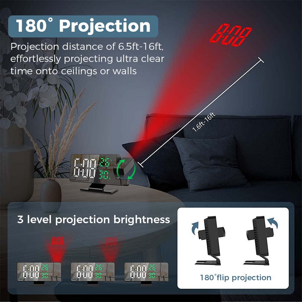 Features: 1.180° Projection Alarm Clock: This adjustable 180° projection clock can project ultra-clear time onto the ceiling or wall at a distance range of 2-5 meters, and is equipped with 2 adjustable projection brightness. When you're in bed, you don't need to touch anything to keep track of your time. 2. USB charging port and memory function: This large 7.8-inch LED digital clock includes a 5V/1A USB output port, which can charge mobile phones, tablets and other electronic devices while charging the LED alarm clock. In addition, the projection alarm clock has a built-in battery backup to remember the time setting even in the event of a power outage. 3. Adjustable brightness and night mode: There are 4 levels of adjustable brightness to meet your requirements. You can adjust the brightness or set the clock in night mode. In night mode, it automatically goes into low light from 18:00 to 5:59 in the evening by default. 4. Snooze function with alarm clock: The projection alarm clock has an alarm clock function with three modes, which can meet all your needs - Monday to Saturday/Monday to Sunday/Monday to Friday. The projection clock has a snooze function. Just press the "Sleep" button and you can get 5~60 minutes of extra sleep or press any other key to cancel the alarm. 5. Simple operation and wide range of applications: Our LED digital alarm clock has a unique design, temperature and humidity with the same screen display, 12/24H, date function, USB charging port and modern design and other updated functions, which is a perfect gift for family, friends and children. Specification: Product Name: LED Mirror Projection Alarm Clock Product size: 18.5x5.5x10.2CM Time display with 4 levels of brightness adjustment: high, medium, low, and off. Manually adjustable Projection Level 3 Brightness Adjustment: High Brightness Low Brightness Off Temperature display: -10°C~50°C(14°F~122 °C); Error: ±1°C Humidity display: 20%~95%, error: +5% Snooze function: adjustable for 5-60 minutes Packing List: 1x clock projector 1x USB cable 1x base 1x User Manual Note: 1. The LED screen is always on when using the USB cable plug that is not included 2. The built-in CR2032 battery is mainly a memory function, and there is no need to reset the time if the power goes out 3. This projection alarm clock must be plugged in and the LED screen will be on all the time. 4. USB cable included, 59 inches in length, but plug not included. 5. The indicator alarm clock can only be displayed towards the back of the alarm clock, if it is forward, the number will be reversed