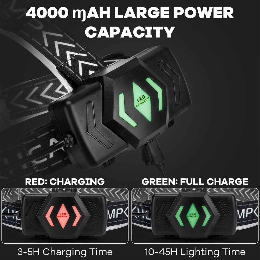 190,000 High Lumen Headlamp: rechargeable high lumen Headlamp updated by XHP90.6 lamp beads. SKNSL high powerful Head lamp up to 30 times brighter than ordinary LED Headlamp.This Super Bright Headlamp can clearly illuminate things within 3280 feet (1000m) on a dark night, easily lighting up an entire room or backyard. 3 modes: Our Super Bright Headlamp has 3 different models:High,medium.Strobe.You can use the Head lamp high lumens rechargeable flexibly in different scenarios. You can switch freely between 3 modes. Long press for 2-3 seconds to close, no need to cycle mode to close. Rechargeable Headlamp: The brightest LED Headlamp are rechargeable with USB ports. It can be charged from power banks, outlets and laptops for easy indoor and outdoor charging. 180° Adjustable headlamp For camping:LED headlamp specially designed 180 ° adjustable angle, each degree is very solid, so you can see the full range of vision from front to back. Pull the headlamp head to spotlight mode and pull back the head to floodlight mode. Waterproof & Durable:Made of durable military aluminum housing, the headlamp is waterproof to IPX7. And with a tight waterproof design, it can be used normally in any bad weather, such as rain or snow.