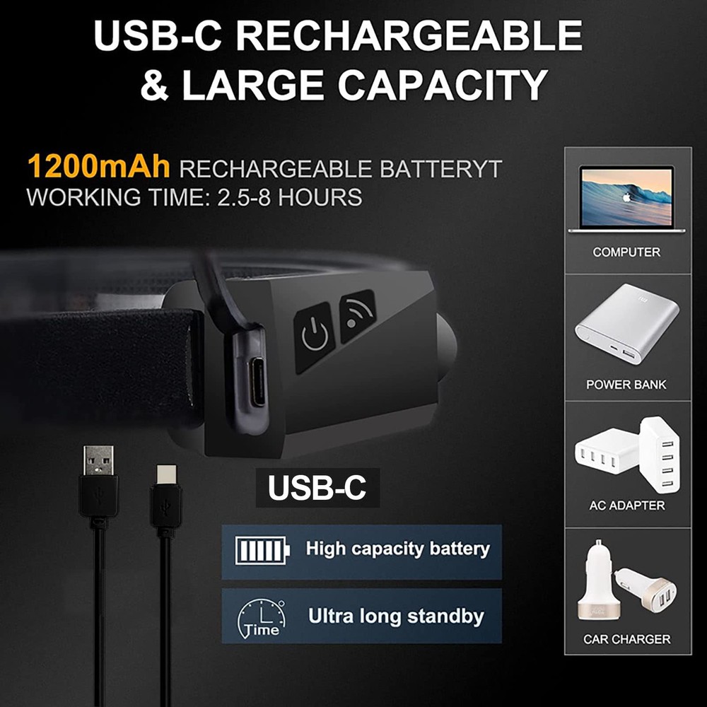 [5 Light Modes+Induction Mode] The hand sensor headlamp Strip Lamp has 5 lighting modes: COB High Mode, COB Low Mode, LED High Mode, LED Low Mode and Strobe Mode. In any other mode, long press the On/Off Button to transform the strobe mode, then the LED and COB light will flash at the same time.After the sensor mode is turned on, which is very convenient! [Super Bright & Wide Beam 230°] This wide beam headlamp offers a 230°wide-angle illumination and 350Lumens output, You can get a wide range of lighting coverage without moving your head,The super bright LED XPE light on the side can provide a lighting distance of about 150 feet.for maximum brightness. [USB Rechargeable Battery] headlamp equipped with upgraded Type-C input port, has a built-in 1200mAh battery suitable for multiple charging methods, fast charging, it can work for 2.5-8 hours in different light modes.Charging function not only saves the cost of replacing batteries but can be recycled. [Lightweight & Adjustable Headband] Our head lights led features with an adjustable, stretchable and elastic headband to fit for your head size.The led Strip Lamp is made of ABS and silicone, and the shell is firm and reliable. weighs only 3.35oz comfortable to wear. [Best Gift & Applicable Scenes] Rechargeable Headlamp can disperse the darkness and illuminate the surroundings. Suitable for outdoor night running, cycling, camping and fishing.It's possible to fold but not affect the use, IPX4 waterproof is suitable for outdoor use, a high-quality gift for adventurers!Note: Please charge it before use.