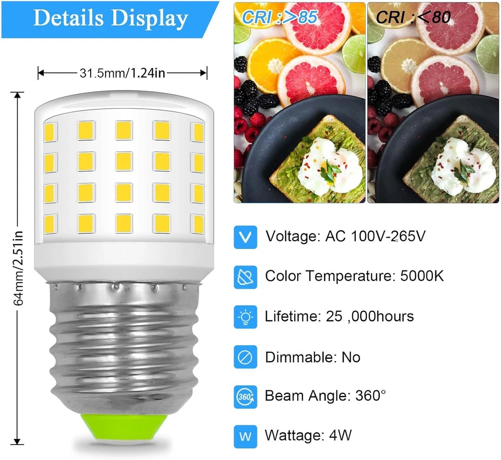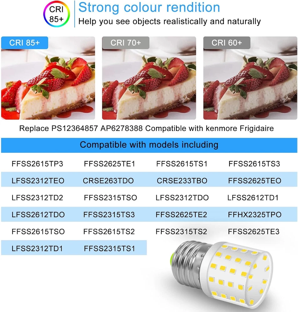 Store New Arrivals Add to Favorite View Feedback Contact LED Refrigerator Light Bulb 4W AC100-265V 3.5W Refrigerator Bulb, E26 Medium Base Compact Bright Lamp Compatible with Frig.Idairefridge Light Bulb Kei D34L Bulb, Daylight White 2 Pack Description Item model number RL2856C-E26 Light Source Type LED Number of Items 2 Beam angle 360 Degrees Country of Origin China Controller Type Push Button Item Shape Taper Unit Count 2.0 Count Light Source Wattage 4 Watts Model Number RL2856C-E26 Model Name RL2856C-E26 Package Dimensions 4.69 x 4.61 x 1.61 inches; 1.59 ounces White Brightness 600 Lumens Light Type LED Brightness 600 Lumen Material Type Plastic Light Color Daylight White Connectivity Technology Normal bulb Special Features Non Dimmable, 5304511738 Light Bulb, 4W=60W, 600lm, Kei D34l Refrigerator Bulb Special Feature Non Dimmable, 5304511738 Light Bulb, 4W=60W, 600lm, Kei D34l Refrigerator Bulb Light Source Operating Life 25000 Hours Bulb Base E26 Medium Color Temperature 5000 Kelvin Color Daylight White Wattage 4 watts Indoor Outdoor Usage Indoor Specific Uses For Product Indoor use only Voltage 120 Volts Control Method App Included Components NO Incandescent Equivalent Wattage 60 Watts ✅【600LM High Performance&Save Your Bills】 Each of the 3.5w refrigerator led bulbs give out 600lm brightness which equal to a 40W-60W incandescent light bulb performance. Save more than 90%+ electricity bills and work for more than 25000+ hours long lifespan. Hence no more troubles to exchange bulbs frequently for your freezers.5304511738 frigidaire light bulb energy saving and bright. 💡【Notice】:AC100-265v 3.5w refrigerator bulb LED Refrigerator Light Bulb is a manufacturer substitution. Part may differ in appearance but is a functional equivalent to prior parts. Be sure to disconnect the power to the Refrigerators before you begin this repair. 💡【Compatible with】: 5304511738 light bulb Used in countless home appliances, can replace the following part numbers PS12364857,AP6278388,4584444,PS11767930,4396822,4813672,W11216993,W11125625,W10820003,AP6329125,PS12349398,EAP12349398,W10565137,W10805744,W10837631,W10865849,W11043014,W11196500,W11216993,W11338583. Refrigerator light bulb works well in both kitchens and bathrooms, thanks to its small size, It is especially suited for fridges, freezers, and bedside lamps. 💡 【Kei D34l Refrigerator Bulb】 Compatible with many brands:Frigi-daire, Ken-more, Elect-rolux. Fit frigidaire models(not all) :KEI D34L KEID34L KEL3418L KEL3418 LFSS2612TF2 LFSS2612TF2 FFSS2315TS2 FFSS2615TE2 FFSS2615TS3 LFSS2612TF3 LFSS2612TF3 LFSS2612TP3 LFSS2612TP3 LFSS2612TE3 LFSS2612TE3 FFSS2615TP3 FFSS2615TP1 LFSS2612TE4 FFSS2625TS3 FFSS2615TE4 FFSS2615TE3 FFSS2315TP1 FFSS2315TP3 LFSS2612TF4 FFSS2615TP4 FFSS2615TS5 FFSS2615TD3 FFSS2615TD4 FFSS2315TE3 LFSS2312TF4 LFSS2312TP4 💡 【Light Bulb Model 】CRSE233TB0 CRSE233TS0 CRSE233TW0 CRSE263TB0 CRSE263TD0 CRSE263TS0 CRSE263TW0 FFSS2615TS2 FFSS2615TS2 FFSS2615TS1 FFSS2615TD2 LFSS2312TF1 FFSS2315TP4 FFSS2315TS5 LFSS2612TP5 FFSS2315TE4 FFSS2315TD4 FFHT1821TS2 FFSS2615TP2 FFSS2615TP2 FFSS2315TS1 FFSS2315TS3 LFSS2612TD1 LFSS2312TD1 LFSS2312TD2 FFSS2625TE1 FFSS2625TE3 FFSS2625TE2 LFSS2312TE LFSS2312TE LFSS2612TP2... ( Please feel free to contact with us if you are not sure this Light Bulb fits your model ) ✅【Worry-free After Sales】 We attach great importance to the quality of the appliance fridge bulb. We strive to provide great customer service and want to make sure you are completely satisfied. Please feel free to with Q&A or E-mail. Product Description Appliance Light Bulb 5304511738 E27 KEI D34L REFRIGERATOR BULB 5304511738 Appliance Light Bulb led refrigerator light bulb No flicker design,more soft,stable ligh. 5304511738 kei d34l refrigerator bulb using upgraded IC + led chips and durable material enhances the bulb’s safety.15,000h 10 times longer than ordinary incandescent 1000h .5304511738 fridge light bulbs solve the problems of dimmed, flickering, not bright lights. High Color Rendering Index(CRI≥85) -20℃-45℃. Durable IP20 Waterproof The video showcases the product in use. The video guides you through product setup. The video compares multiple products. The video shows the product being unpacked. ABOUT US We offer the best prices around on high quality products. Our E-store includes media such as books, movies, music and games while offering electronics, toys, sporting apparel, clothing, tools, general home, garden items and more. SHIPPING We are always working hard to ensure your package arrives as soon as possible. Please understand that some factors like weather, high postal traffic, and the performance of shipping companies are outside of our control. We offer free shipping to the lower 48 states and ship within 2 business days of payment, usually sooner. We do not accept P.O. Boxes. Please provide a physical address. For shipping outside of the continental USA, we only use eBay's Global Shipping Program.The item is shipped to KY and then sent to the rest of the world. International customers are responsible for all duties and taxes. Continue to check out in order to calculate costs for shipping the item to your country. Messages regarding eBay's Global Shipping Program MUST be directed at eBay EXCLUSIVELY. RETURNS We offer a 30-Day Return Policy on items which you are not completely satisfied with. You have the option for a full-refund or an exchange of the item. No returns are available on items shipped outside of the USA. PAYMENT We accept PayPal. CONTACT US This page content is yet to come Please ad us to your favorite seller and visit again later Thank You CUSTOMER SATISFACTION We try our very best to make sure every customer is completely satisfied. If there's a problem, message us! We're happy to help. WE ACCEPT Copyright © 2021 AutoDS. | All Rights Reserved