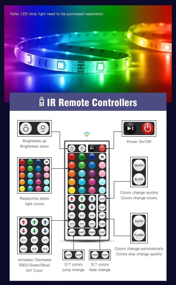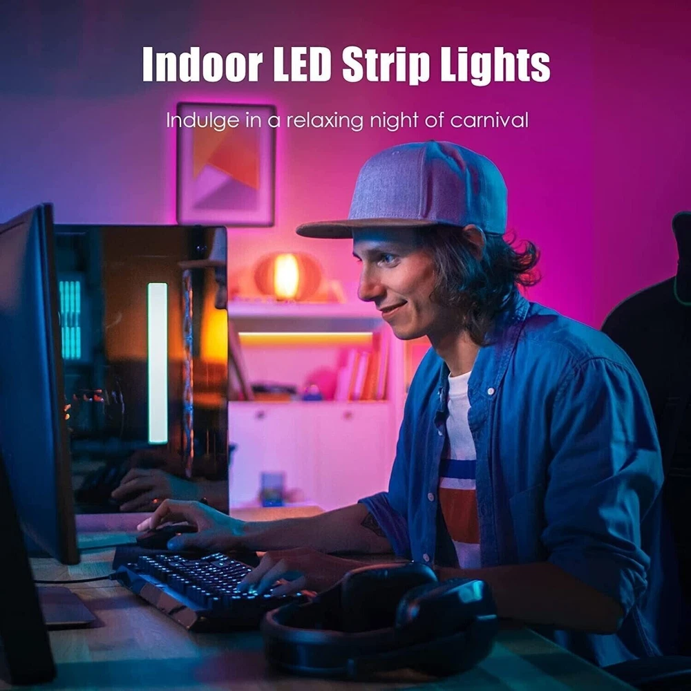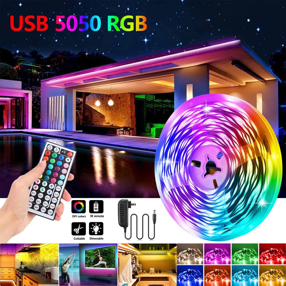 Flexible Strip Light 32ft LED Strip Lights Product Features: 【Multiple Choices LED Strip Light】: This RGB Led strip lights kit can change colors and speed automatically and periodically. It has not only RGB(Red, Green, Blue), 20 multicolored options, but also has DIY selection to create your great led mood lighting. 【Easy Installation and Use】: Led tape lights is cuttable between every 3 leds. You can cut off extra strips to adjust to a proper length. 3M self-adhesive tape can be fit on any dry and flat surface. Flexible to install anywhere you want. 【Connectable And Cuttable】: Strong sponge double-sided tape installation, super viscosity, just plug in all the parts and peel off the protective layer, then stick to the clean and flat surface. These light strips can be cut on all 3 LEDs along the cutting marks without damaging the rest. 【Safety LED Strip Lights】: This led strip light provide 12V/5A power supply no worry about prevent electric shock, short circuit etc, we promise it will provide a safety environment for your. 【Widely Application】: Low Power Consumption. The working voltage is 12V. Extremely low heat. It is touchable and safe to children. The strip lights can be used indoors decoration. Ideal for TV, home, bar, shop, etc.