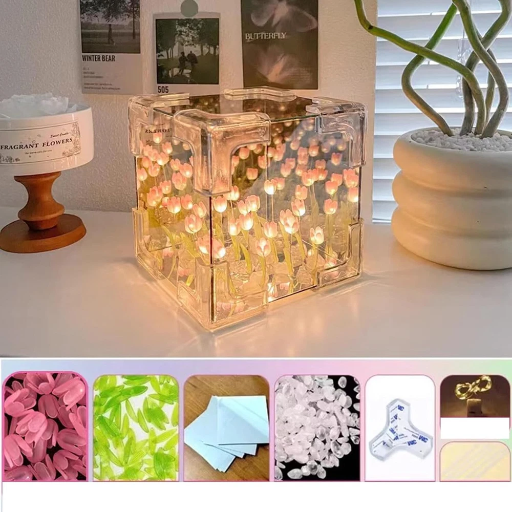 The LED Tulip Mirror Lamp is a USB rechargeable night light designed for bedroom use. This pink lamp functions as both a sleeping light and decorative decoration, providing a soft atmosphere in the room. The touch switch allows for easy operation, while the energy-efficient LED lighting technology ensures long-lasting use. With dimensions of 1" x 1" x 1" and a weight of 4.6 ounces, this lamp is perfect for adding a cozy ambiance to any bedroom space or used as a gift for loved ones. Captivating Blooms: This cloud tulip lamp transforms any space into a mesmerizing sea of flowers, immersing you in a world of tranquility and beauty with its double-sided mirror design and LED illumination. Dual Enchantment: A true masterpiece of design, this lamp serves as an elegant mirror when turned off, and unveils a breathtaking display of tulips when illuminated, combining functionality and artistic flair. Enduring Radiance: Crafted with energy-efficient LED technology and high-quality materials, this tulip lamp promises a long-lasting glow, featuring 20 vibrant flowers and a sturdy glass construction. Versatile Ambiance: More than just a sleep aid, this lamp creates a warm, inviting atmosphere, making it a versatile addition to any bedroom, living space, or special occasion as a decorative centerpiece or reflective mirror. Thoughtful Gifting: With its captivating design and meaningful symbolism, this tulip lamp makes an ideal gift for loved ones, commemorating special moments like birthdays, holidays, or simply expressing affection for friends and family.