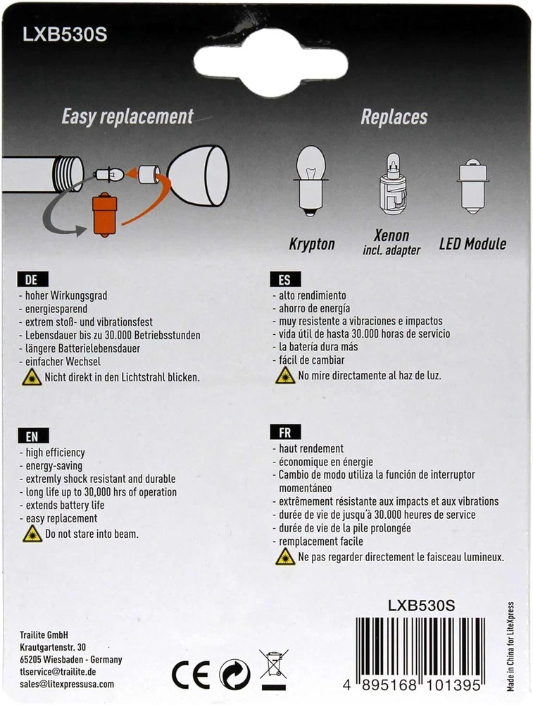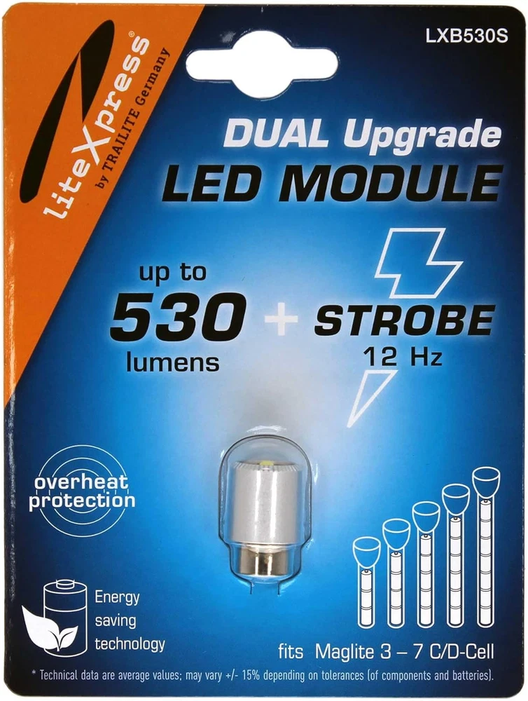 Store New Arrivals Add to Favorite View Feedback Contact LED Upgrade Module LXB530S for Maglite Dual Mode 530 Lumen + 12 Hz Stobe/Flashing Mode for 3-7 C/D-Cell Maglite, DO NOT Use for 2 Cell Maglite Description Item model number LXB530S Light Source Type LED Style Modern Number of Items 1 Power Source Battery Powered Incandescent Equivalent Wattage 3 Watts Country of Origin China Batteries Included? No Specification Met CE Assembled Height 1.5 centimeters Controller Type Push Button Unit Count 1.0 Count Batteries Required? Yes Light Source Wattage 3 Watts Bulb Shape Size A19 Product Dimensions 0.98 x 0.59 x 0.59 inches Material Aluminum Assembled Width 1.5 centimeters Efficiency [Improved] Model Name LED upgrade Module Specific Uses For Product Upgrade Maglite Flashlight Item Package Quantity 1 Bulb Features flashing White Brightness 530 Lumens Indoor/Outdoor Usage Outdoor, Indoor Language English Brightness 530 Control Method App Light Color white Item Weight 0.353 ounces Assembled Length 2.5 centimeters Special Features LED Upgrade Special Feature LED Upgrade Color Rendering Index 95 Part Number LXB530S Color White Wattage 3 watts Light Type LED Accepted voltage frequency 100 to 240 Volts and 50 Hertz to 60 Hertz Bulb Base Wedge Shape Reflector(R) Frequency 12 Hz Power Consumption 3 Watts Voltage 4.5 Volts Shade Material Aluminum Replacing it, is as easy as changing the original bulb, please you may also see the Video how to proceed ONLY to be used for for 3-7 C / D-Cell Maglite flashlights The energy efficacy will compensate the cost by using fewer Batteries Replacing it, is as easy as changing the original bulb, please you may also see the Video how to proceed ONLY to be used for for 3-7 C / D-Cell Maglite flashlights The energy efficacy will compensate the cost by using fewer Batteries ABOUT US We offer the best prices around on high quality products. Our E-store includes media such as books, movies, music and games while offering electronics, toys, sporting apparel, clothing, tools, general home, garden items and more. SHIPPING We are always working hard to ensure your package arrives as soon as possible. Please understand that some factors like weather, high postal traffic, and the performance of shipping companies are outside of our control. We offer free shipping to the lower 48 states and ship within 2 business days of payment, usually sooner. We do not accept P.O. Boxes. Please provide a physical address. For shipping outside of the continental USA, we only use eBay's Global Shipping Program.The item is shipped to KY and then sent to the rest of the world. International customers are responsible for all duties and taxes. Continue to check out in order to calculate costs for shipping the item to your country. Messages regarding eBay's Global Shipping Program MUST be directed at eBay EXCLUSIVELY. RETURNS We offer a 30-Day Return Policy on items which you are not completely satisfied with. You have the option for a full-refund or an exchange of the item. No returns are available on items shipped outside of the USA. PAYMENT We accept PayPal. CONTACT US This page content is yet to come Please ad us to your favorite seller and visit again later Thank You CUSTOMER SATISFACTION We try our very best to make sure every customer is completely satisfied. If there's a problem, message us! We're happy to help. WE ACCEPT Copyright © 2021 AutoDS. | All Rights Reserved