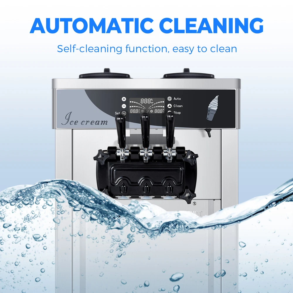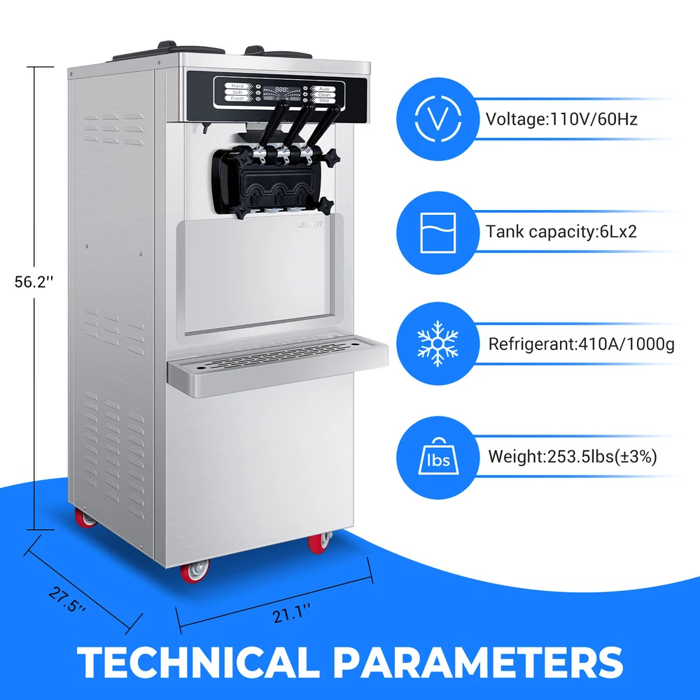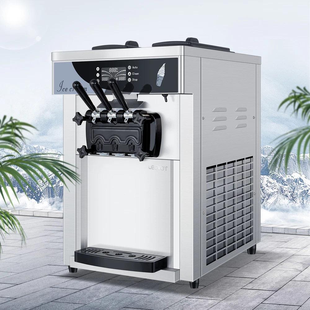 LEEVOT Commercial Ice Cream Machine 3 Flavors Soft Serve Yogurt Maker Item Description 828 Title: LEEVOT Commercial Ice Cream Maker Machine, 25L/H Countertop Soft Serve Machine With 2 x 6L Tanks, Auto Clean, 2+1 flavors,1800W Bullet points: 【High Performance】 The commercial soft Ice cream maker allows you to make multiple batches continuously, producing the creamy consistency by effectively mixing ingredients from top to bottom with the mixing paddle the whole day, just keeping two hoppers filled. 【Double 6L Hoppers】Equipped with two 6L 304 stainless steel hoppers on its top, the production can reach up to 25L per hour, and the speed can be adjusted to level 6, which is suitable for different work scenarios. 【1800W Powerful Compressor】 Driven by a 1800 watt brand compressor, this commercial ice cream maker has faster cooling, less noise, and lower power consumption. R410a refrigerant makes ice cream production more efficient and energy-saving. 【Intelligent LCD Panel Control】 You can set the time, temperature, and hardness with the convenient control panel. The quantity will also be displayed on the screen for direct observation. 【One-click Automated Cleaning Operation】 Worktop soft ice cream machine removes any remaining ice cream in less than five minutes with its self-cleaning function, and it is fast and straightforward, switching up the flavors on a regular basis is effortless. 【2+1 flavors & 4 nozzles】Our ice cream maker has three ergonomic handles, it offer 3 flavors (2 single flavors & 1 mixed flavor) and 4 nozzles to enrich your choices and satisfy the diverse demands of your customers. 928 Title: LEEVOT Commercial Ice Cream Maker Machine, 35L/H Countertop Soft Serve Machine With 2 x 6L Tanks, Auto Clean, Pre-cooling function, 2+1 flavors, 2200W Bullet points: 【High Performance】 The commercial soft Ice cream maker allows you to make multiple batches continuously, producing the creamy consistency by effectively mixing ingredients from top to bottom with the mixing paddle the whole day, just keeping two hoppers filled. 【Double 6L Hoppers】Equipped with two 6L 304 stainless steel hoppers on its top, the production can reach up to 35L per hour, and the speed can be adjusted to level 6, which is suitable for different work scenarios. 【2200W Powerful Compressor】 Driven by a 2200 watt brand compressor, this commercial ice cream maker has faster cooling, less noise, and lower power consumption. R410a and R134 refrigerant makes ice cream production more efficient and energy-saving. 【Intelligent LCD Panel Control】 You can set the time, temperature, and hardness with the convenient control panel. The quantity will also be displayed on the screen for direct observation. 【One-click Automated Cleaning Operation】 Worktop soft ice cream machine removes any remaining ice cream in less than five minutes with its self-cleaning function, and it is fast and straightforward, switching up the flavors on a regular basis is effortless. 【2+1 flavors & 4 nozzles】Our ice cream maker has three ergonomic handles, it offer 3 flavors (2 single flavors & 1 mixed flavor) and 4 nozzles to enrich your choices and satisfy the diverse demands of your customers. 【Pre-cooling Function】The ingredients can be stored in the hopper for longer. Once pre-cooling is set, the soft serve ice cream maker will work overnight to keep the ingredients fresh at a low temperature, ensuring they are ready for you on the next day. 928T Title : LEEVOT Commercial Ice Cream Maker Machine, 25L/H Countertop Soft Serve Machine With 2 x 6L Tanks, Auto Clean, 2+1 flavors, 1650W Bullet points: 【High Performance】 The commercial soft Ice cream maker allows you to make multiple batches continuously, producing the creamy consistency by effectively mixing ingredients from top to bottom with the mixing paddle the whole day, just keeping two hoppers filled. 【Double 6L Hoppers】Equipped with two 6L 304 stainless steel hoppers on its top, the production can reach up to 25L per hour, and the speed can be adjusted to level 6, which is suitable for different work scenarios. 【1650W Powerful Compressor】 Driven by a 1650 watt brand compressor, this commercial ice cream maker has faster cooling, less noise, and lower power consumption. R410a refrigerant makes ice cream production more efficient and energy-saving. 【Intelligent LCD Panel Control】 You can set the time, temperature, and hardness with the convenient control panel. The quantity will also be displayed on the screen for direct observation. 【One-click Automated Cleaning Operation】 Worktop soft ice cream machine removes any remaining ice cream in less than five minutes with its self-cleaning function, and it is fast and straightforward, switching up the flavors on a regular basis is effortless. 【2+1 flavors & 4 nozzles】Our ice cream maker has three ergonomic handles, it offer 3 flavors (2 single flavors & 1 mixed flavor) and 4 nozzles to enrich your choices and satisfy the diverse demands of your customers.