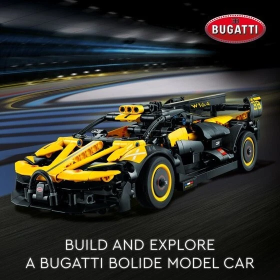 Product details Inspire children to build their own racing car model with this LEGO Technic Bugatti Bolide (42151) car toy set for kids Ages 9+ years old. They’ll enjoy a challenging project as they craft all the true-to-life details in the model car kit, including a working W16 engine, steering and scissor doors. The LEGO sports car’s stunning looks steal the show, with a yellow-and-black color scheme and authentic sticker details. After building and exploring the car, kids can display their collectible model with pride. Let the LEGO Builder app guide you and your child on an easy and intuitive building adventure. Zoom in and rotate models in 3D, save sets and track your progress. LEGO Technic buildable model sets feature realistic movement and mechanisms that introduce young LEGO builders to the universe of engineering in an approachable and realistic way. This model car kit makes a great gift for budding engineers Ages 9 plus years old. This LEGO Technic building set measures over 3 in. (8 cm) high, 12 in. (31 cm) long and 5 in. (13 cm) wide. Contains 905 Pieces. Perfect Gift for Kids - This LEGO Technic Bugatti Bolide car toy model building set is an ideal gift for kids ages 9 and up, introducing them to engineering and construction Explore Stunning Design - Discover the amazing design of the Bugatti Bolide with this LEGO Technic model race car building kit for motorsport fans and enthusiasts Eye-Catching Display - With a yellow and black color theme and sticker detail, this LEGO Technic toy car model looks great on display in kids' rooms Innovative Motorsport Technology - The Bugatti Bolide pushes the limits of motorsport technology; let your kids build this iconic LEGO Technic racing car model Authentic Features Included - This build features a working W16 engine, steering, scissor doors, and realistic movement based on the original car model