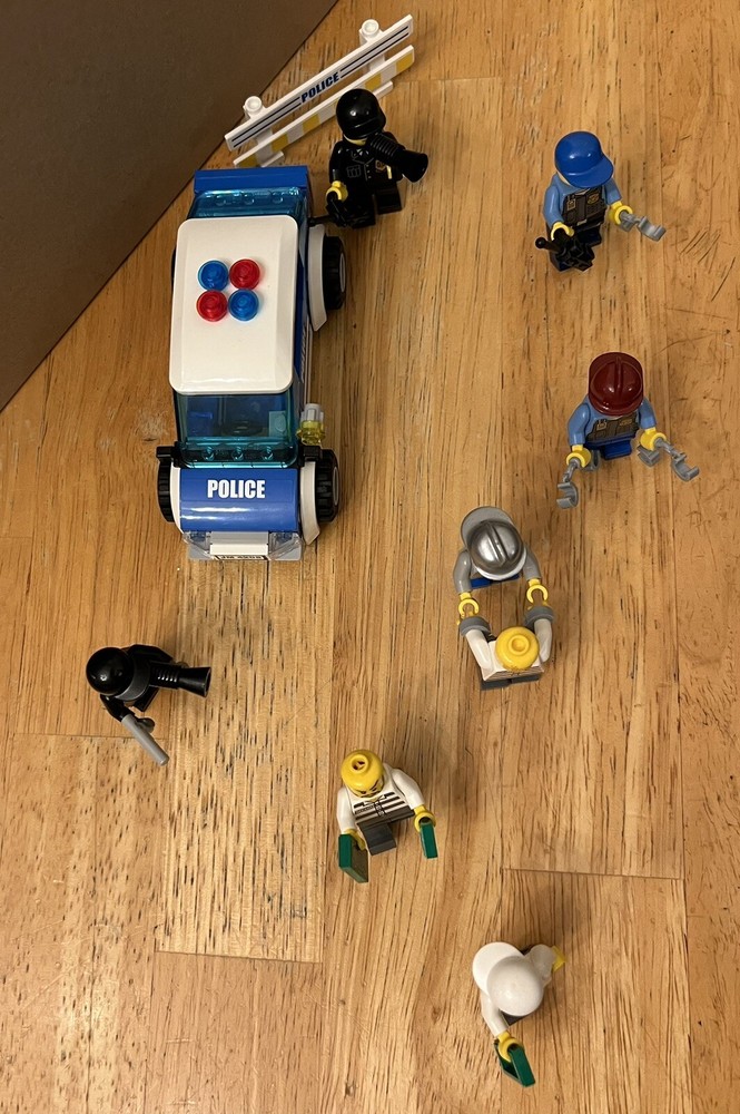 Get ready for an exciting LEGO CITY adventure with this modified police car set! This set includes 3 robbers and 5 officers, perfect for a thrilling playtime. The set is in great condition and is an excellent addition to any LEGO CITY collection. Order now and let playtime begin! NOTE:everything shown in image included(handcuffs, money, gun, etc.)