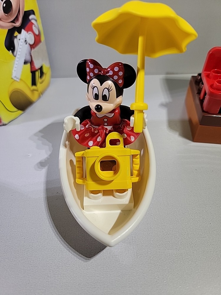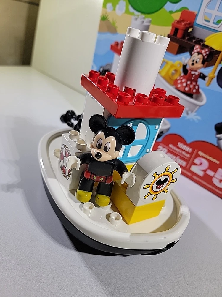 This is a LEGO Duplo set featuring Mickey Mouse and his friends from The Roadster Racers. The set includes 28 pieces and allows you to build Mickey's boat. It comes in its original packaging and is a retired set from 2018. The set number is 10881, and it belongs to the Mickey Mouse theme. The set includes both Mickey and Minnie Mouse characters and is suitable for children aged 2-5 years old. The set is made of plastic and was manufactured in Denmark, Hungary, Mexico, China, and the Czech Republic.