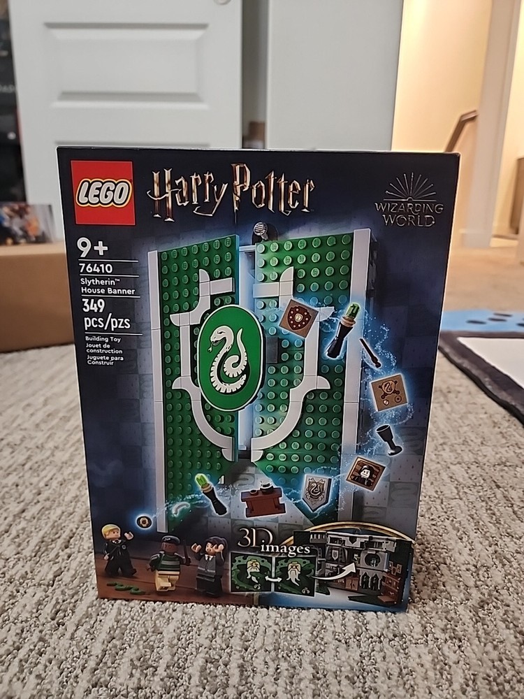 The LEGO Harry Potter Slytherin House Banner set (76410) features a buildable banner representing the Slytherin house. Released in 2023, this retired set includes a height of 10.5 inches, length of 2.5 inches, and width of 7.83 inches. Suitable for ages 9 and up, this set is part of the LEGO Harry Potter theme.