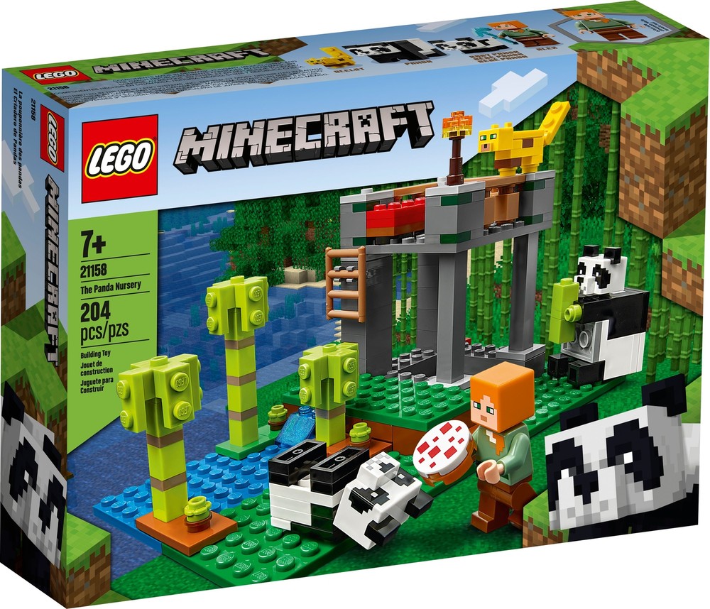 Prepare to care for the cutest mob in Minecraft! Mom has brought baby panda to nursery - and they're both full of life. They stand sit look around... usually for food! Luckily there's lots of bamboo to eat and Alex has brought a pie to share! Time for a nap? Help baby panda climb the ladder to the rooftop bed. This hands-on LEGO set adds a whole new dimension to your Minecraft adventures!
