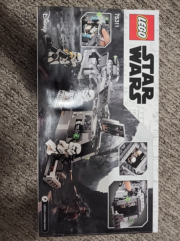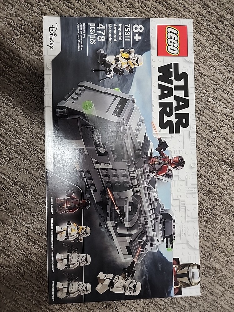 The product is a LEGO set from the Star Wars theme, specifically the Imperial Armored Marauder set number 75311 released in 2021. It features an Imperial Armored Marauder vehicle with dimensions of approximately 14.57 inches in length, 8.9 inches in width, and 3 inches in height. The set is recommended for ages 8 and up.
