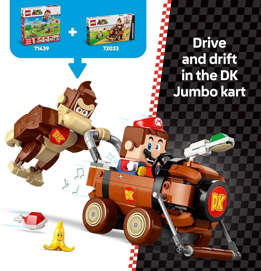 LEGO Super Mario: Mario Kart Donkey Kong & DK Jumbo - Collectible Toy Building Set for Kids, Boys and Girls, Ages 8+ - Nintendo Donkey Kong and Mario Kart Toy for Fans - Gift Idea - 72033 ●SUPER MARIO KART COLLECTIBLE – Kids can race to the finish line while aiming for targets with the help of Donkey Kong on his DK Jumbo ●DONKEY KONG TOY – This toy playset includes a Donkey Kong figure, plus a banana with face decorations ●MARIO KART TOY – Place Donkey Kong on his DK Jumbo kart, drive and drift, and launch shells at the target to knock the banana off ●INTERACTIVE DIGITAL PLAY – Ride the DK Jumbo with LEGO Mario (71439), LEGO Luigi (71440) or LEGO Peach figure (71441) (figures not included) to trigger Donkey Kong game sound and visual effects, plus other Mario Kart sounds ●GIFT FOR SUPER MARIO FANS – Kids ages 8 and up will love this playset as a holiday or birthday gift ●DIMENSIONS – This building set measures over 3.5 in. (8 cm) high, 3 in. (7 cm) wide and 6 in. (15 cm) long Thank you for your order!