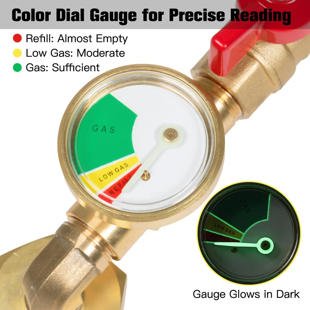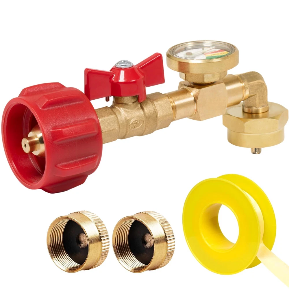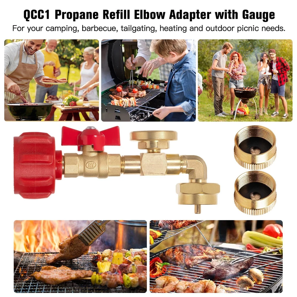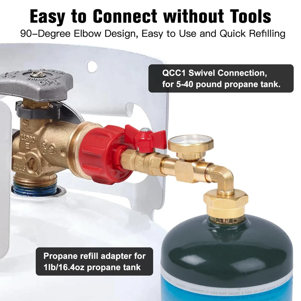 Upgraded 90-Degrees Elbow Design: This 90 degrees elbow propane refill adapter upgraded with new connectivity methods to make it easier and no tools required, and it with hand-wheel grip for tightening, you can easily connect your large cylinder to 1LB propane tank ON-Off Control Valve and Gauge: This propane refill adapter equipped with a propane ON-OFF control valve and gauge, which's can minimizes gas leaks during cylinder connections and precise control over the refilling process, allowing for safe and controlled refilling Secure and Reliable: The corrosion-resistant solid brass material provides better sealing and durability, while the valve, pressure gauges and built-in overflow protection device integrated safety features effectively mitigate the risk of overfilling gas cylinders Easy to Use: Easily refills your 1 pound bottles multiple times without tools, helping you save on the cost of buying new green propane gas cylinders, the pressure gauge can quickly check the remaining gas of large tank to avoid the inconvenience caused by insufficient gas during the filling process Additional 1 LB Propane Bottle Cap: The 1 LB propane bottle cap is useful for your camping stoves, home applications, barbecue, propane heater or others equipments that use 1 lb propane tank. You don't need to spend extra money to buy the cap. Use and Attention: Connect the QCC1/Type1 coupler to the large propane tank cylinders and place the other end of the rotary control nut is connected to the 1LB propane tank. Turn the large propane tank upside down in the safe corner so the liquid can flow out. Stay away flames and sparks for safety. Compatibility & Packaging: This adapter fits for 5-40LB propane tank refill 1LB bottle, suitable for heater, camping stove, portable and tabletop grill etc. The kit includes: 1* Elbow QCC1 Propane Refill Adapter with Valve and Gauge, 2* 1 LB Propane Bottle Cap, 1* Roll Sealing Tape.