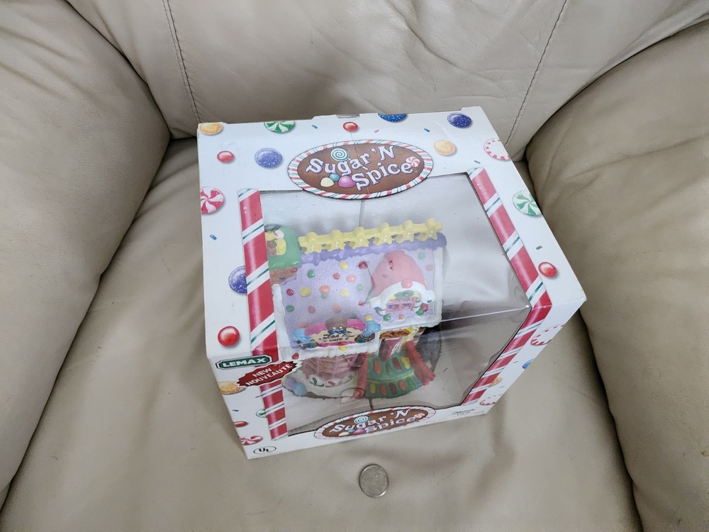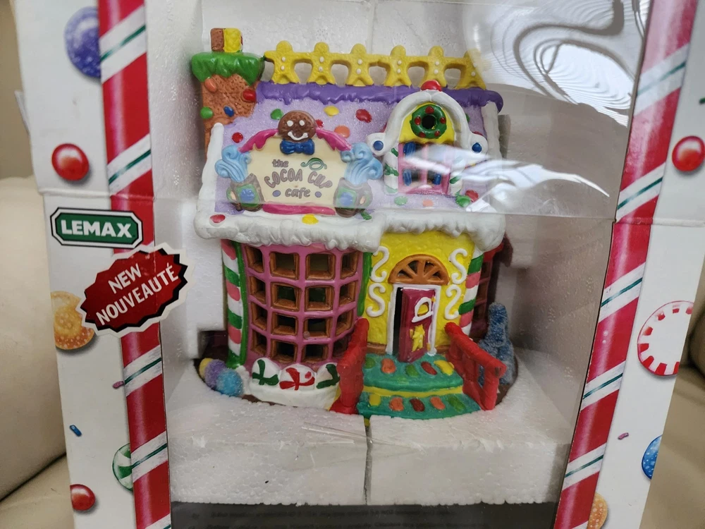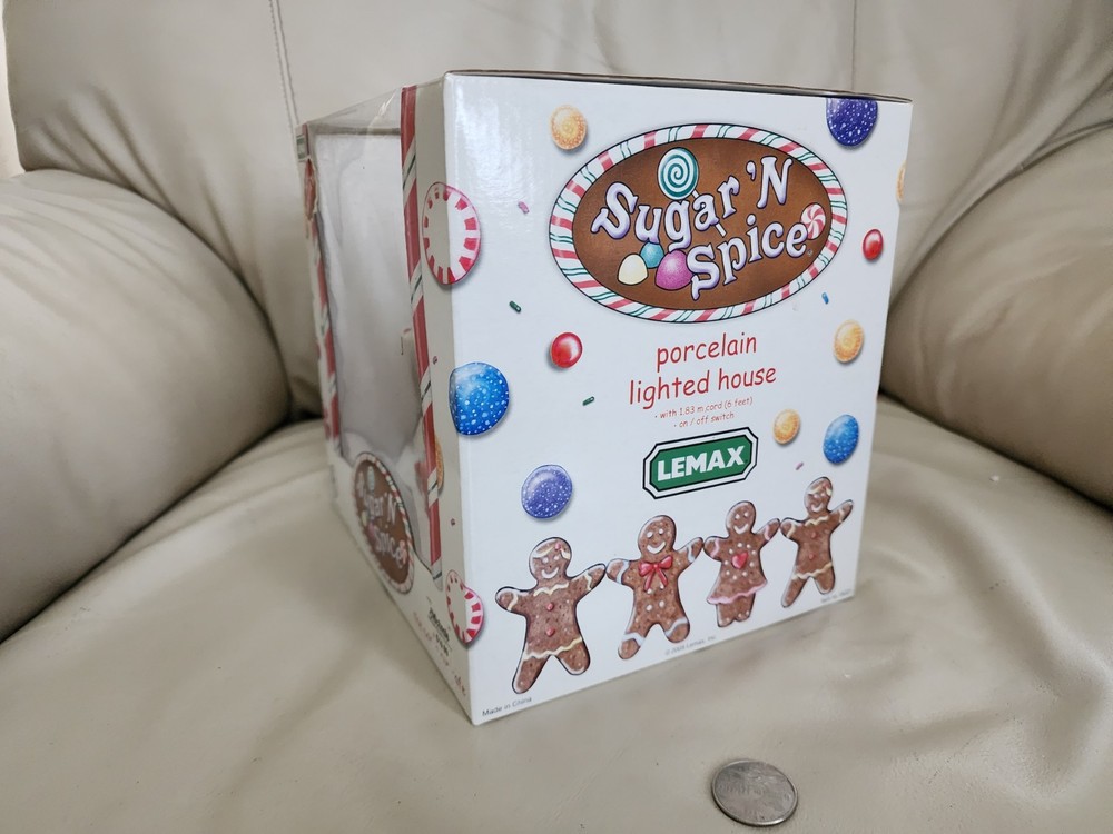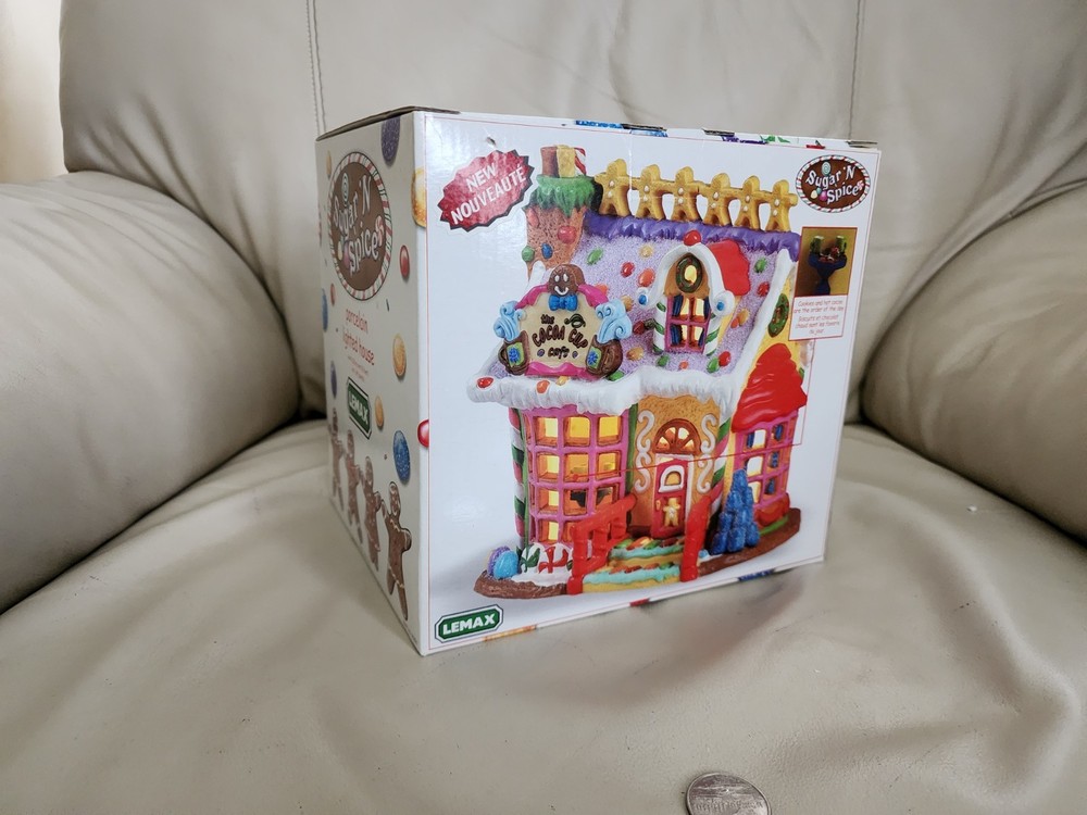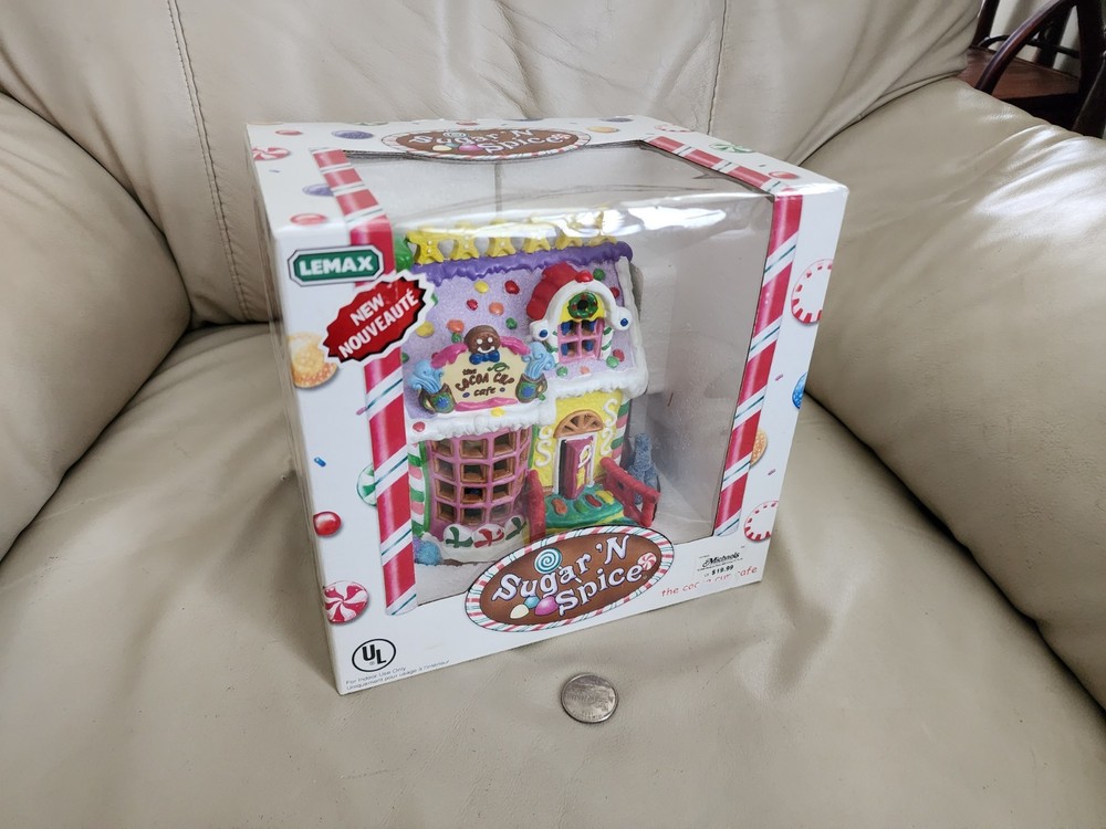 LEMAX Sugar ' Spice 2005 The Cocoa Cup Cafe porcelain Lighted House W Box. Frosted cookies like colors. Measures around 6+ inches tall and long. Light bulb insert on the bottom design. Lights working. Turn knob switch. Old stock new, open for pictures. Great vintage decorative display for home and any other settings. Vintage clean and intact. Sells as is. The original box has gentle ware. Preowned vintage item.