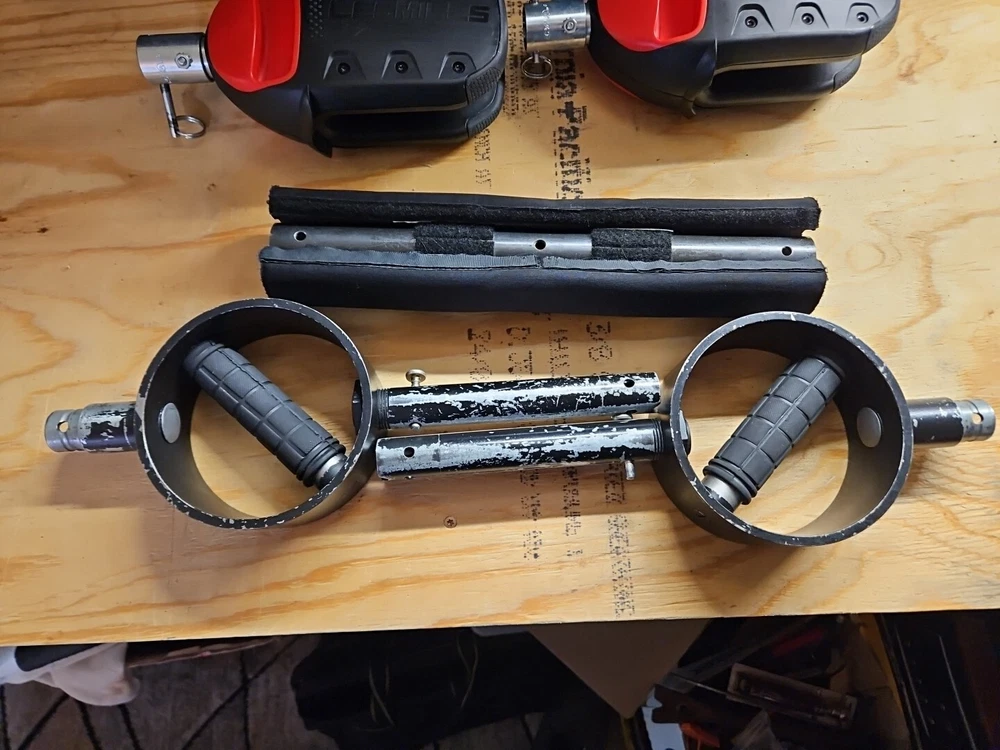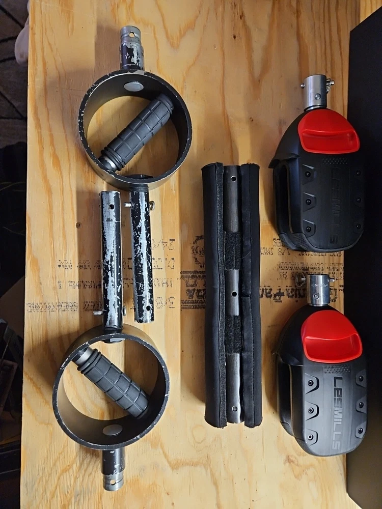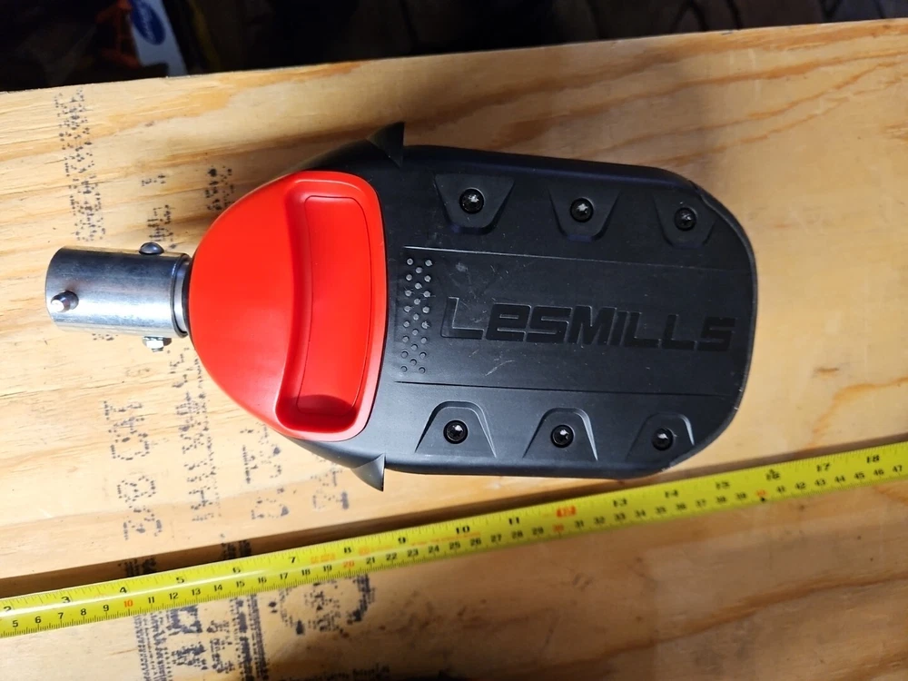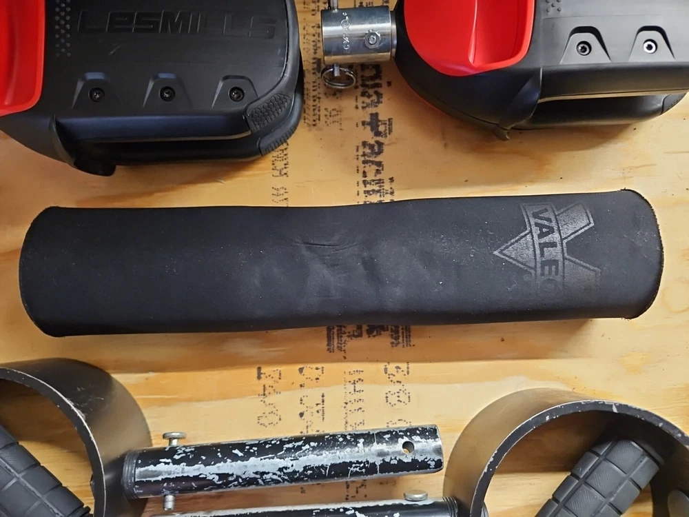 LES MILLS SMARTBAR Custom Set Clamps Breakdown Bar Kit Modular Read Look Unit max length is 61", shorter set point approximately 50". Modular packable workout bar it. See pictures. Includes 5 piece kit. With Zip close bag for storage as seen. Center padded bar. Two in line offset grip handles. Two end piece swivel Les Mills clamping ends. See pictures. Product will be shipped timely and packaged with care. Offers are encouraged. Please feel free to reach out with questions. Please see pictures. Thank you. Good used condition. Heavy paint wear from age and use. Markings from age and use. See pictures. Functional as it should. The LES MILLS SMARTBAR Custom Set includes modular weight plates and clamps for a full-body workout at the gym. The breakdown bar kit allows for easy assembly and adjustment during training sessions. Industrial shelf 1.