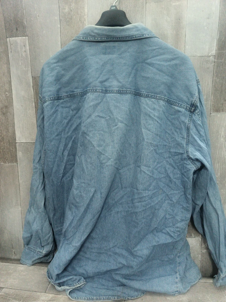 This vintage Levi's Red Tab denim shirt is a must-have for any fashion-savvy man. With a solid blue color and distressed detailing, this shirt is perfect for a casual, preppy look. The long sleeves and collared neckline make it suitable for all occasions, from work to parties. Made from comfortable, machine-washable cotton, this shirt features a spread collar and embroidered logo accents. The size is XXL, and it is part of the Levi's Red Tab product line. Whether you're going for a Western or classic look, this shirt is the perfect addition to your wardrobe.