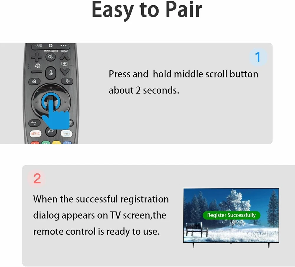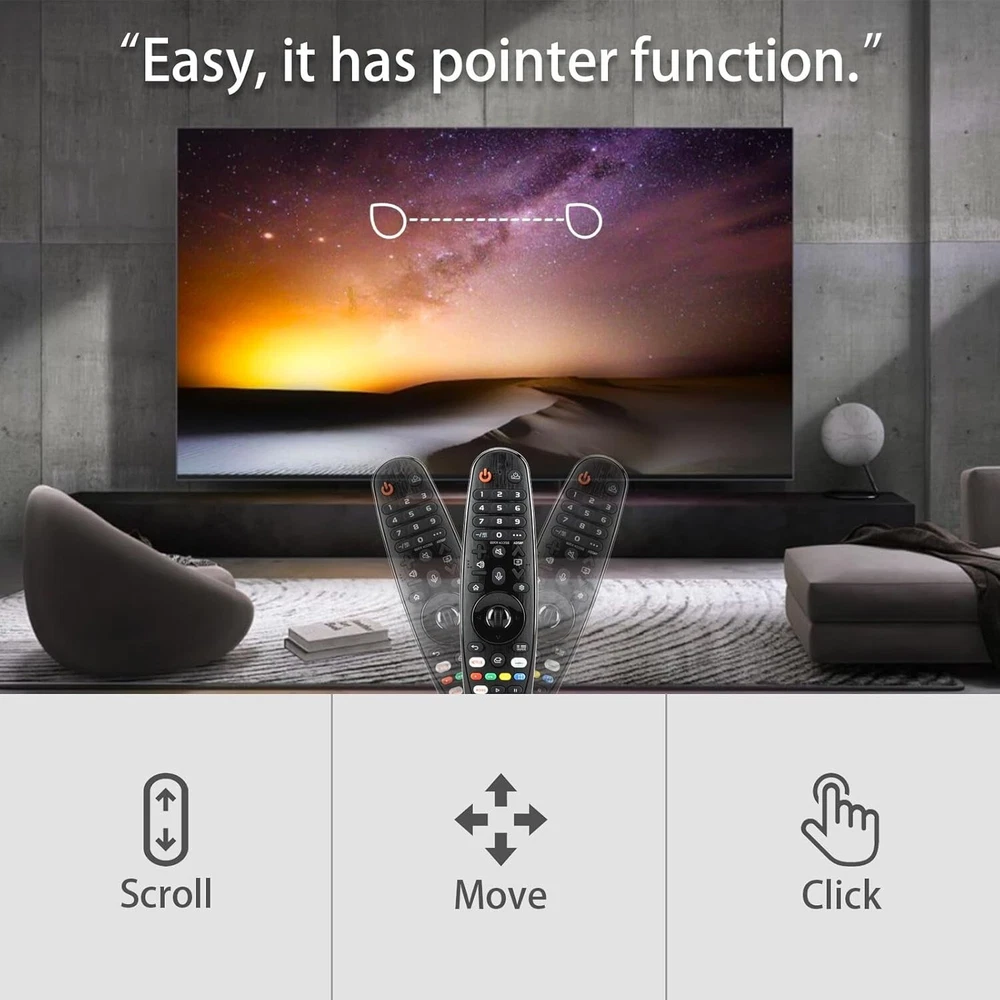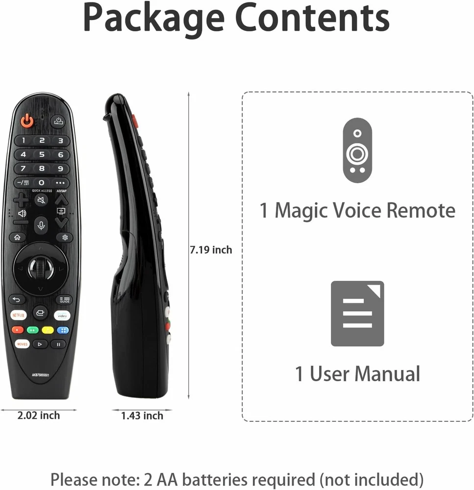 LG Magic Remote for Smart TV, Compatible MR20GA & MR19BA Voice & Pointer Function NEW Compatible with: for existing LG smart TVs from 2019 to 2023 with Voice and Pointer Functions, LG, LED, OLED, LCD 4K UHD TV Voice and Pointer Functions: Use voice commands to find your favorite content faster than ever before. Move the pointer to your desired location and press the wheel (OK) button to execute the function Easy to use: Insert 2 AA 1.5V batteries into the Magic Remote, then press and hold the middle scroll button for about 2 seconds. When the successful registration dialog appears on the TV screen, the remote control is ready to use Package Contents: 1 Replacement Voice Remote, 1 User Manual (Batteries not included: requires 2 AA batteries).
