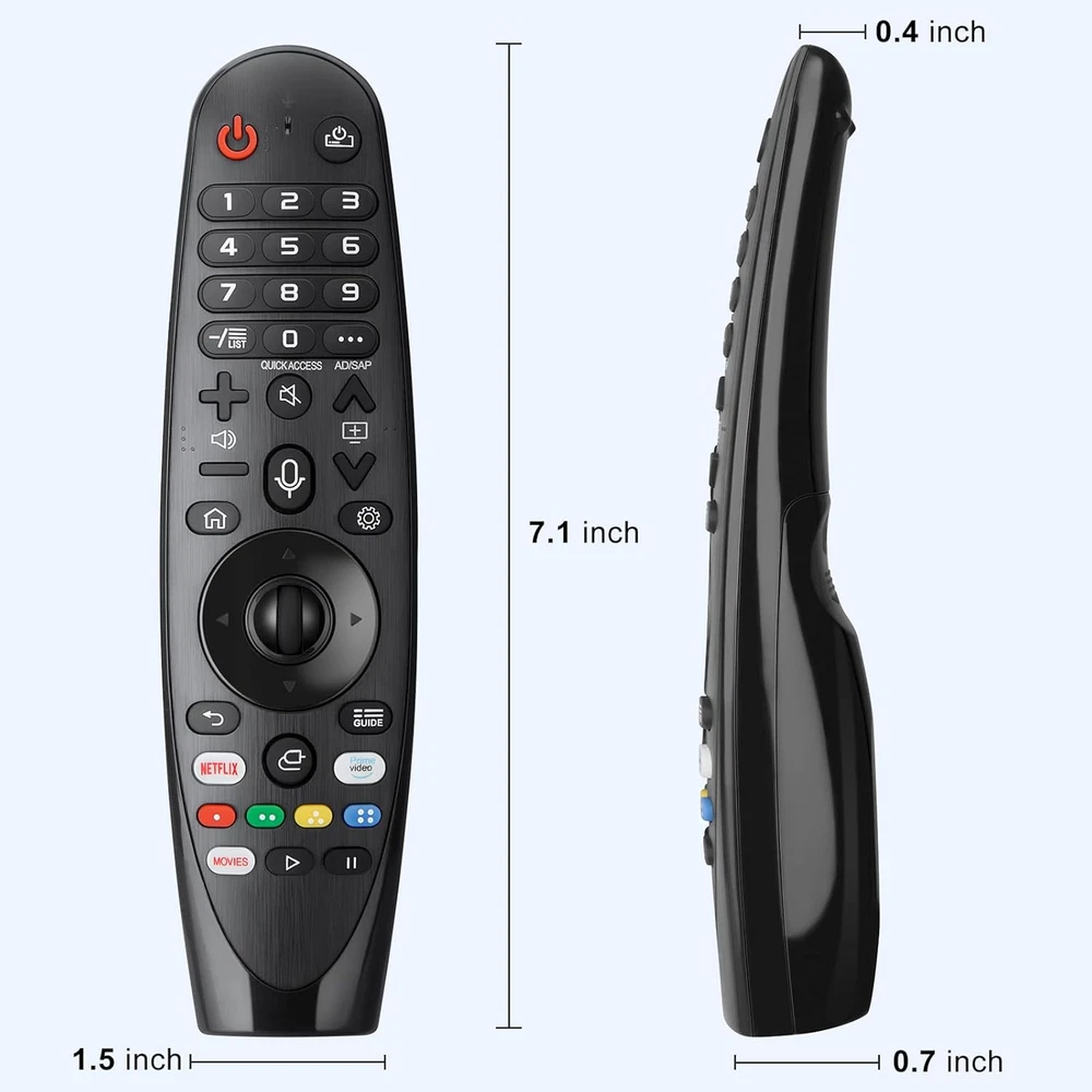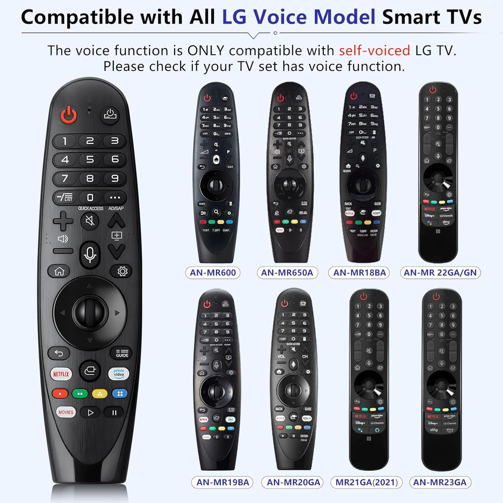 Vioce Magic remote for LG Smart TV Remote Control Replacement, with Pointer and Voice Control,Compatible with LG AN-MR24GA AN-MR23GA AN-MR22GA/GN AN-MR21GA AN-MR20GA AN-MR19BA AN-MR18BA AN-MR650 AN-MR600 TV Remote Compatible Models : Replacement for lg magic remote control for smart TV,Compatible with LG TV Models : ZX, WX, GX, CX, BX, W9, E9, C9, B9, NANO99, NANO97, NANO95, NANO91, NANO90, NANO86, NANO81, NANO80, SM99, SM95, SM90, SM86, SM81, UN85, UN81, UN80 UN74, UN73, UN71, UM80, UM75, UM73, UM71, UM6970 series EASY TO PAIR : Please follow the steps below for pairing: 1, Put a new pair of AA batteries (Not included) in to the Magic Remote and turn the TV on. 2, Press and hold the HOME and BACK buttons at the same time for 5 seconds, to unpair the Magic Remote with your TV. 3, Point the Magic Remote at your TV an dpress the Wheel (OK) on the remote control STABLE PERFORMANCE : Professionally tested, Voice Magic Remote Control for LG TV All-around control of your TV , precise control from distances up to 40 feet, fastest response to your TV in less than 0.1 seconds, and more than 120,000 clicks per button PACKAGING & SERVICES : Includes 1* Voice Magic remote control and 1* Instruction Manual (NOT including batteries) We provide 100 Days After-sales. If there are any questions, you could contact us in time, we will reply to you within 12 hours and will be happy to help you Product Description
