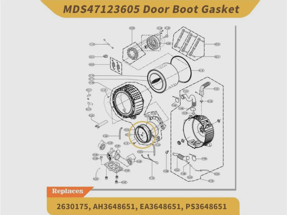 New SealPro Washer Door Bellow For LG MDS47123605 2630175 PLEASE ASK US IF YOU ARE NOT SURE ABOUT COMPATIBILITY ***EXCLUDE PR, HAWAII, ALASKA,GUAM*** ***EXCLUDE WEEKENDS*** ***CUT-OFF TIME 1PM CENTRAL*** ***EXPRESS ORDERS CANNOT BE CANCELLED*** Product Details This part works with the following brands: LG, Kenmore. Part Number MDS47123605 (AP5602285) replaces 2630175, AH3648651, EA3648651, PS3648651. This gasket is made by SealPro
