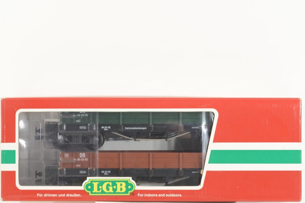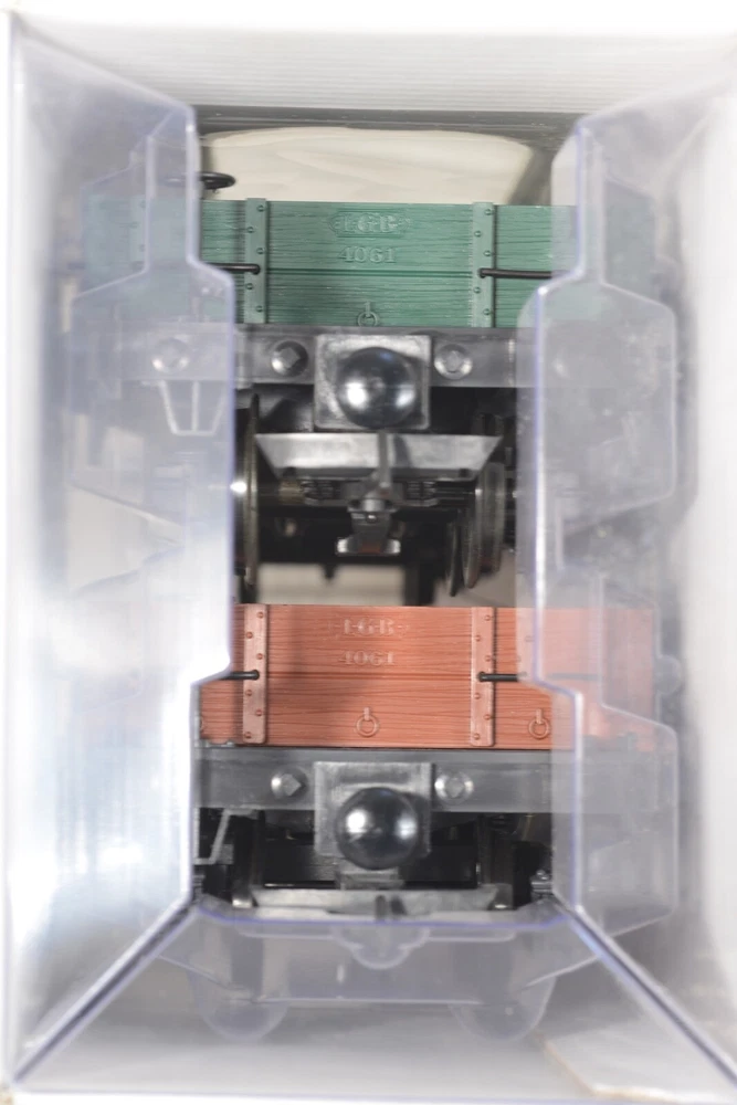 Wheels show light indoor use. Otherwise as NEW. Very unusual set. American Low Side Gons w/a Euro buffer and German Markings. I had intended to repaint these for Uintah but never got around to it.