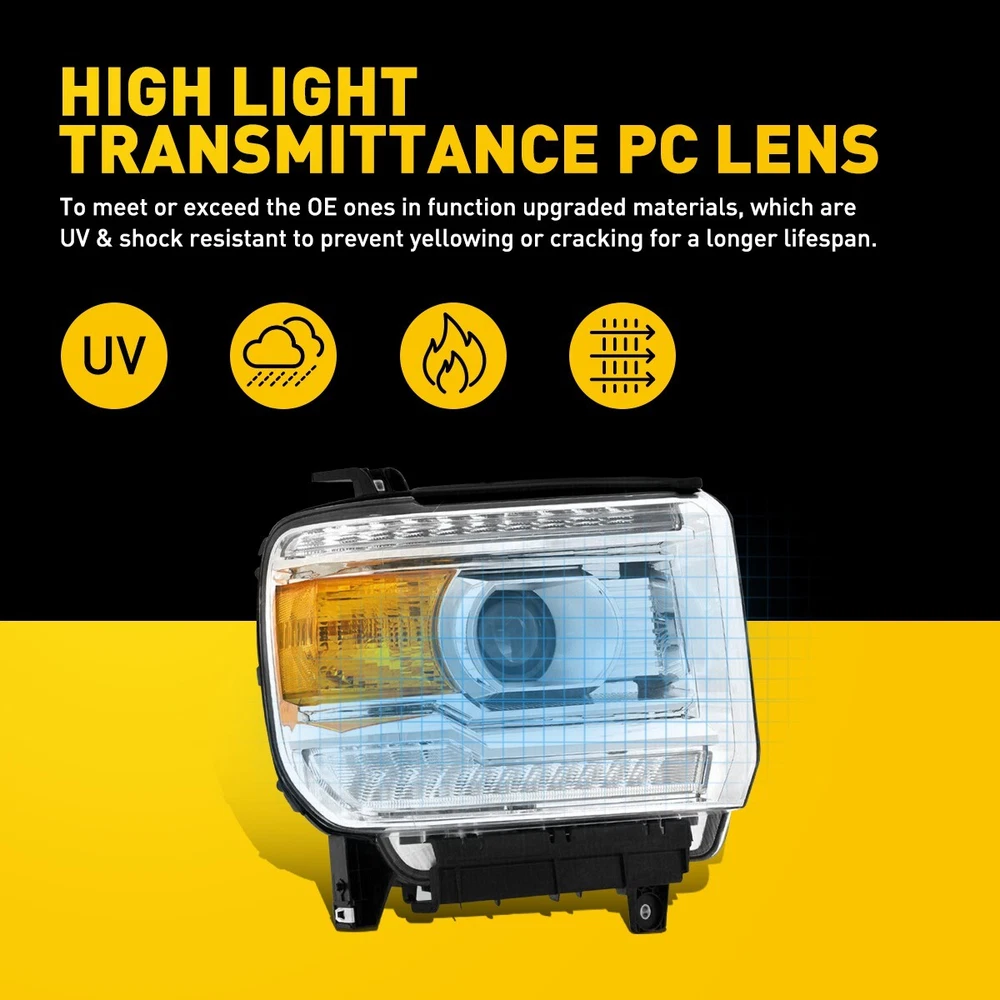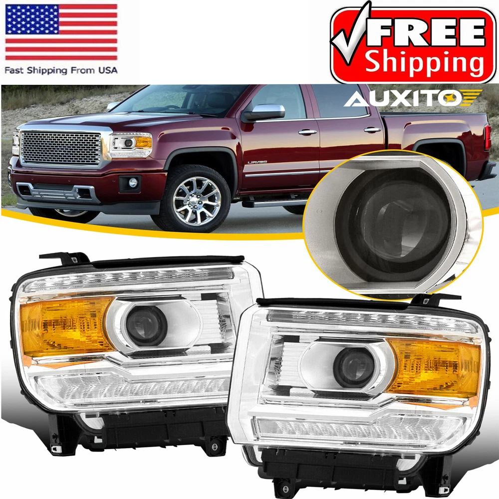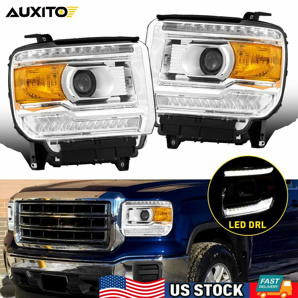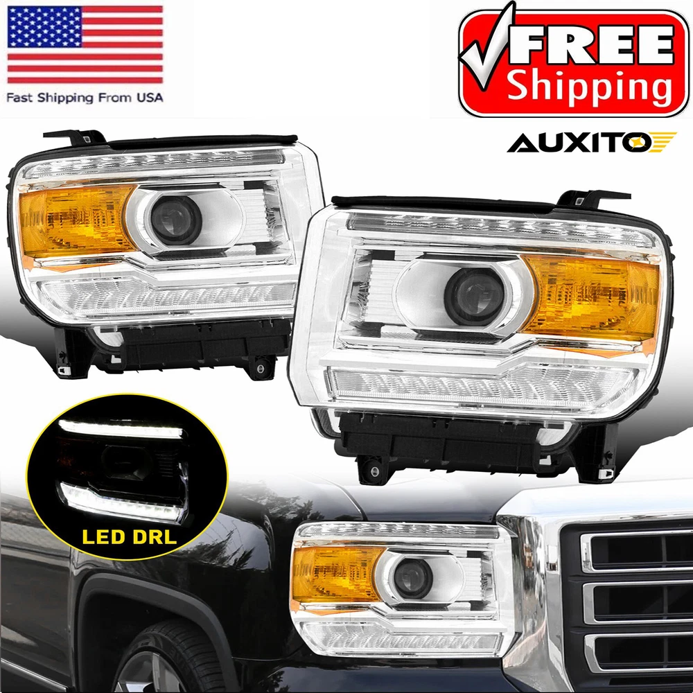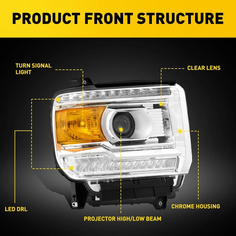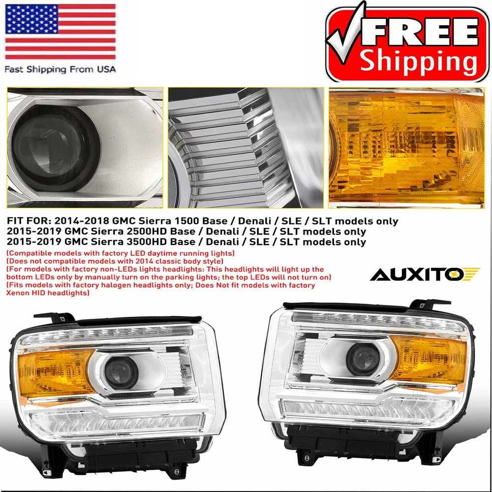Fit for: 2014-2018 GMC Sierra 1500 Base / Denali / SLE / SLT models only 2015-2019 GMC Sierra 2500HD Base / Denali / SLE / SLT models only 2015-2019 GMC Sierra 3500HD Base / Denali / SLE / SLT models only (Compatible models with factory LED daytime running lights) (Does not compatible models with 2014 classic body style) (For models with factory non-LEDs lights headlights: This headlights will light up the bottom LEDs only by manually turn on the parking lights; the top LEDs will not turn on) (Fits models with factory halogen headlights only; Does Not fit models with factory Xenon HID headlights) Specifications: OE number: GM2502390, GM2503390, GM2502394, GM2503394 LH+RH For 2014-2018 GMC Sierra 1500 2500 3500 Amber LED DRL Head Lights Headlamp Fit for: 2014-2018 GMC Sierra 1500 Base / Denali / SLE / SLT models only 2015-2019 GMC Sierra 2500HD Base / Denali / SLE / SLT models only 2015-2019 GMC Sierra 3500HD Base / Denali / SLE / SLT models only (Compatible models with factory LED daytime running lights) (Does not compatible models with 2014 classic body style) (For models with factory non-LEDs lights headlights: This headlights will light up the bottom LEDs only by manually turn on the parking lights; the top LEDs will not turn on) (Fits models with factory halogen headlights only; Does Not fit models with factory Xenon HID headlights) Specifications: OE number: GM2502390, GM2503390, GM2502394, GM2503394 23130715, 23130716, 23130717, 23130718 Material: ABS+PC (ABS Plastic Housing/Polycarbonate lens) Appearance color: 1.Housing Color: Chrome 2.Lens Color:Clear 3.Reflector Color:Amber Note: Projector √(Include) DRL √ (Include) Bulb × (Not include) Features: *Easy to install: Direct replacement, drilling and cutting are not required. *Superior quality: Made of ABS and PC materials with toughness and heat resistance functions to ensure its long service life and durability. *Angle adjustment: Equipped with a headlamp Angle adjustment knob, you can adjust the best Angle of view through the knob. *Suggestion: 1.Please confirm the OE number before purchasing!!! 2.Professional installation is required!!! Packaging include: Headlights*2(Left+Right) ABOUT US LH+RH For 2014-2018 GMC Sierra 1500 2500 3500 Amber LED DRL Head Lights Headlamp Fit for: 2014-2018 GMC Sierra 1500 Base / Denali / SLE / SLT models only 2015-2019 GMC Sierra 2500HD Base / Denali / SLE / SLT models only 2015-2019 GMC Sierra 3500HD Base / Denali / SLE / SLT models only (Compatible models with factory LED daytime running lights) (Does not compatible models with 2014 classic body style) (For models with factory non-LEDs lights headlights: This headlights will light up the bottom LEDs only by manually turn on the parking lights; the top LEDs will not turn on) (Fits models with factory halogen headlights only; Does Not fit models with factory Xenon HID headlights) Specifications: OE number: GM2502390, GM2503390, GM2502394, GM2503394 23130715, 23130716, 23130717, 23130718 Material: ABS+PC (ABS Plastic Housing/Polycarbonate lens) Appearance color: 1.Housing Color: Chrome 2.Lens Color:Clear 3.Reflector Color:Amber Note: Projector √(Include) DRL √ (Include) Bulb × (Not include) Features: *Easy to install: Direct replacement, drilling and cutting are not required. *Superior quality: Made of ABS and PC materials with toughness and heat resistance functions to ensure its long service life and durability. *Angle adjustment: Equipped with a headlamp Angle adjustment knob, you can adjust the best Angle of view through the knob. *Suggestion: 1.Please confirm the OE number before purchasing!!! 2.Professional installation is required!!! Packaging include: Headlights*2(Left+Right) FAQ Shipping Returns Contact Us Payment Why swith to LED? LEDs not only give your vehicle a clean, modern look but, with proper use, will outlast any halogen bulb and HID bulb! Low energy draw, high lumen output, and instant on/off LED technology out shines stock bulbs in every way. Which bulbs are used in my vehicle? Check Sylvania automotive lamp replacemnt guide , you can select the year, make, and model of your vehicle, then select the application you want to replace or upgrade from stock. What does CAN Bus mean? CAN Bus means Controller Area Network Bus. This system monitors your vehicle and reports operating conditions. CAN Bus systems are commonly found in European vehicles such as BMW, Audi, Mercedes, Volkswagen, Porsche, and in many American vehicles. While most late model American vehicles have CAN Bus systems, it is always good to check with your vehicle dealer to see which system your vehicle has before purchasing electrical products. When do you need Warning Canceller? Some vehicles with cmplex internal computers(such as Audi,BMW,Jaguar,Mercedes,etc.) might report on-dash errors or flickering on the headlights. The warning canceller fixes the dashboard warning and flickering effect. Bulb Out Dashboard Error: On some vehicles, the dashboard will report as if you have a headlight bulb missing or burnt. It does not affect the headlights functioning, but the light on-dash will be on. The warning canceller fixes the issue. Flickering Issue: This happens when your vehicle does not recognize the new headlights installed. When turning the headlights on, the vehicle's computer does not understand the signal back from the headlights hence thinking they are still off. This triggers the headlight flickering effect. The warning canceller solves this issue. LED Advantages: Very low and efficient energy consumption than halogen bulbs & HID Bulbs Compared with HID bulbs, LED bulbs Light up instantly, no warm up period Low voltage protection, high precision constant current driver chip Longer lifespan than HID and halogen bulbs Light can be controlled easily in color and intensity Easy to install a LED headlight conversion kit (1) We will ship your item(s) within 24 hours. (2) We ship this item to US only via USPS first class mail. It usually takes 3-6 working da