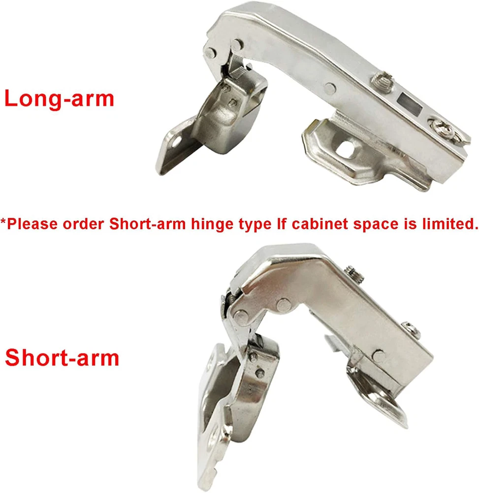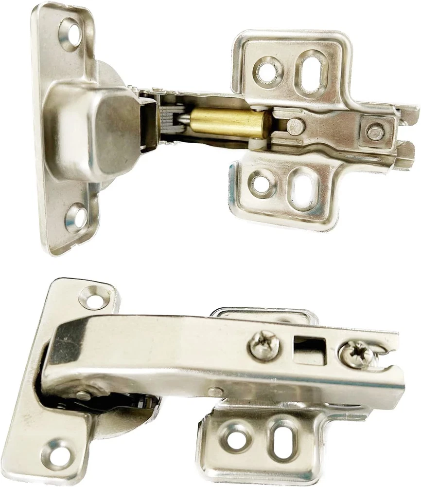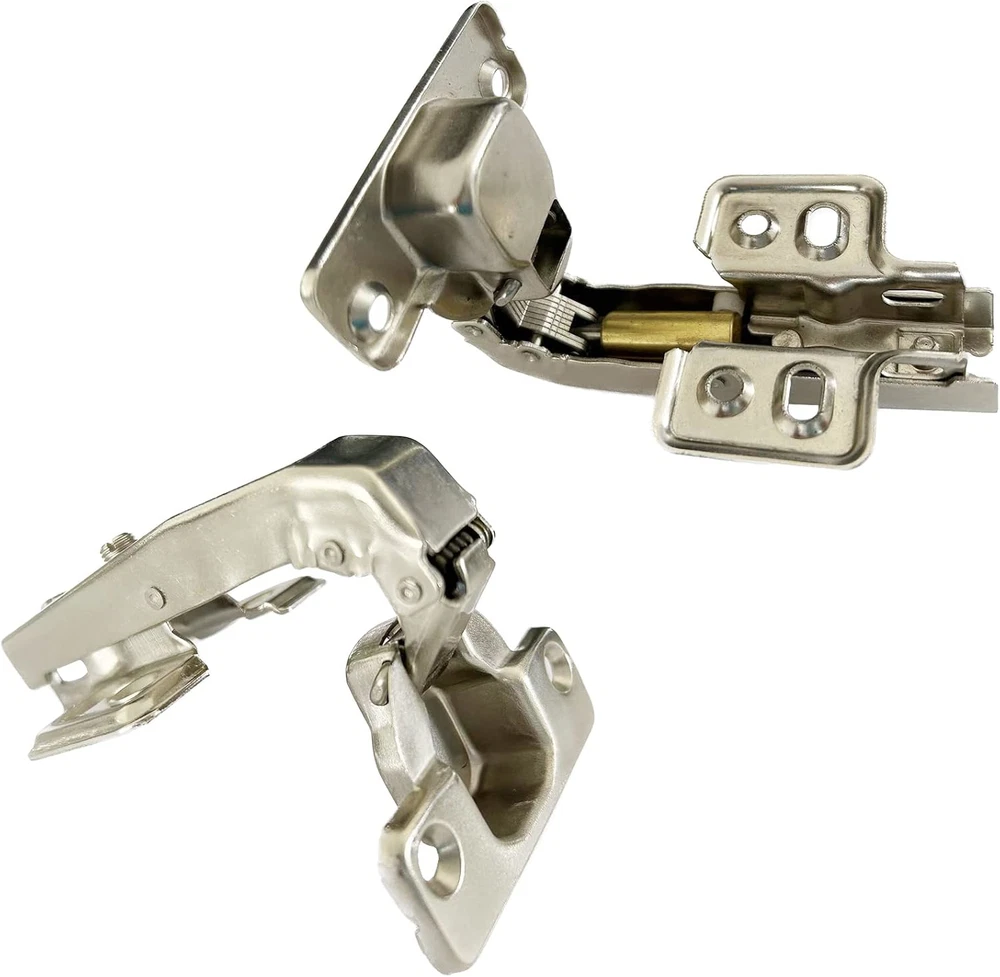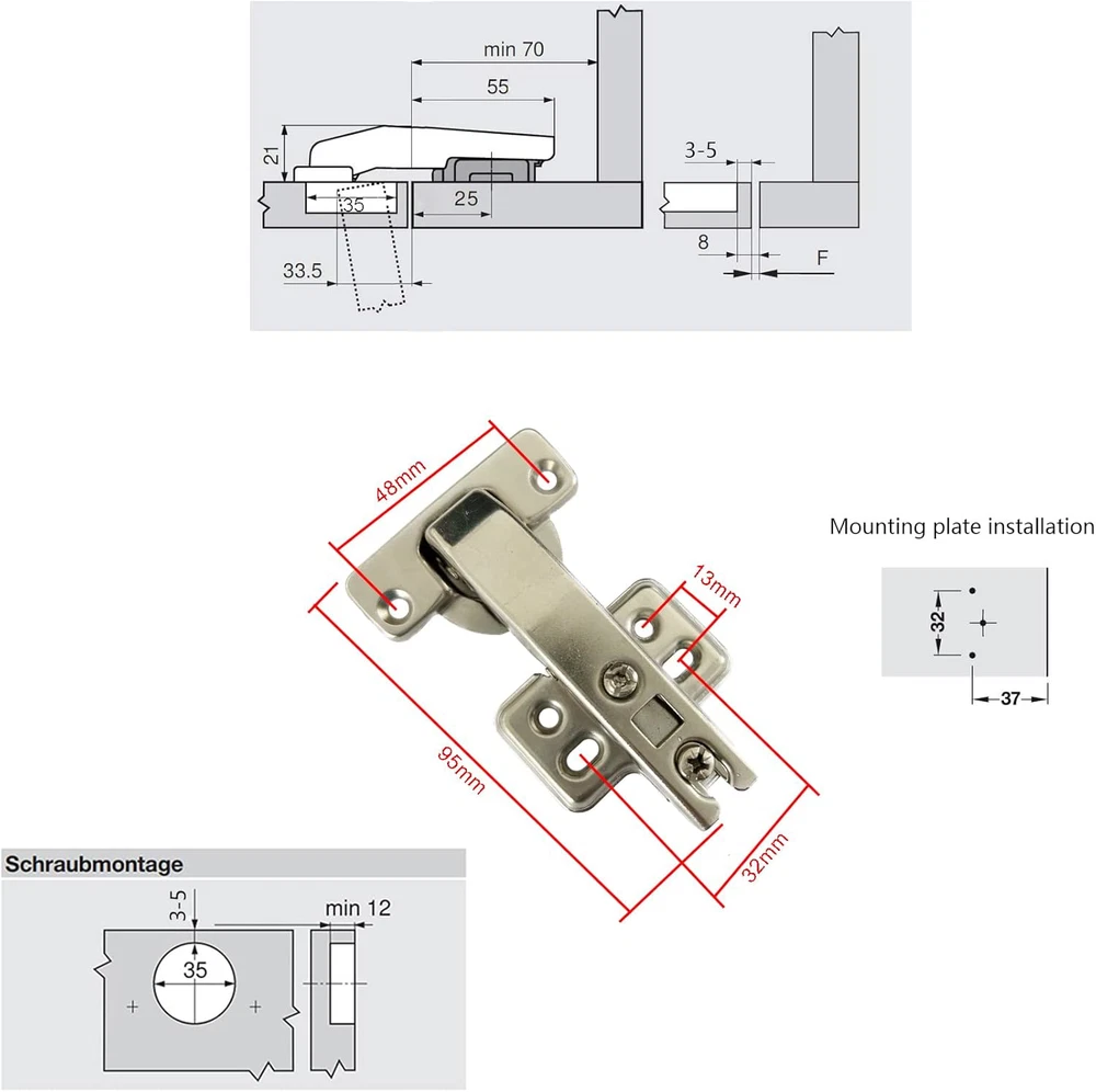 LIKERAINY 95Deg Inset Blind Corner Hinge 35mm with Hydraulic Damper for Cabinet Long-arm Blind-corner hinge with screw fixing for kitchen corner folding cabinet doors Soft Close integrated system can prevent from noise or slam when closing the doors Concealed furniture hinge for studs, Opening angle 95??, Pot strap, for cabinet door For Door Thickness 16-22mm; Cup diameter ?? 35mm; Cup depth 11.5mm; Type: Internal stop; Base height: H=2 Made of stainless steel; Nickel plating; Hinge for studs constructions; Non-detachable mounting plate Product Dimension -Article type: LIKERAINY inset blind corner hinges with soft close damper -Mounting plate: Non-detachable (not clip on or slip on) -Material: Stainless steel -Opening angle (??): 95 Degree -Cup drilling version: 48mm / 6.5mm -Cup diameter: ?? 35mm -Cup Depth: 11.5mm -Stop type: Inside stop / Inset -DISTANCE between the two screw holes (next to the cup): 48mm -Mounting option: for screwing on -For depth of side panel (min.): 45mm (see photo above) -For door thickness: 16mm (min.) ??? 22mm (max.) -Integrated overlay adjustment: +2.5 mm / -2.5 mm -Integrated depth adjustment: +2.0mm / -2.0 mm -Hinge cup/arm finish: Nickel plated -Cover cap for carcass: NO -Cover cap for hinge cup: NO -Fast installation: Yes Package -Blind-corner Long-arm hinges: 4 Pieces -with mounting screws -No mounting instruction and processing information (see photos above)