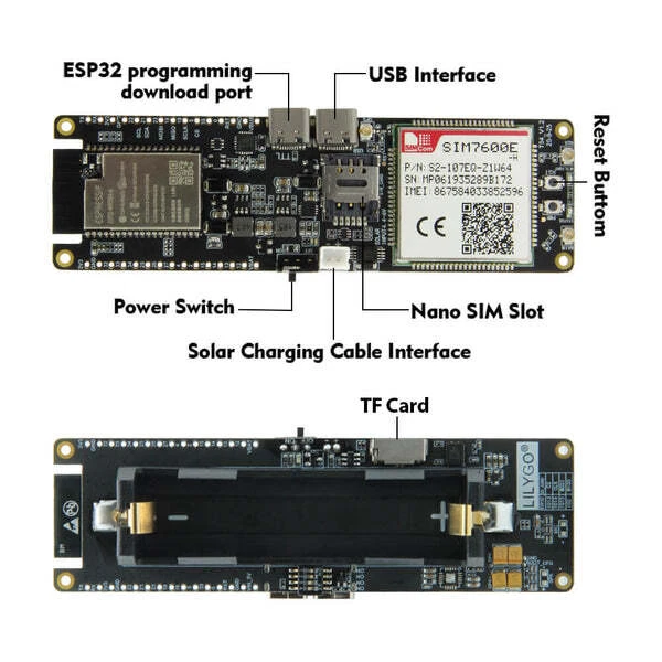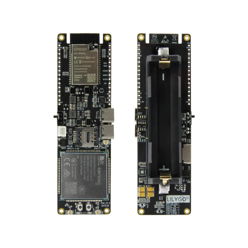 LILYGO® T-SIM7600G-H R2 / T-SIM7600E-H Overview The T-SIM7600 is a wireless networking module that supports WiFi, Bluetooth, 4G LTE CAT4, GPS The T-SIM7600X-H significantly enhances speed, with LTE download/upload rates improved from 10/5 Mbps to 150/50 Mbps. This module includes a 18650 battery holder and a solar charging interface. It also features two USB Type-C ports: one for programming the main chip and another for using the SIM7600E-H as a USB dongle network card. Battery protection is built in to prevent incorrect connections, overcharging, and over-discharging. GPS power control minimizes power consumption, down to 300µA in sleep mode. The charging IC has been upgraded to support solar charging. Technology Support For technical assistance, please visit our Github page: https://github.com/Xinyuan-LilyGO/T-SIM7600X Package Contents 1 x T-SIM7600E-H CH9102 1 x SIM antenna 1 x GPS antenna 1 x Power cable 2 x Pin 1 x T-SIM7600G-H 2R CH9102 1 x SIM antenna 1 x GPS antenna 1 x Power cable 2 x Pins Please do not hesitate to ask any questions!