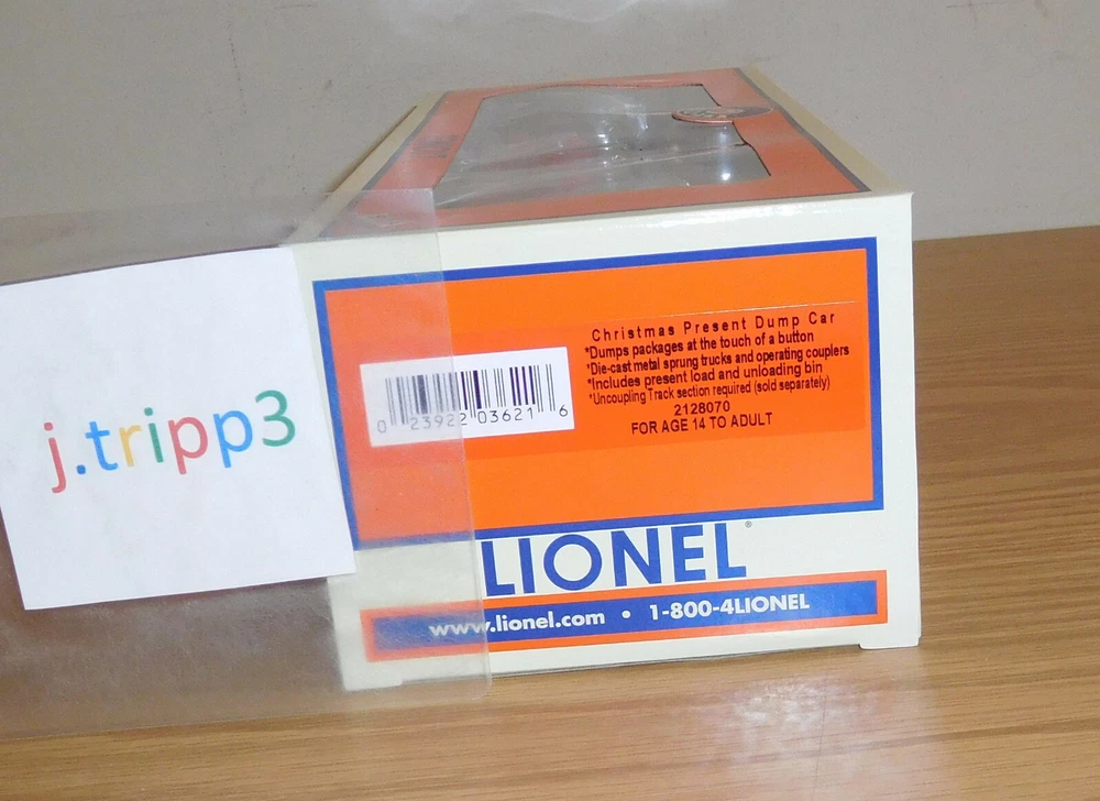 LIONEL CHRISTMAS LIONEL #2128070 Christmas North Pole Central Lines Present Dump Car O Gauge Train produced in 2021. Add on to your Christmas layout with this festive Present Dump Car! Dumps presents at the touch of a button Uncoupling Track section required (sold separately) Die-cast metal trucks and operating couplers Includes unloading bin PRODUCT SPECIFICATIONS Gauge: O Gauge Min Curve: O27 Dimensions: Length: 11 1/2" Brand New with Original Box SHIPPING: & Insurance will be a flat rate or Actual cost (shown above) to your location for UPS or USPS service in the lower 48 U.S. States. Alaska, Hawaii, US territories, & APO addresses will require an additional cost. Please wait for an invoice reflecting this. International Shipping will be sent through the eBay Global Shipping Program due to the simplicity of the program. Tracking information will be added to the auction listing once payment is received and a label is created for the shipment. COMBINE SHIPPING: If multiple auctions are won, items will be combined whenever possible to save you money on shipping expense. NOTE: Some items can’t be combined and will be documented in the item description. PLEASE WAIT for a combine item purchased invoice before sending payment. Once payment is made, the auctions are considered closed and will ship within 24hrs (or next business day) in accordance to eBay shipping policy. Because of this, we can’t hold paid items to ship together. PHOTOS: Shown are actual items of product for sale. View pictures as part of the item description. PAYMENT: must be received within 5-days of the end of auction. If payment is not received within 5-days, a non-paying bidder alert will be filed with eBay and non-payment also results in a block of future bidding with us. RETURNS: Due to eBay requiring a 30-day return policy, we now charge a 20% re-stocking fee on any sealed items that have been opened and on listed items as ‘NEW’ that have been opened and used. Ask questions, know and understand the product(s) being purchased. If there is something wrong with your purchase or the item was received damaged, please contact us through eBay messaging before opening up a return request through eBay. Most issues can be rectified through a conversation. We are a family owned business trying to make a living. Mistakes & Errors do happen even though we try very hard to prevent it. Our descriptions are a reflection of this regarding the details we give about an item. FEEDBACK: We encourage you to leave ‘’Positive Feedback” once the transaction has been completed and you received the item. We always leave Positive Feedback, once it is left, informs us that you received your purchase and are satisfied. If you have a problem with what was received, please contact us through eBay messaging so we can rectify the issue.