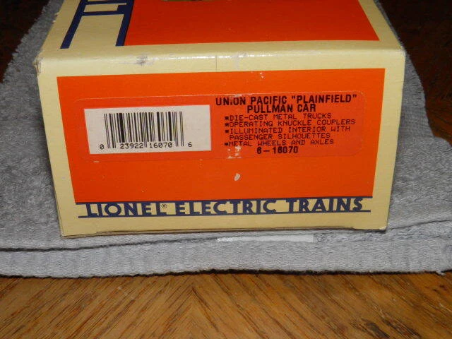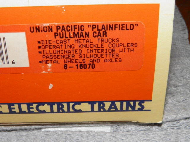 Payment | Shipping | Policies LIONEL 6-16070 UNION PACIFIC PLAINFIELD PULLMAN CAR LIGHTED NIB/UNRUN EXCELLENT HERE WE HAVE LIONEL 6-16070 UNION PACIFIC PLAINFIELD PULLMAN CAR LIGHTED WITH ALL PAPERWORK. THIS IS NIB AND UNRUN. I DON'T THINK THIS HAS EVER BEEN REMOVED FROM THE BOX FROM THE LOOKS OF IT. THIS IS IN EXCELLENT LOOKING CONDITION. THIS IS READY TO BE USED ON YOUR LAYOUT. THE BOX IS IN GOOD SHAPE. THIS HAS SOME SHELF & WEAR ISSUE DUE TO AGE. THIS WAS BOUGHT AND THEN PUT AWAY WITHOUT EVER BEING USED. T HIS IS AN ESTATE SALE FIND. PLEASE SEE THE PICS OF THIS PULLMAN CAR BELOW AND FOR CONDITION AS THEY ARE PART OF THE DESCRIPTION FOR THIS. GET YOUR BIDS IN NOW BEFORE IT IS TOO LATE. THIS WOULD MAKE A NICE GIFT FOR THAT SPECIAL COLLECTOR IN YOUR FAMILY. PLEASE SEE ALL THE PICS BELOW OF THIS ONE AND YOU BE THE JUDGE. THIS PULLMAN CAR COMES AS IS. PLEASE CHECK OUT MY OTHER AUCTIONS FOR SOME VERY NICE ANTIQUE'S, TRAINS, AND TOYS TO ADD TO YOUR COLLECTION. YOU WILL NOT BE DISAPPOINTED. PLEASE BE SURE TO WATCH MY UP COMING AUCTIONS FOR SOME NICE LIONEL, AMERICAN FLYER, AND MARX TRAINS. I WILL BE PUTTING OUT SOME NICE TRAINS IN THE UP COMING WEEKS. HERE IS A LIONEL 6-16070 UNION PACIFIC PLAINFIELD PULLMAN CAR F OR A SMALL OPENING BID. DON'T LET THIS ONE GET AWAY BEFORE IT IS TO LATE GET YOUR BIDS IN NOW. THIS PIECE COMES AS IS AND THERE WILL BE NO RETURNS ACCEPTED. PLEASE SEE ALL THE PICS AND IF YOU HAVE ANY QUESTIONS AT ALL PLEASE LET ME KNOW BEFORE BIDDING. I TRY MY BEST TO LIST ALL ISSUES WITH THE ITEMS I SELL. I MISS SOME ISSUES SOMETIMES SO PLEASE SEE ALL PICS AND ASK QUESTIONS BEFORE BIDDING. PLEASE BE SURE TO LEAVE POSITIVE FEEDBACK AND A 5-STAR RATING FOR ALL CATEGORIES LISTED. I TRY TO SELL QUALITY TOYS, TRAINS AND ANTIQUES FOR A REASONABLE PRICE AND NO RESERVES ON JUST ABOUT ALL ITEMS I SELL. I AM TRYING TO MAKE THIS AS EASY FOR THE BUYER AS POSSIBLE WITH LOTS OF PICTURES AND DETAILED DESCRIPTIONS OF THE ITEM AND OR ITEMS YOU ARE BIDDING ON. IF FOR ANY REASON YOU CAN'T LEAVE A 5 STAR RATING. PLEASE LET ME KNOW THE REASON WHY. I TAKE CUSTOMER SERVICE SERIOUSLY AND I WANT YOU TO BE SATISFIED WITH BUYING YOUR TOYS, TRAINS, AND ANTIQUES FROM ME. PLEASE SEE SCAN OR PICTURES FOR THE ITEM LISTED IN THIS AUCTION. YOU ARE ONLY BIDDING ON THE ITEM LISTED IN THIS AUCTION ONLY. SEE BELOW FOR PAYMENT, S/H, AND POLICIES. *****PLEASE NOTE IF YOU HAVE LESS THEN A 20 FEEDBACK RATING YOU MUST CONTACT ME FIRST BEFORE BIDDING ON ANY OF MY AUCTIONS. NONE OF THE BELOW POLICIES WILL APPLY IF YOU BID WITHOUT CONTACTING ME FIRST. I HAVE THE RIGHT TO CANCEL ANY BID AT MY DISCRETION. ***** I DO NOT SHIP INTERNATIONAL. PLEASE DO NOT ASK. IF YOU ARE THE WINNER OF ANY OF MY AUCTIONS YOU WILL RECEIVE A WBN AND EBAY INVOICE WITH YOUR TOTAL DUE WITHIN 24 HOURS OF AUCTION END. PLEASE FOLLOW THE EBAY CHECKOUT. THIS WILL HELP TO ENSURE YOUR ITEMS ARE MAILED OUT WITH NO DELAYS. THANK YOU AND GOD BLESS!!!! ****PLEASE NOTE PAYMENTS ARE DUE WITHIN 3 DAYS OF AUCTION END. PLEASE BE SURE YOU CAN PAY WITHIN 3 DAYS AS THERE WILL BE NO EXCEPTIONS TO THIS UNLESS YOU CONTACT ME WITH ANY PROBLEMS IN PAYING IN 3 DAYS.**** Payment Back to Top ALL PAYMENTS ARE DUE 3 DAYS FROM AUCTION END. IF THERE IS A PROBLEM PAYING WITHIN 3 DAYS PLEASE LET ME KNOW AND SOMETHING CAN BE WORKDED OUT. I accept the following forms of payment: PayPal Shipping & Handling Back to Top I WILL COMBINE S/H COSTS FOR MULTIPLE LOT WINNERS TO SAVE ON THE S/H. THIS WILL APPLY TO ALL AUCTIONS THAT END ON SUNDAY. I DO NOT HOLD AUCTIONS FROM WEEK TO WEEK. S/H FOR LOTS IS A FIXED PRICE AND IN MOST CASES WILL SHIP PRIORITY MAIL WITH DELIVERY CONFIRMATION AND INSURANCE. THERE ARE NO EXCEPTIONS TO THESE S/H COSTS SO PLEASE DO NOT ASK. ALL PACKAGES WILL NOW SHIP WITH DELIVERY CONFIRMATION. THIS IS INCLUDED IN THE S/H COST. $12.00 USPS Ground Advantage® Policies PAYMENTS Back to Top ****All payments for auctions must be received 3 days from auction end.**** There will be no exceptions to this. Please make sure your payment is received within 3 days. If there are any problems please email me and I will work out other payment arrangements if it is needed. I accept the following forms of payment. There are some restrictions to this so please take the time to read this. 1) Paypal This is the preferred method of payment. ****PLEASE NOTE ALL PAYPAL PAYMENTS MUST BE FROM A CONFIRMED ADDRESS**** If you pay with a non-confirmed address your payment could be refunded. If you prefer to not pay with paypal I will accept a postal MO as payment. Please contact me to let me know. Any questions regarding this policy please let me know. All policies are effective 10/12/17. SHIPPING Back to Top I ship with the USPS. I use all forms available from the USPS to deliver your package safely and quickly. In some cases items could be shipped via UPS. I DO NOT SHIP INTERNATIONAL. PLEASE DO NOT ASK. S/H charges are fixed for each item. I will combine S/H for all multiple auction winners. All items will ship priority mail or 1st class mail with delivery confirmation included. All lots & larger items will be shipped based on box diminions, weight and the winning buyers zip code. I try and get the S/H as close as possible. I do issues refunds for S/H when it is less than I charged the buyer for. Please see feedback as well for this. ****EFFECTIVE 1/01/15 ALL ITEMS AND PACKAGES WILL SHIP WITH DELIVERY CONFIRMATION. THIS IS INCLUDED IN THE S/H COST.**** I will not be held responsible for any lost, misdirected or damaged mail if you do not purchase any insurance for high value auctions. There are no exceptions to this. If your item is lost or damaged and you did not purchase any insurance it will be your loss. Any questions regarding this policy please let me know. All policies are effective 10/12/17 DELIVERY Back to Top I will ship out items won Tuesday and Wednesday following the auctions that end on Sunday. With payment due within 3 days of auction end your item will be shipped no later then Thursd