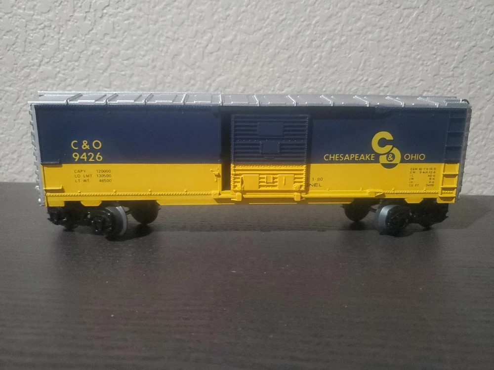This is a Lionel O gauge Chesapeake & Ohio boxcar model 6-9426. It is a multicolor plastic model from the 1980s, featuring operating couplers and sliding doors that increase the car's play value. The boxcar is compatible with any 3-rail O gauge track brand, making it a perfect addition to O gauge layouts and collections alike.