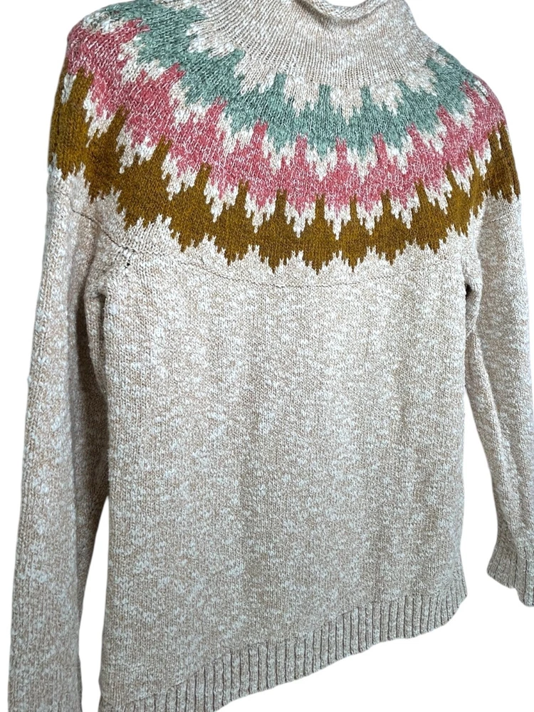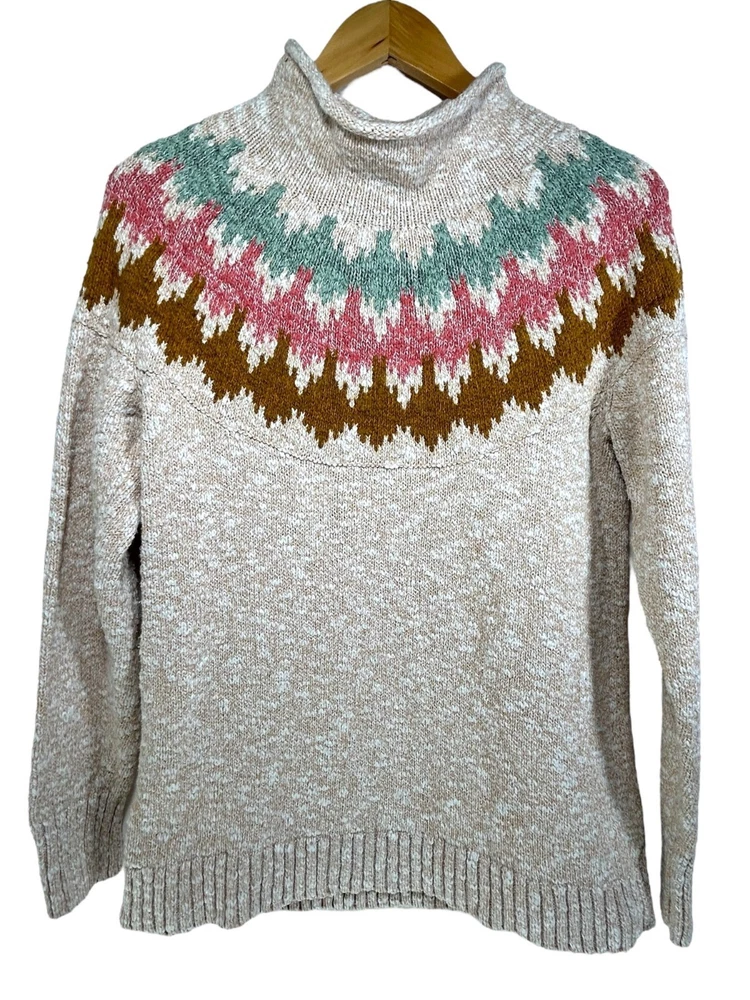 In excellent preowned condition with some signs of wear, neckline is light stretched out L.L Bean Mock Neck Fair Isle Stripe Sweater Womens M Beige-oatmeal with multicolored fair isle printed stripes Cotton knit fabrication Mock neck Long sleeves Thick fabric Relaxed through torso Great for layering Made with cotton Made in China Pit to pit: 17.25” across Full length: 28” #llbean #llbeansweater #mocknecksweater #fairisle #cottonknitsweater #LLBeansweaters #mocksweater #striped #multicolorsweater