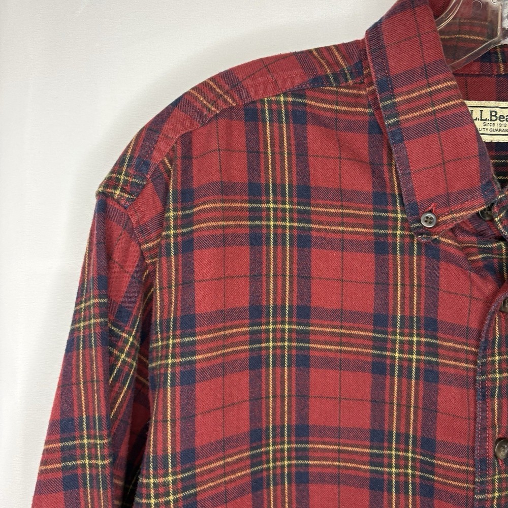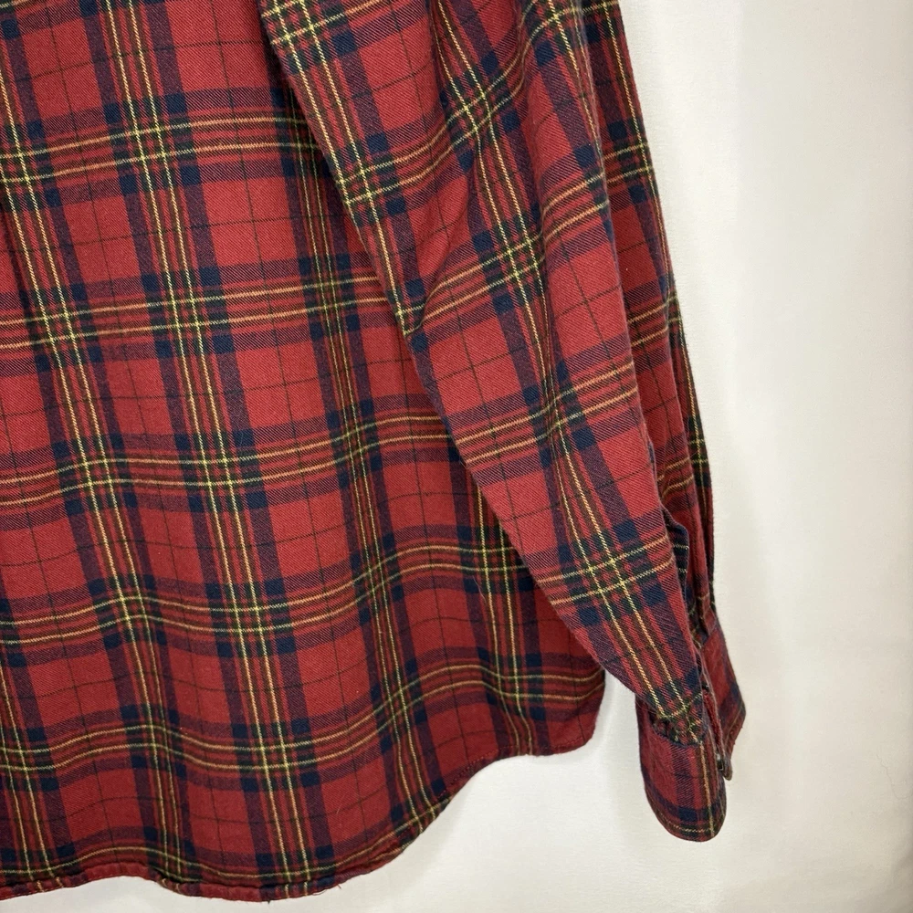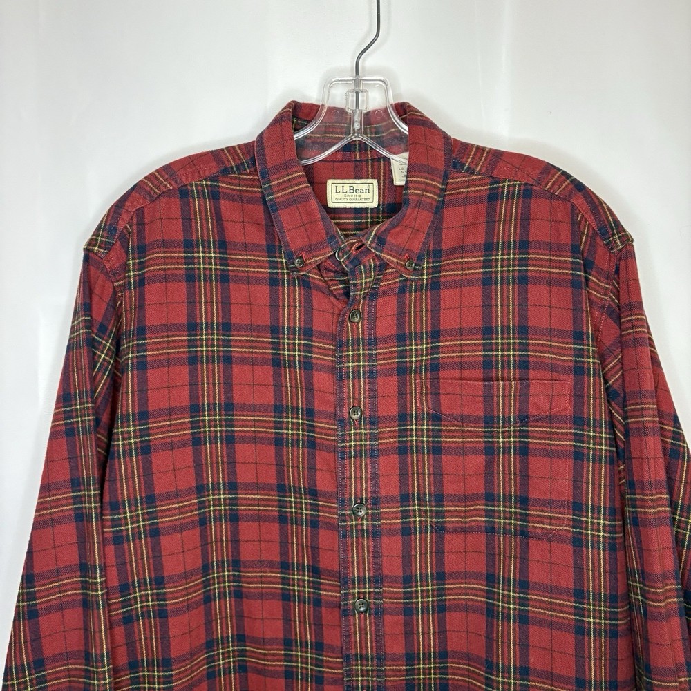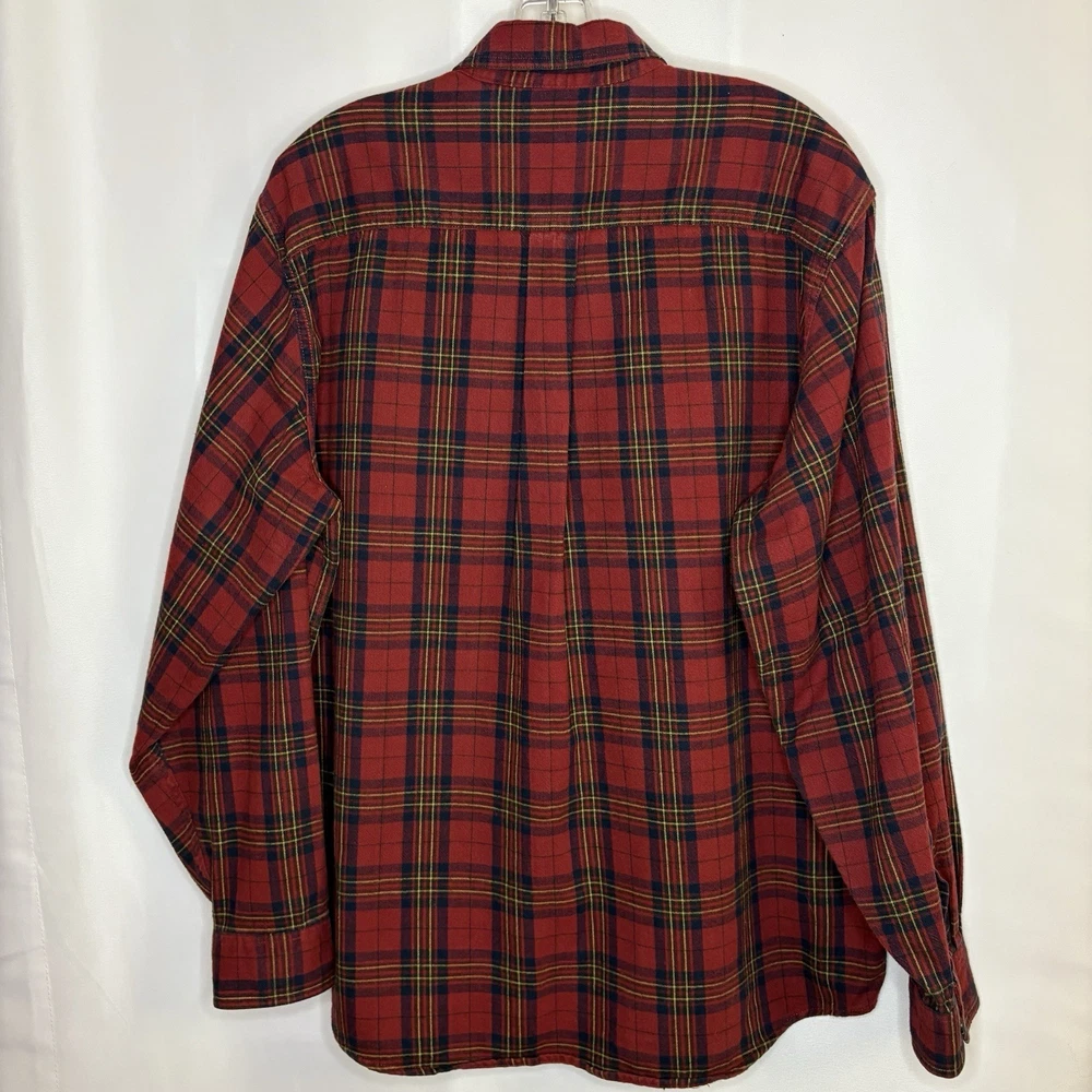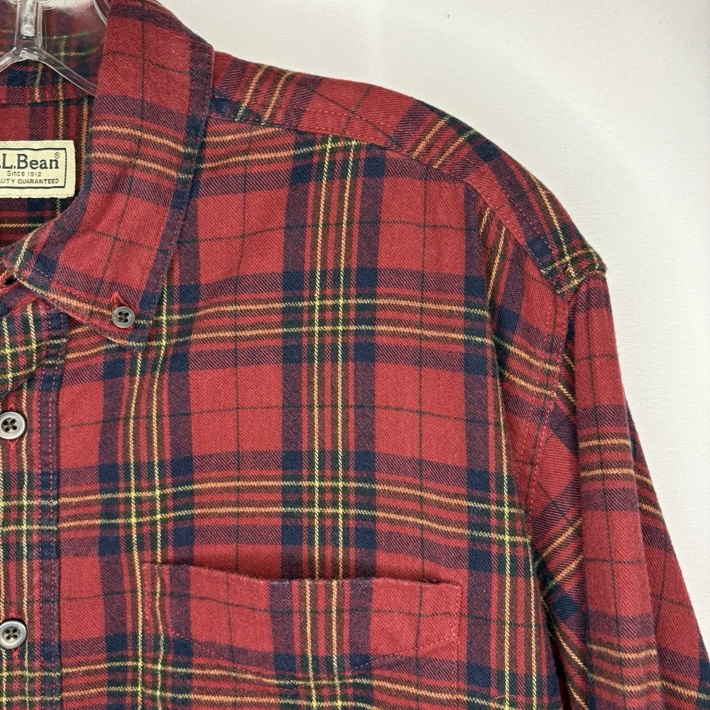Wrap up in the warmth of this classic LL Bean Men’s Scotch Plaid Flannel Shirt, a timeless addition to your wardrobe. With its long sleeves, collared neckline, and heavy-duty cotton flannel fabric, it’s ideal for those brisk fall days, chilly winter evenings, and even cool spring mornings. The shirt features a vibrant red, navy, and yellow plaid pattern that adds a pop of color to any outfit, making it perfect for casual wear, travel, or even a smart-casual work environment. The shirt is designed for comfort and durability with a regular fit and is machine washable for easy care. It boasts a button-up closure with a stylish point collar and is accentuated with a chest pocket, ensuring your essentials are always within reach. This piece is a versatile garment that combines the rugged charm of an American workwear staple with the timeless elegance of a classic button-up shirt. Length - 30 inch/76.5 cm Chest - 44 inch/112 cm Sleeve - 25 inch/64 cm
