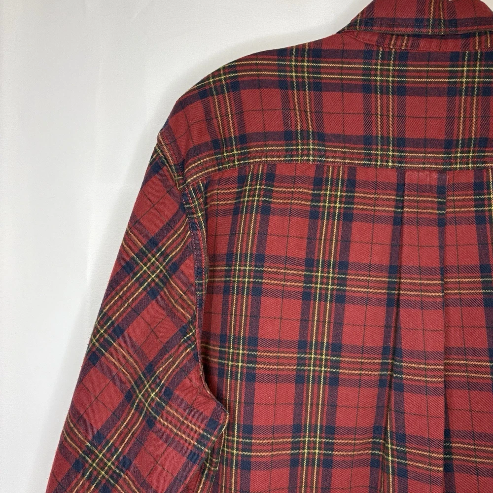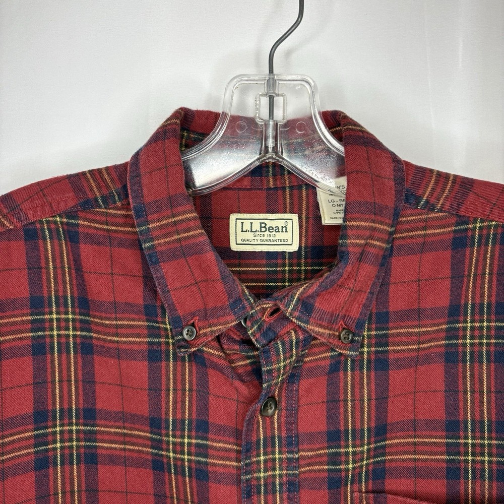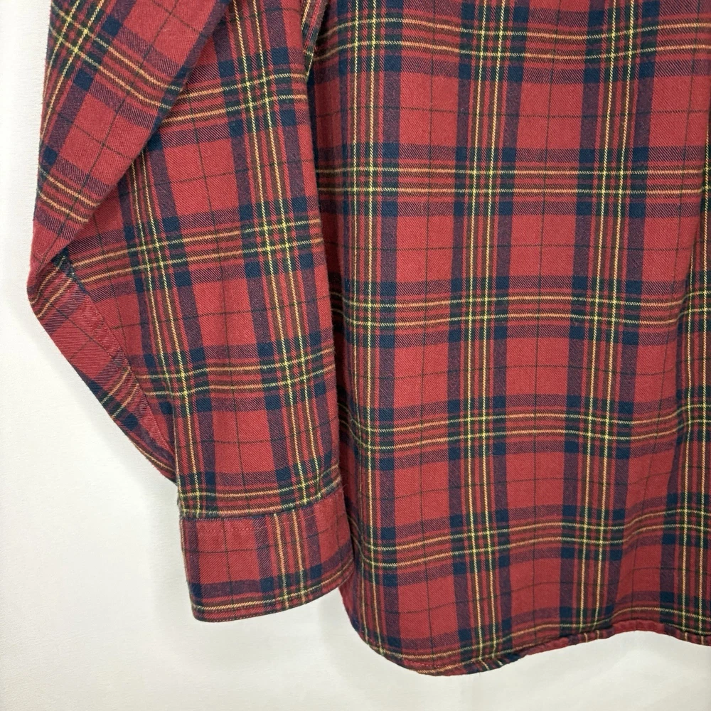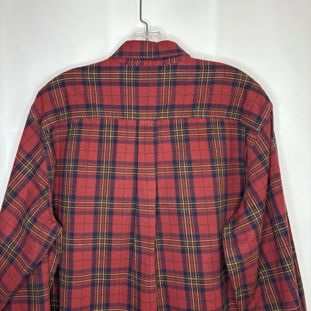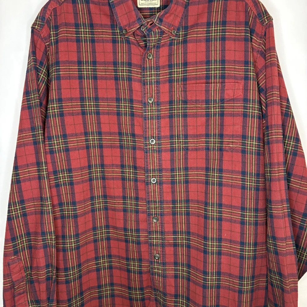 Wrap up in the warmth of this classic LL Bean Men’s Scotch Plaid Flannel Shirt, a timeless addition to your wardrobe. With its long sleeves, collared neckline, and heavy-duty cotton flannel fabric, it’s ideal for those brisk fall days, chilly winter evenings, and even cool spring mornings. The shirt features a vibrant red, navy, and yellow plaid pattern that adds a pop of color to any outfit, making it perfect for casual wear, travel, or even a smart-casual work environment. The shirt is designed for comfort and durability with a regular fit and is machine washable for easy care. It boasts a button-up closure with a stylish point collar and is accentuated with a chest pocket, ensuring your essentials are always within reach. This piece is a versatile garment that combines the rugged charm of an American workwear staple with the timeless elegance of a classic button-up shirt. Length - 30 inch/76.5 cm Chest - 44 inch/112 cm Sleeve - 25 inch/64 cm