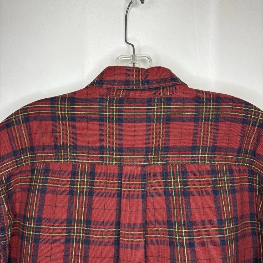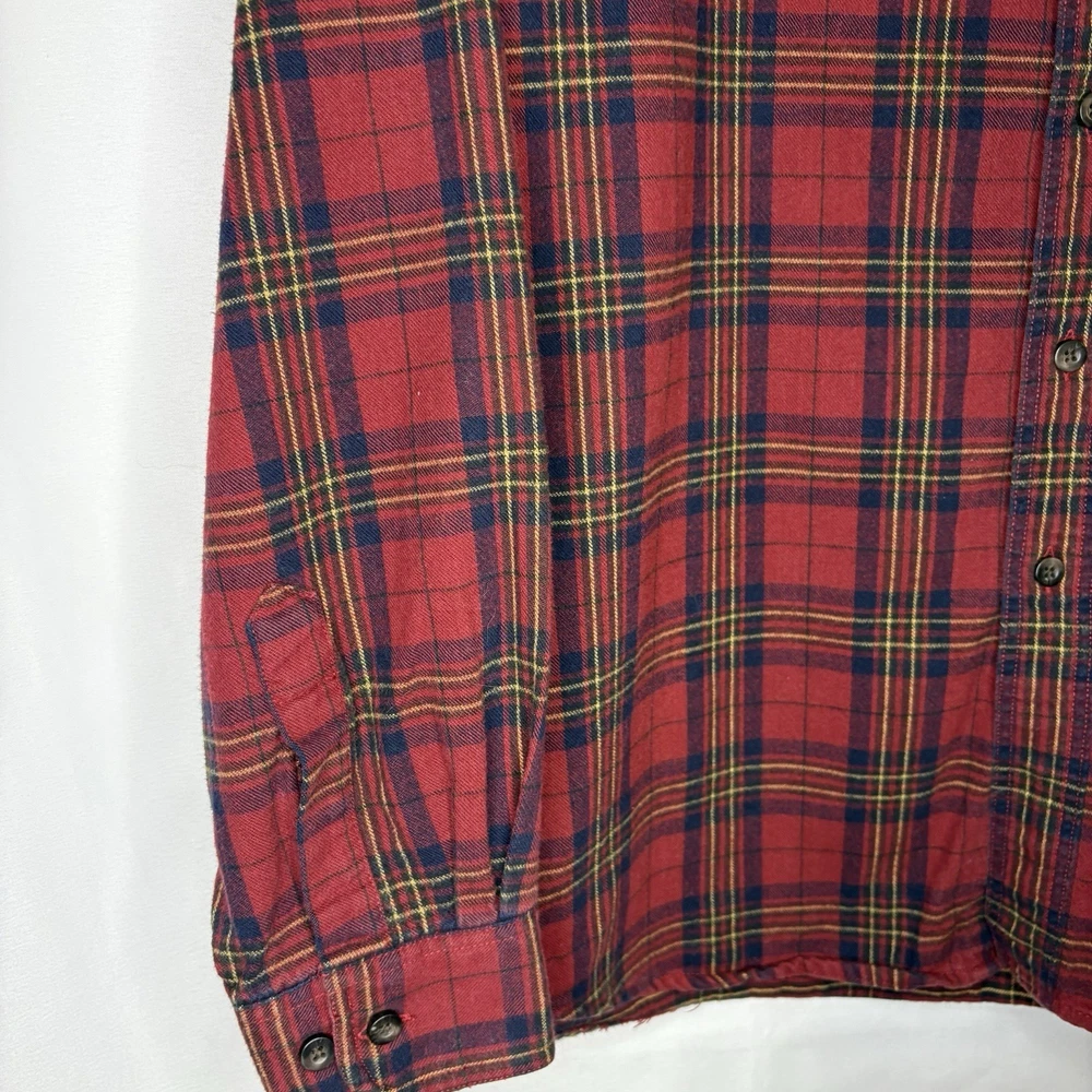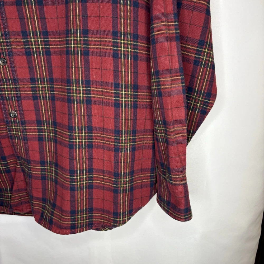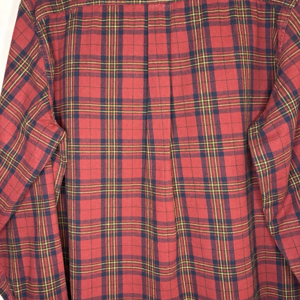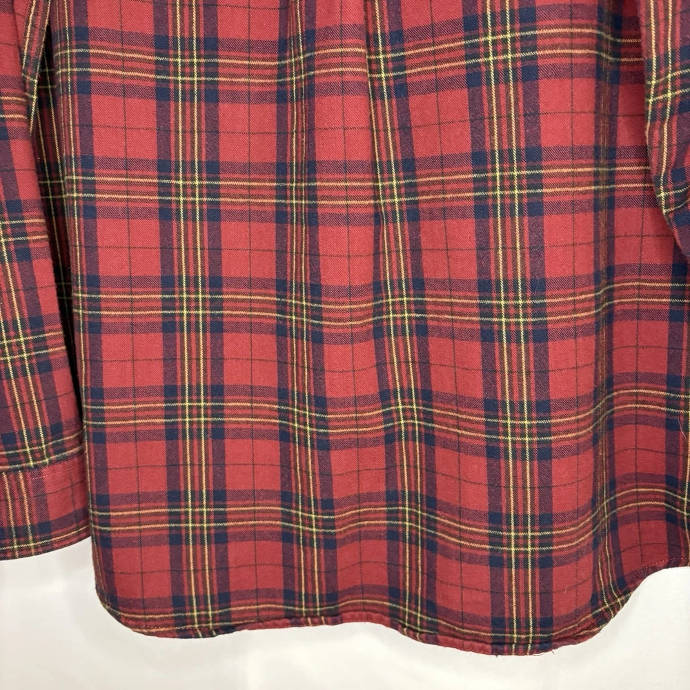 Wrap up in the warmth of this classic LL Bean Men’s Scotch Plaid Flannel Shirt, a timeless addition to your wardrobe. With its long sleeves, collared neckline, and heavy-duty cotton flannel fabric, it’s ideal for those brisk fall days, chilly winter evenings, and even cool spring mornings. The shirt features a vibrant red, navy, and yellow plaid pattern that adds a pop of color to any outfit, making it perfect for casual wear, travel, or even a smart-casual work environment. The shirt is designed for comfort and durability with a regular fit and is machine washable for easy care. It boasts a button-up closure with a stylish point collar and is accentuated with a chest pocket, ensuring your essentials are always within reach. This piece is a versatile garment that combines the rugged charm of an American workwear staple with the timeless elegance of a classic button-up shirt. Length - 30 inch/76.5 cm Chest - 44 inch/112 cm Sleeve - 25 inch/64 cm