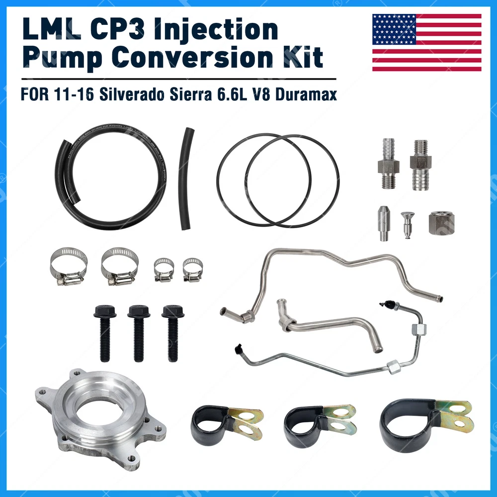 LML CP3 Injection Pump Conversion Kit FOR 11-16 Silverado Sierra 6.6L V8 Duramax Product Name: LML CP3 Injection Pump Conversion Kit FOR 11-16 Silverado Sierra 6.6L V8 Duramax Manufacturer: Doctor Diesel USA Manufacturer Part #: DD-LMLCP3 Fitment Notes: 2011-2016 LML 6.6L Duramax Diesel Improve your LML Duramax's reliability and fueling capability with a CP3 conversion. Since its introduction, the CP4 has proven to be less reliable and less capable than the CP3 used in previous Duramax platforms. Failures of the CP4 are extremely costly and require replacement of the entire fuel system. Avoid a costly failure down the road and convert your CP4 to a CP3 on the 2011-2016 LML Duramax platform. Our LML CP3 converstion kit provides you with OEM fit-and-finish features like our Doctor Diesel exclusive molded hoses for the fuel feed and return, high flow CP3 fuel fittings, and our valley feed line to support aftermarket lift pump applications. This kit does not include a CP3 injection pump. Features: · High flow CP3 feed and return fittings · Preformed fuel feed and return fuel hoses · 50-state compliant; EO# D-834-1 Kit Contents: · CP3 to rail high pressure fuel line · High flow CP3 feed and return fuel fittings · Preformed fuel feed and return fuel hoses · CP3 mounting adapter · Dosing injector distribution block, feed and return lines · Low pressure fuel feed line · Hardware kit Our "No Pump" kit for the LML CP3 conversion gives you the option to select your own CP3 pump for your application. Our kit provides you with all of the hardware you need to adapt a LBZ/LMM based Bosch CP3 to your 2011-2016 LML Duramax. Fitment: · 2011-2016 GMC Silverado/Sierra 2500/3500 6.6L LML Duramax