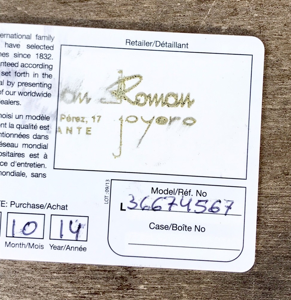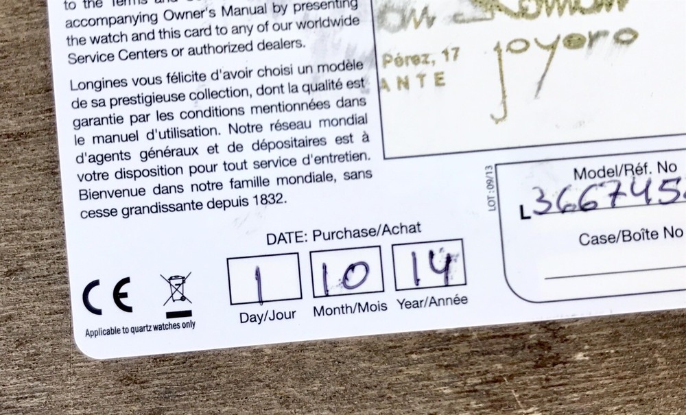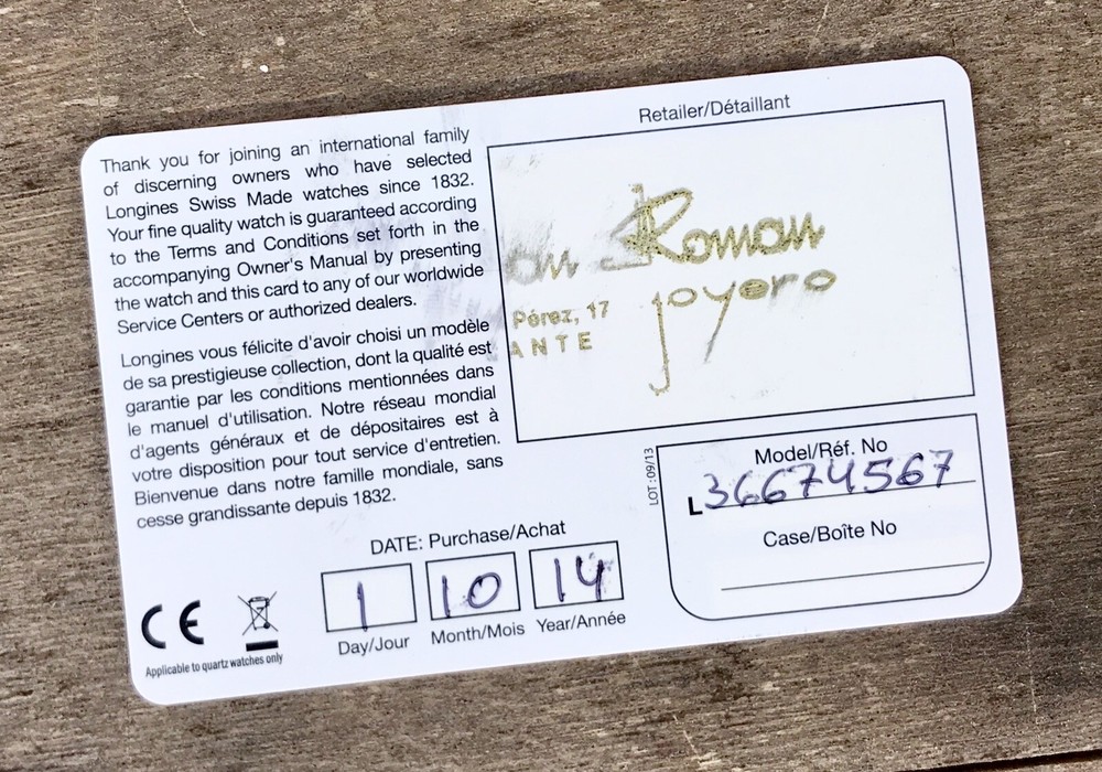 Longines Genuine Card International Warranty Measure: 8,5 x 5,5 cm Private Collection ORIGINAL ---------------------------------------------- These products are being sold for Collection purposes ONLY. I am Member of WTA since 1998 I am not affiliated with Longines . I am not an official Longines Dealer Questions : Please ask us all the questions you have before bidding. ------------------------------------------------- We sell products that might have been used or otherwise known as "take-offs". Some parts are like new or very gently used, and others show signs of wear and may need to be cleaned or polished. Please see pictures for more details. We try to take pictures of any defects the item may have. If you have any additional questions, feel free to ask us and we will get back to you as soon as possible. Customer Service If for any reason you have an issue with our product, please choose “Contact Seller” via eBay before leaving negative feedback or opening a case. We promise to resolve any issues as soon as possible. Positive feedback and 5-star seller ratings are extremely important to us as we are looking to provide outstanding products and services to our customers. Returns We reserve the right to charge a 10% restocking fee on all returns. Shipping and handling charges are not refundable. The buyer is responsible for the return shipping fee. Shipping We typically ship orders Monday through Friday (except for Holidays) within 3 business days of receipt of cleared payment. Please make sure your shipping address is correct before sending payment. All orders are shipped with a tracking number. You will receive and email with it as soon as your order ships. Please allow a few extra days for delivery if there is a weather problem. IMPORTANT NOTE FOR INTERNATIONAL BUYERS All our goods are shipped from Spain, but we are a UK based eBay shop, sales to the European community might be subject to VAT. Please see the link below: VAT on eBay purchases for EU buyers | eBay.com BUYERS OUTSIDE THE EUROPEAN UNION: The tariffs, duties and import taxes are not included in item price or shipping charges. These charges are the responsibility of the buyer. Refer to the customs authorities of your country to inquire about these costs before bidding on an item or buying it. These fees are usually charged by the carrier or when the buyer takes the item and should not be confused with additional shipping costs.