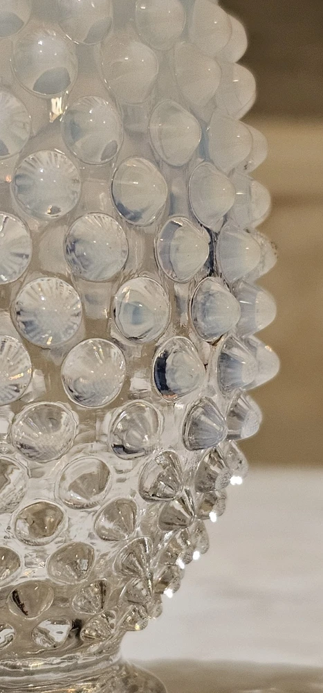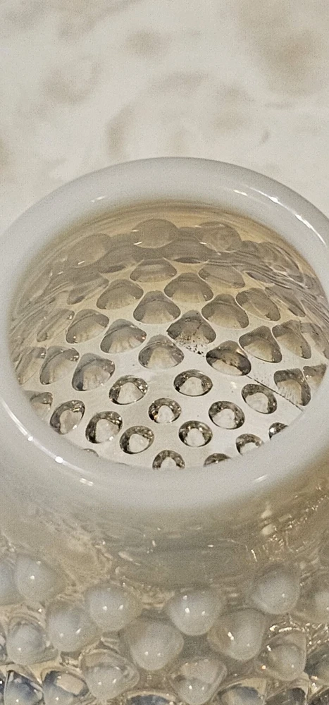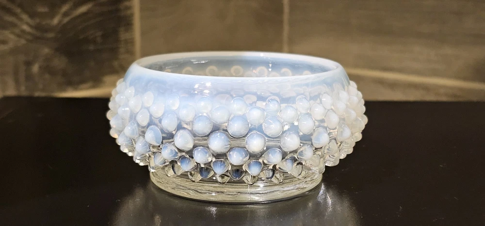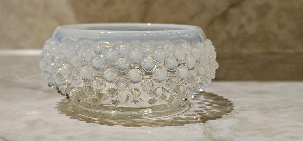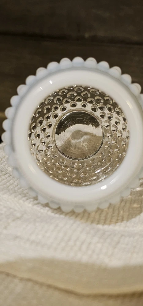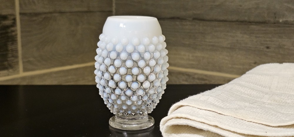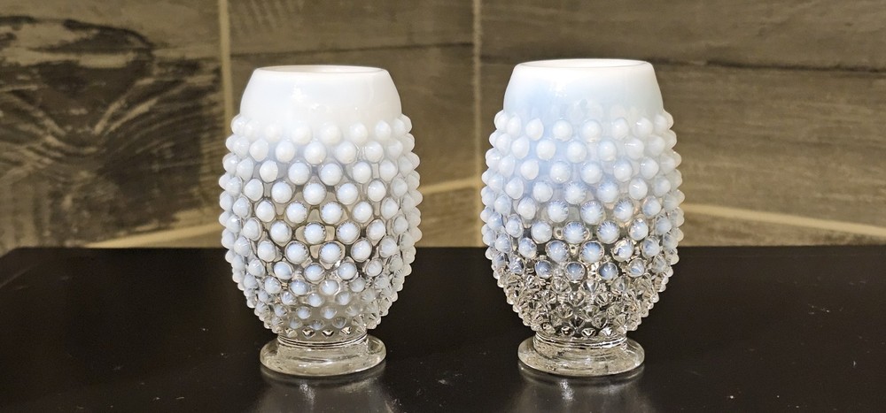 Here are 2 Fenton French Opalescent Hobnail Mini vases and 1 Fenton Opalescent Dish. All are crafted from luxurious opalescent glass. From the 1940s, they have a classic elegance with the intricate hobnail (bumps) design. The crisp white hue and light blue provide a versatile match to any decor. They look like they glow, especiallyunderuv or blacklights. All 3 glass pieces are in perfect condition. That's how they'll arrive. No chips, cracks or scratches. Functional or for display, they match 2 other Perfume Bottles I recently posted. Please see pictures for details and condition. Items will be packaged with care and shipped within 1 day after receiving payment. Thanks for stopping by and looking!