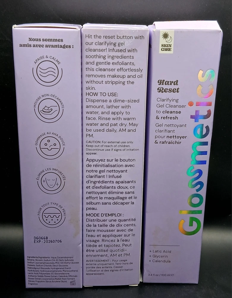 Glossmetics Hard Reset Clarifying Gel Face Cleanser Short Description: Achieve a clean and refreshed complexion with Glossmetics Hard Reset Clarifying Gel Face Cleanser. This hydrating makeup remover is specially formulated for normal to combination dry skin, featuring a blend of calendula, lactic acid, and glycerin to cleanse, hydrate, and soothe your skin. Key Features: Clarifying Cleanser: Effectively removes makeup, dirt, and impurities without stripping the skin. Hydrating Formula: Infused with glycerin to provide moisture and prevent dryness. Gentle Exfoliation: Contains lactic acid to gently exfoliate dead skin cells, promoting a smooth and radiant complexion. Soothing Ingredients: Calendula extract helps calm and soothe the skin, reducing redness and irritation. Suitable for Normal to Combination Dry Skin: Specifically designed to meet the needs of normal to combination dry skin types.Ingredients: Active Ingredients: Calendula Extract, Lactic Acid, Glycerin Other Ingredients: Water (Aqua), Cocamidopropyl Betaine, Sodium Lauroyl Sarcosinate, Acrylates Copolymer, Sodium Chloride, Phenoxyethanol, Ethylhexylglycerin, Fragrance (Parfum), Disodium EDTA. Warnings: For External Use Only: Avoid contact with eyes. If contact occurs, rinse thoroughly with water. Patch Test Recommended: Before first use, perform a patch test to check for any adverse reactions. Discontinue Use if Irritation Occurs: If you experience irritation or discomfort, stop using the product and consult a healthcare professional if necessary. Keep Out of Reach of Children: Ensure this product is kept out of the reach of children. 3-Pk GLOSSMETICS HARD RESET Clarifying Gel Cleanser Glycerin 3.4 OZ NEW In Box.