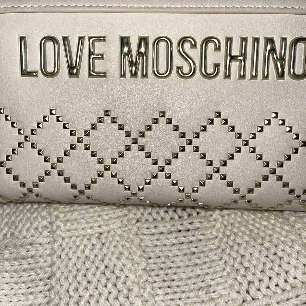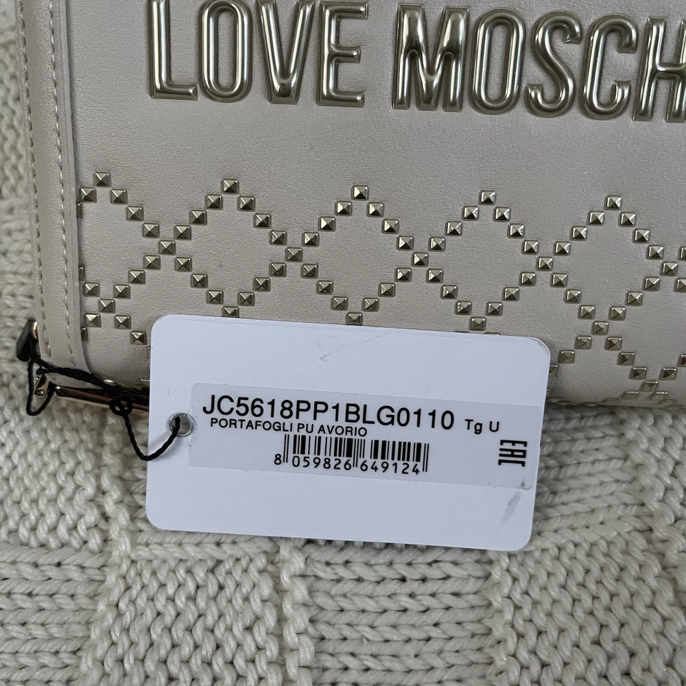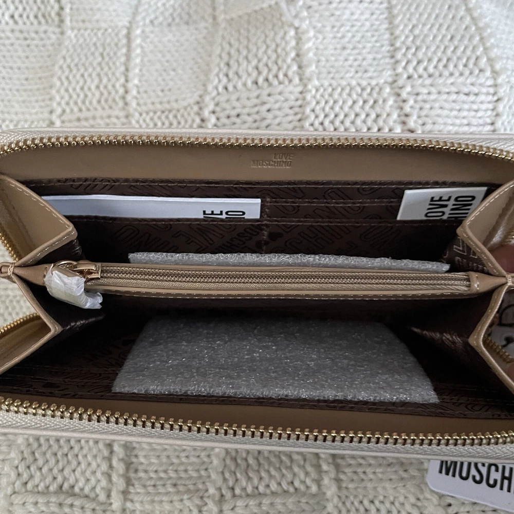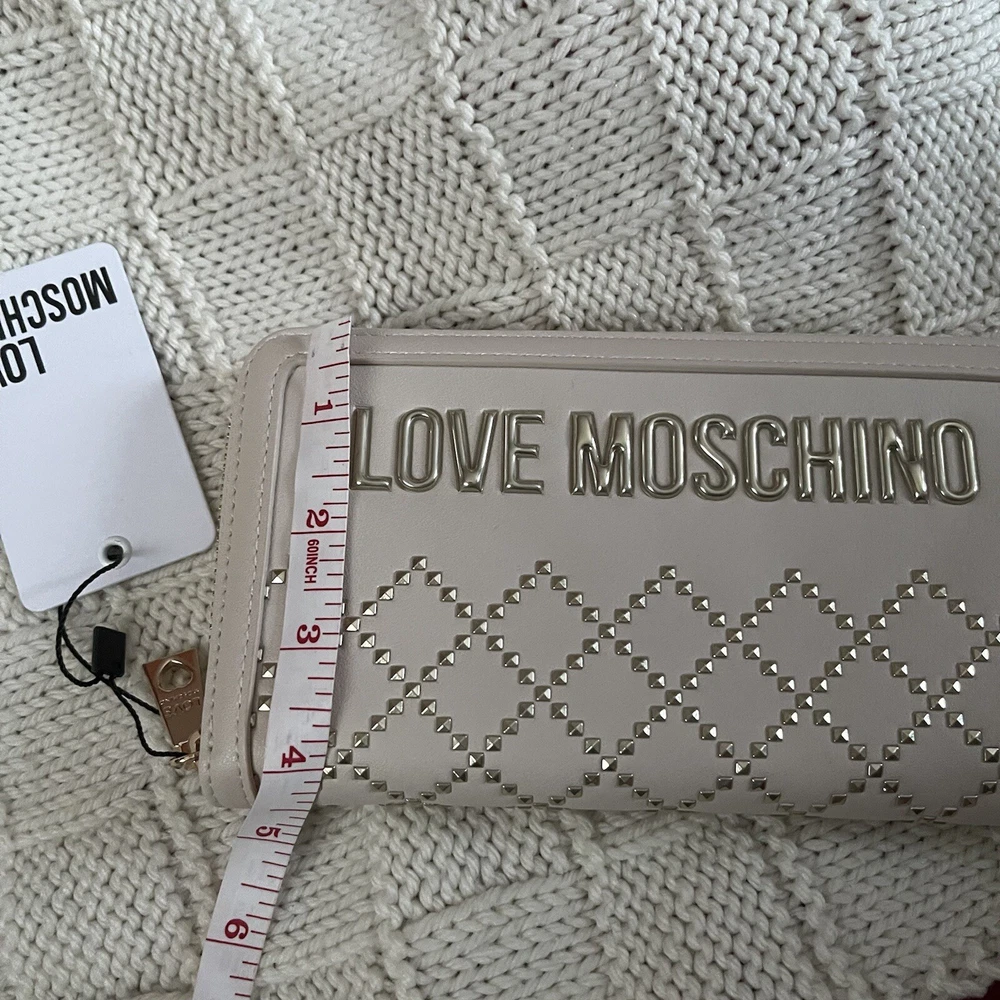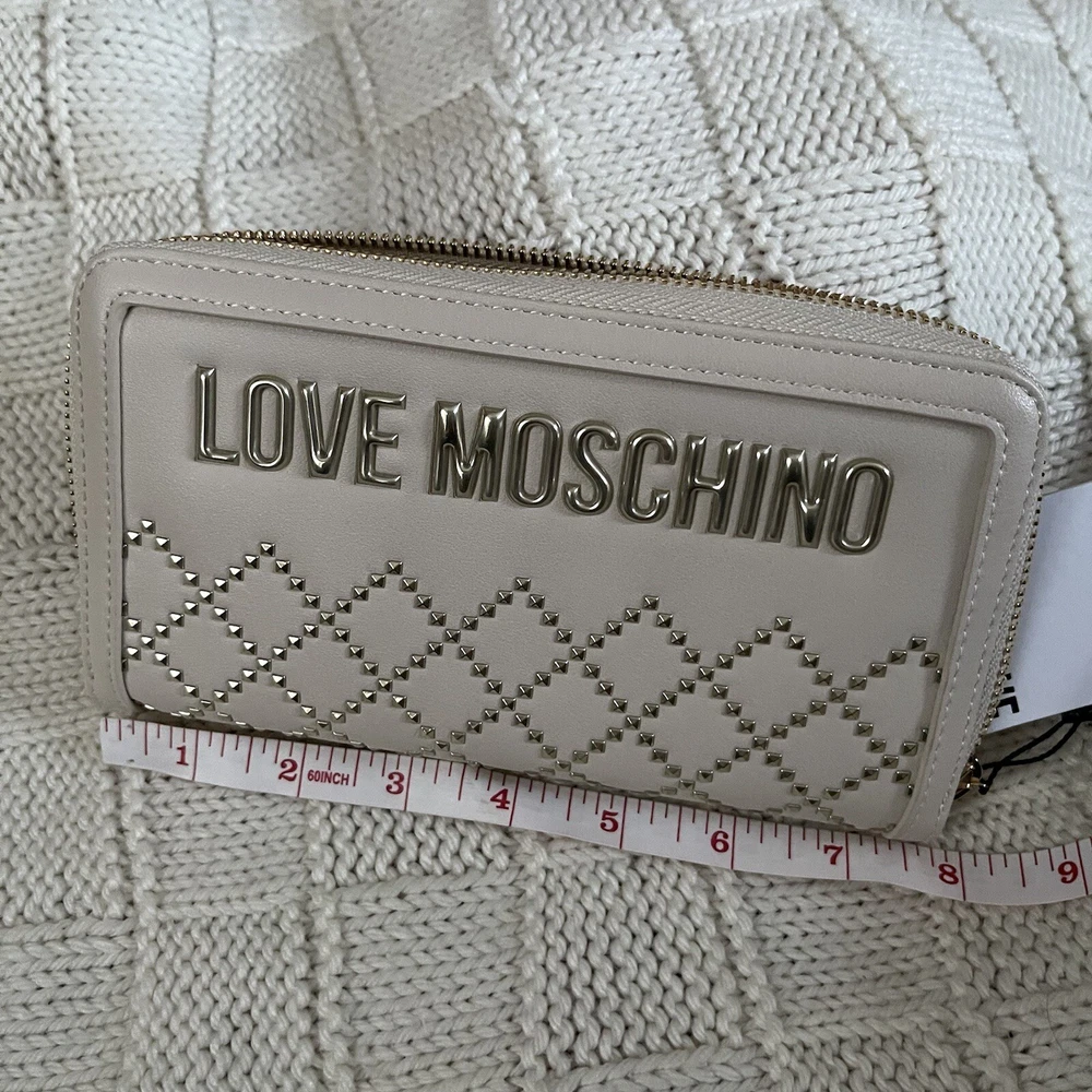 Love Moschino Wallet Main compartment with zip top closure Multiple bill compartments and slip-in card slot Attached inner zipper coin slot Contrast Love Moschino signature branding Comes packed in a branded box