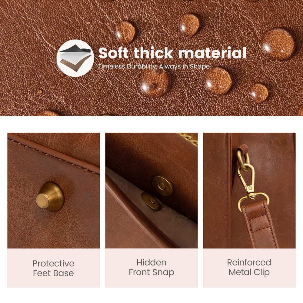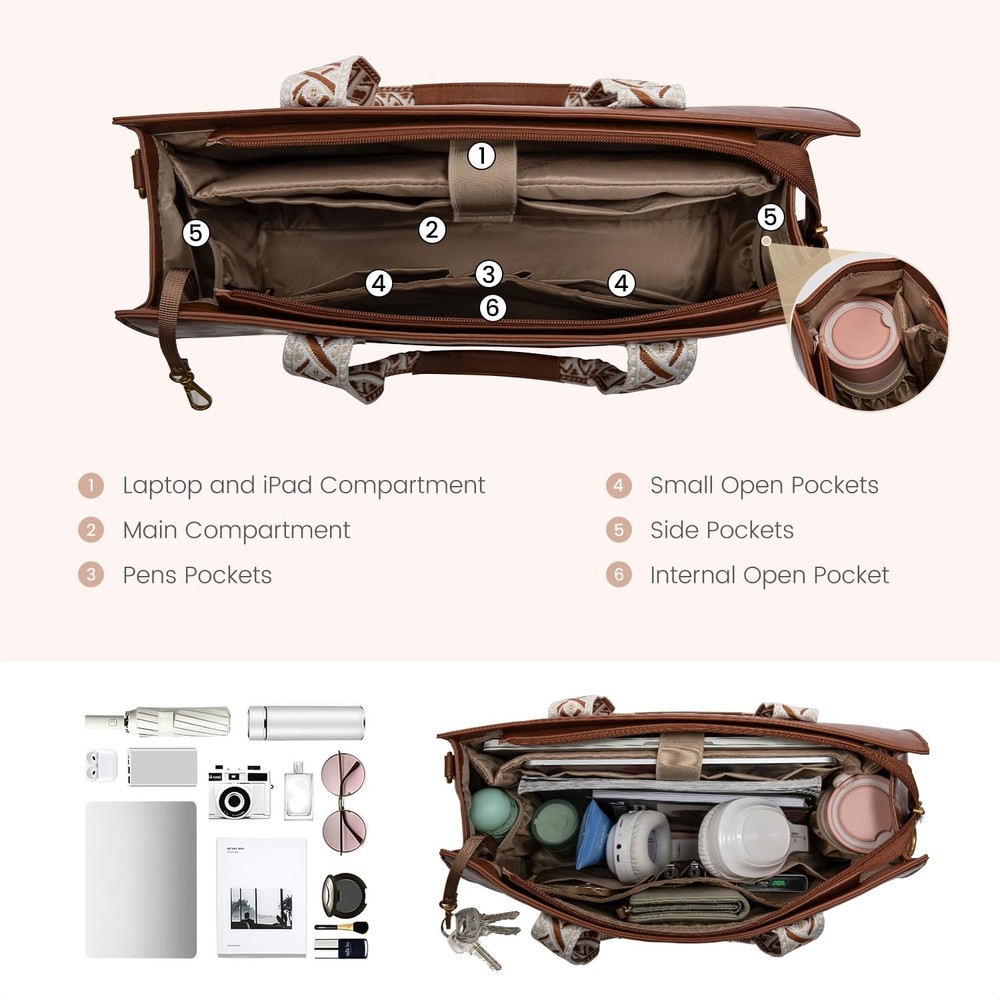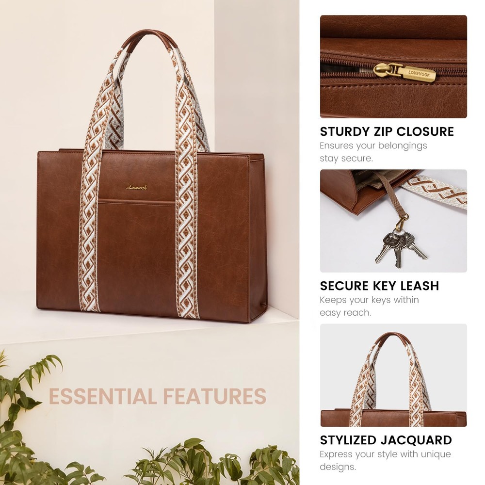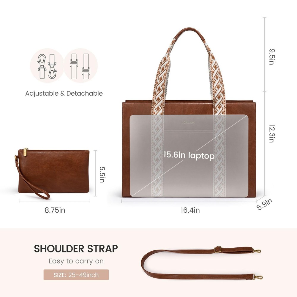 LOVEVOOK Laptop Tote Bag for Women,15.6 Inch Vintage Work 15.6 Inch, Brown-a Description Features: Perfect Size Women's Briefcase: Measuring 16.4" L x 5.9" W x 12.3" H and weighing just 2.67 lbs, this women's computer tote bag combines style and utility. It features adjustable shoulder straps and a secure top zipper. Included is a 8.7" L x 7.3" H pouch for coins, cosmetics, passports, and phones. Versatile in function, it serves as a ladies' briefcase, teacher tote bag, computer bag, or crossbody work bag. Premium Durable Material Laptop Bag: Designed with four layers of thick, soft leather and a high-density nylon lining for exceptional durability and shape retention. The high-performance artificial leather resists stains, water, and scratches, preventing stiffness and creases. Multi-pocket Work Tote: This women's work bag offers 11 pockets, including padded sections for electronics and space for a water bottle. It accommodates a 15.6-inch laptop, iPad, files, books, and clothes. Designed to be more versatile than other laptop totes, it's perfect for long office hours and business trips. Convertible & Chic Practical Tote Bag: Featuring an additional zip closure and front pocket, this bag ensures your items are easily accessible and secure. A retractable keychain hook helps you grab your keys effortlessly. Four metal feet protect your bag from damage. Stylish computer bags for women: With unique style, This attractive and vintage fashionable computer bags for laptops for women is ideal for daily use at office, shopping, college, business trip, work, weekends, travel, etc. A fabulous gift for women, teacher,girlfriend on birthdays, Valentine's Day, and more. Product Details: Handling We will ship all orders within 3 business day of payment. Delivery We Do Not Ship Outside of the Continental US. Return Policy All items qualify for returns within 30 days of receipt. Buyer is responsible for return shipping on any item that is not damaged. Feedback We take our reputation seriously, we buy and sell online, so we understand the value of trust. If you are unsatisfied with your order, please contact us and we will work with you to resolve it to your satisfaction.