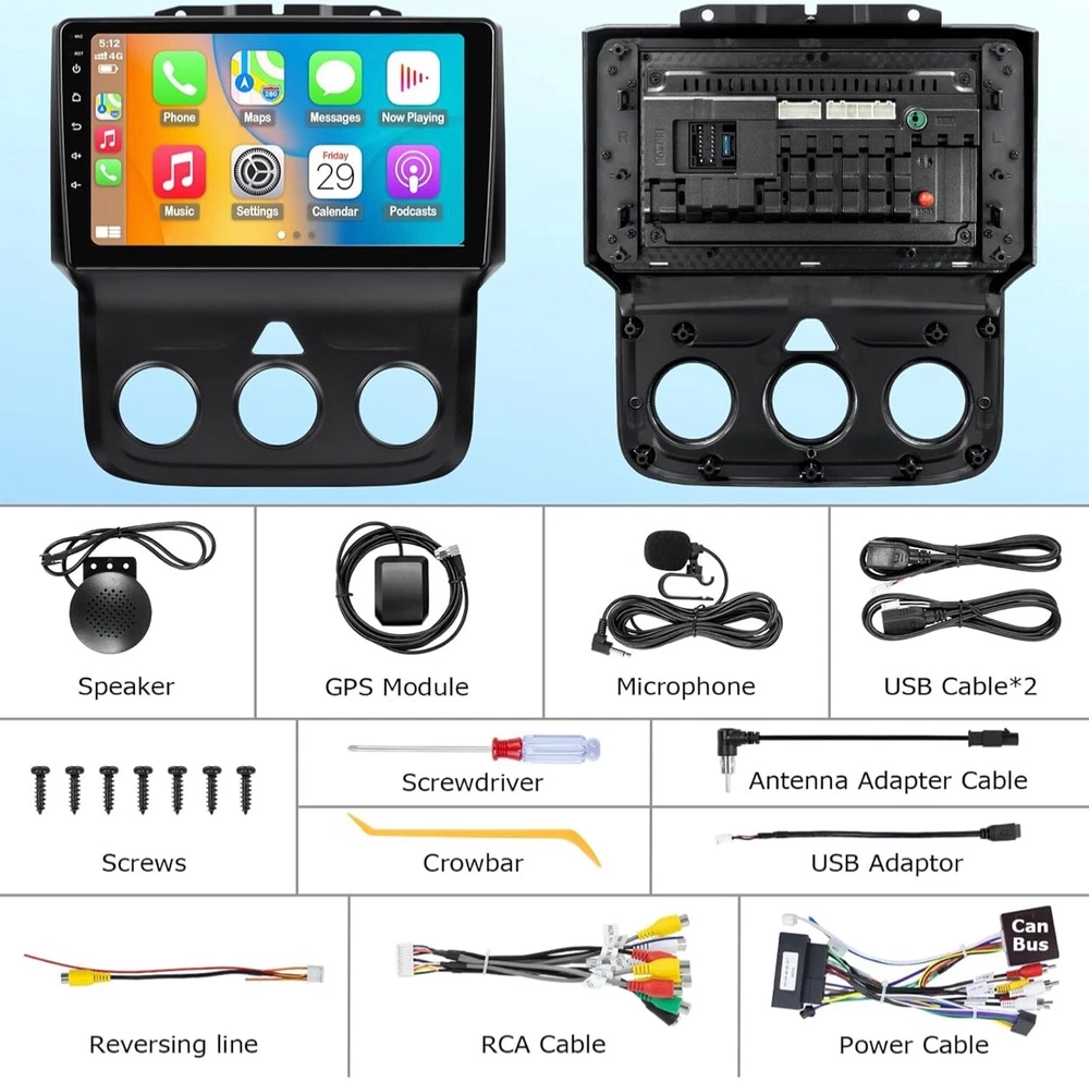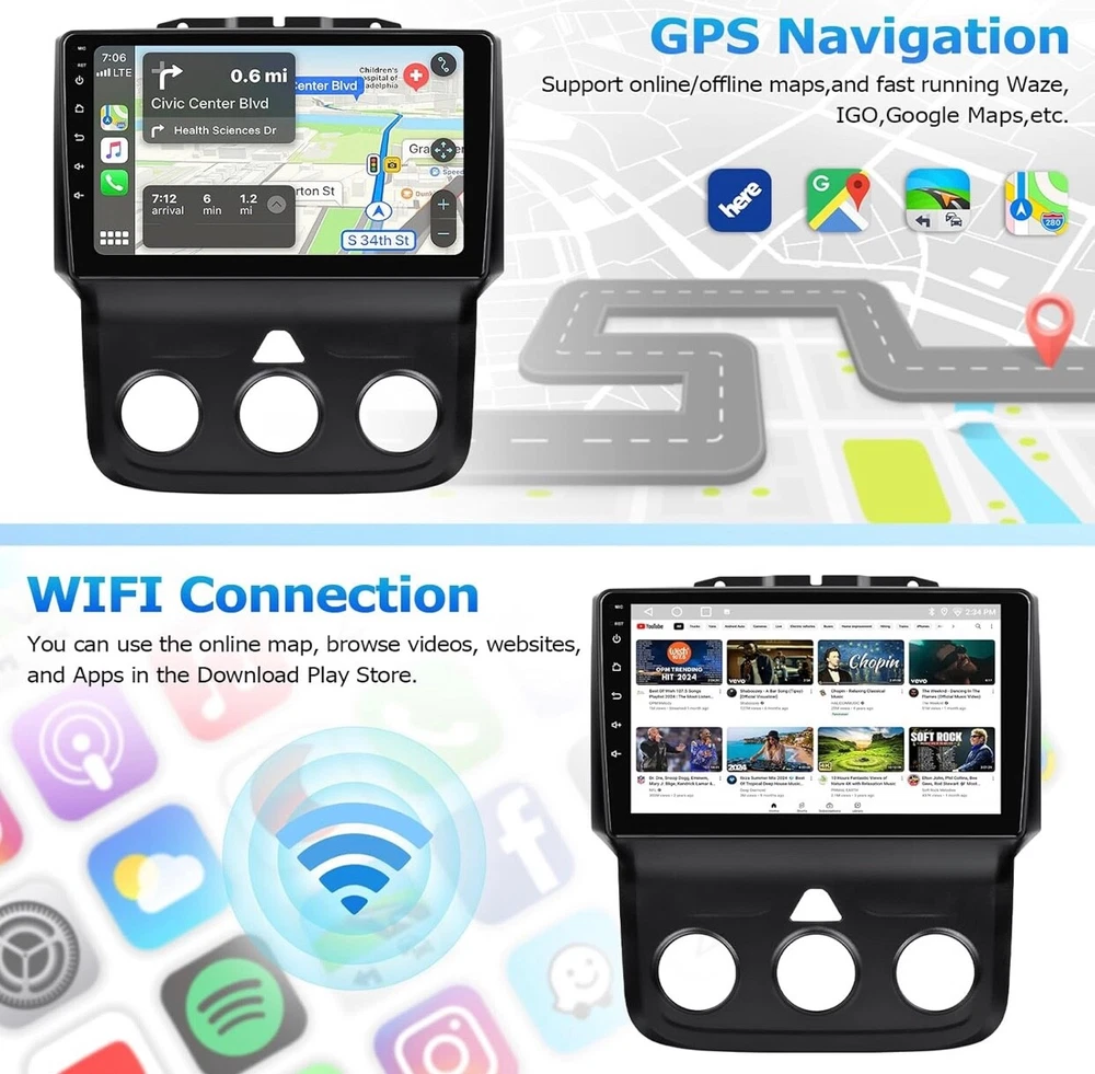 #1140 2+64G Car Radio for Dodge Ram 1500 2500 3500 2013 2014 2015 2016 2017 2018 Built in CarPlay Android Auto, 9 Inch Touch Screen Stereo Replacement, Support GPS BT FM DSP WiFi(Only fit Manual AC) Brand: LOVPOI Vehicle Service Type: Car Screen Size: 9 Inches Special Feature: Touchscreen, Bluetooth, Lane Assist Connectivity Technology: Bluetooth, Wi-Fi, USB 【 Applicable Car Models 】 Car Radio for Dodge Ram 1500 2500 3500 2013 2014 2015 2016 2017 2018 (only fit Manual AC). Please check the year, dimensions, and shape of the center console of your vehicles before purchasing. 【 Built in Carplay & Android Auto 】 LOVPOI car stereo for Dodge ram 1500 2500 3500 2013-2018 is compatible with wireless CarPlay and Android Auto. Simply connect your iPhone or Android phone to the Android 13 Dodge ram radio via Bluetooth, Easily access your phone to navigate, make calls, play music, or other apps via Siri/Google controls. Enjoy a more seamless and convenient in your car. 【 High Configuration 】 Featuring the Android 13 operation system with 9 inch 1920*1080 high-resolution touch screen, offers you a clear visual experience. Built-in 2GB RAM & 64GB ROM, high performance & low power consumption ensure the Dodge Ram radio runs smoothly. 【 GPS Map & WiFi Connect 】 Built-in GPS module, support online/offline navigation apps on Google Play Store via WiFi function. Use updated data in the navigation app to make driving easier and safer. Car radio can install or remove apps from the app store just like a smartphone, such as YouTube, Facebook, Maps, and more. 【 Bluetooth/FM Radio 】 This Dodge Ram stereo stays connected with Bluetooth for hands-free calls and wireless music streaming. You will not be distracted while driving, making the journey safer. Also, tune into your favorite radio stations with crystal-clear FM audio. 【 Other Functions 】 ① Built-in DSP 16-band EQ adjust, Support HiFi sound. Can be tuned into your favorite music sound modes, like Pop, Rock, Jazz, Classical, Flat, User, or Voice; ②Split-Screen Mode; ③SWC function; ④Mirror Link Function; ⑤RCA out; ⑥Customize UI interface, etc. What's in the box Touch Screen Radio,Dash kit,Installation Harness