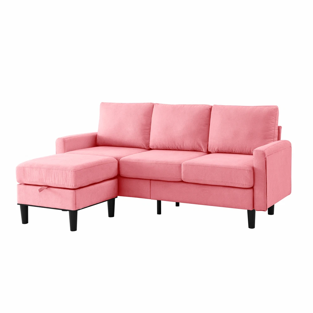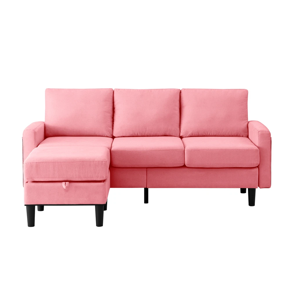 This L-shaped sectional is a game-changer for small spaces! The pink fabric adds a fun pop of color, while the storage ottoman is super practical. The seat cushions have great bounce from the spring filling, making it both supportive and cozy. Perfect for apartments with its compact size yet spacious seating. Love how the reversible design lets you customize the layout!