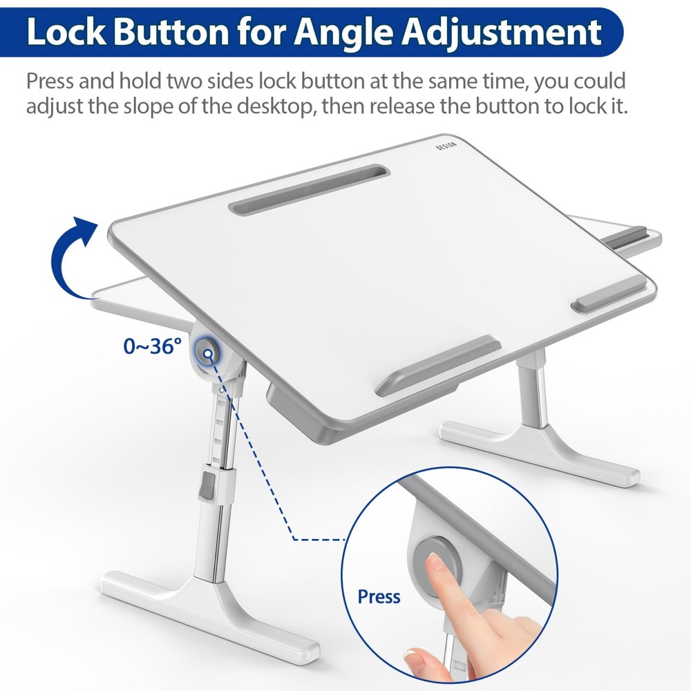 LT05 Adjustable Laptop Table, Portable Standing Bed Desk, Foldable Sofa Breakfast Tray, Notebook Computer Stand for Reading and Writing Height Adjustment Easy Adjustable 5 Height Positions from 9.4” to 12.6”. Pull up--Pull out the table footing to your desired height and it will be locked automatically without taking any further action. Pull down-- Press the lock button and press the table gently to the desired height, then release the lock button, it will be locked automatically. Angle Adjustable 0°-36° angle adjusting without a pause. Hold and press the two sides lock button at the same time, you can easily adjust the slope of desktop; adjust to the appropriate slope, then release the two side lock button to lock it down. Easy Carry and Storage Retractable legs could fold below the table for easy storage and carry. You could use it anywhere in your home or office. Anti-slip Baffles for laptop and mouse Laptop baffle could stop the laptop to be slided when you use the table in different angles during operation. Mouse baffle provides a comfortable support when you use it with mouse. Tablet Groove & Storage Drawer Built-in stand groove for supporting tablets and smart phones, and a storage drawer for pens and glasses. Specification: Size: 20.8”x11.8”x0.35” (530x300x9mm) Height Adjustment: 9.4” to 12.6” Tilt Angle: 0° to 36° Loading Weight: Up to 77 lbs (35kgs) Support: Up to 17” Laptop Wide compatibility & Tablet Groove & Storage Drawer: LT05 Laptop table is 20.8”x11.8”x0.35” (530x300x9mm) of size which fits for 17” or larger laptop with space for a mouse. Built-in stand groove for supporting tablets and smart phones, and a storage drawer for pens and glasses. Multiple Uses: This multifunctional table will be a perfect addition to your office or home. You could use it on bed, couch/sofa, desktop and floor. A snack tray for watching TV, a laptop stand for relaxing in bed or a standing table for office or home work. Angle Adjustable: 0°-36° angle adjusting without a pause. Hold and press the two sides lock button at the same time, you can easily adjust the slope of desktop; adjust to the appropriate slope, then release the two side lock button to lock it down. Height Adjustable: Easy Adjustable 5 Height Positions from 9.4” to 12.6”. Simply press the lock button and pull the table leg gently to the desired height. Then release the lock button, it will be locked automatically. Portable: Retractable legs could fold below the table for easy storage and carry. You could use it anywhere in your home or office.